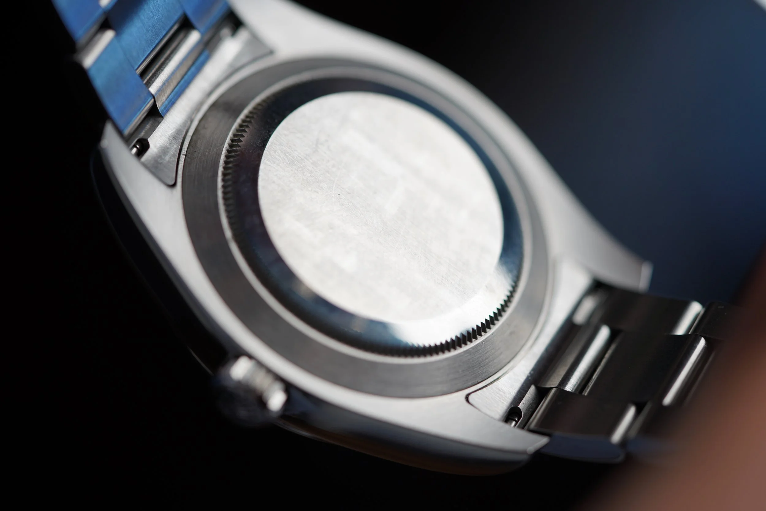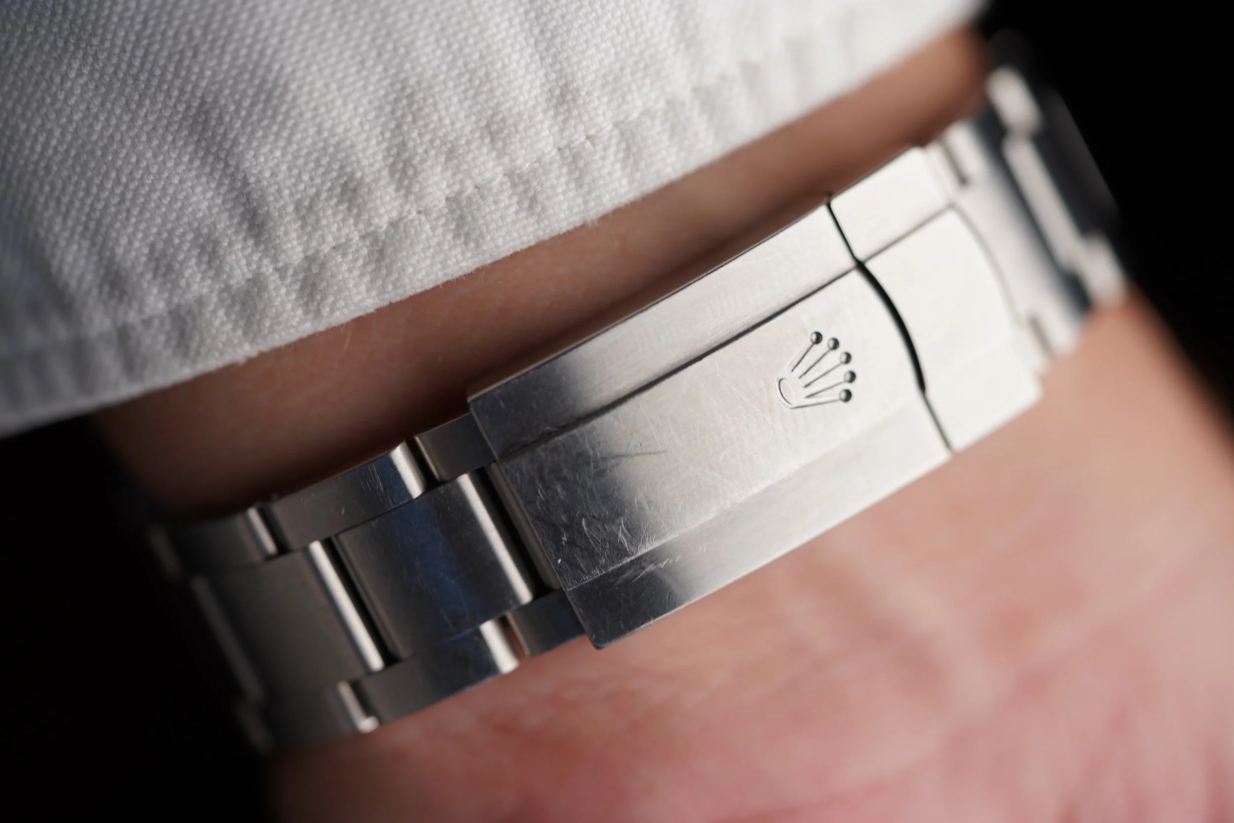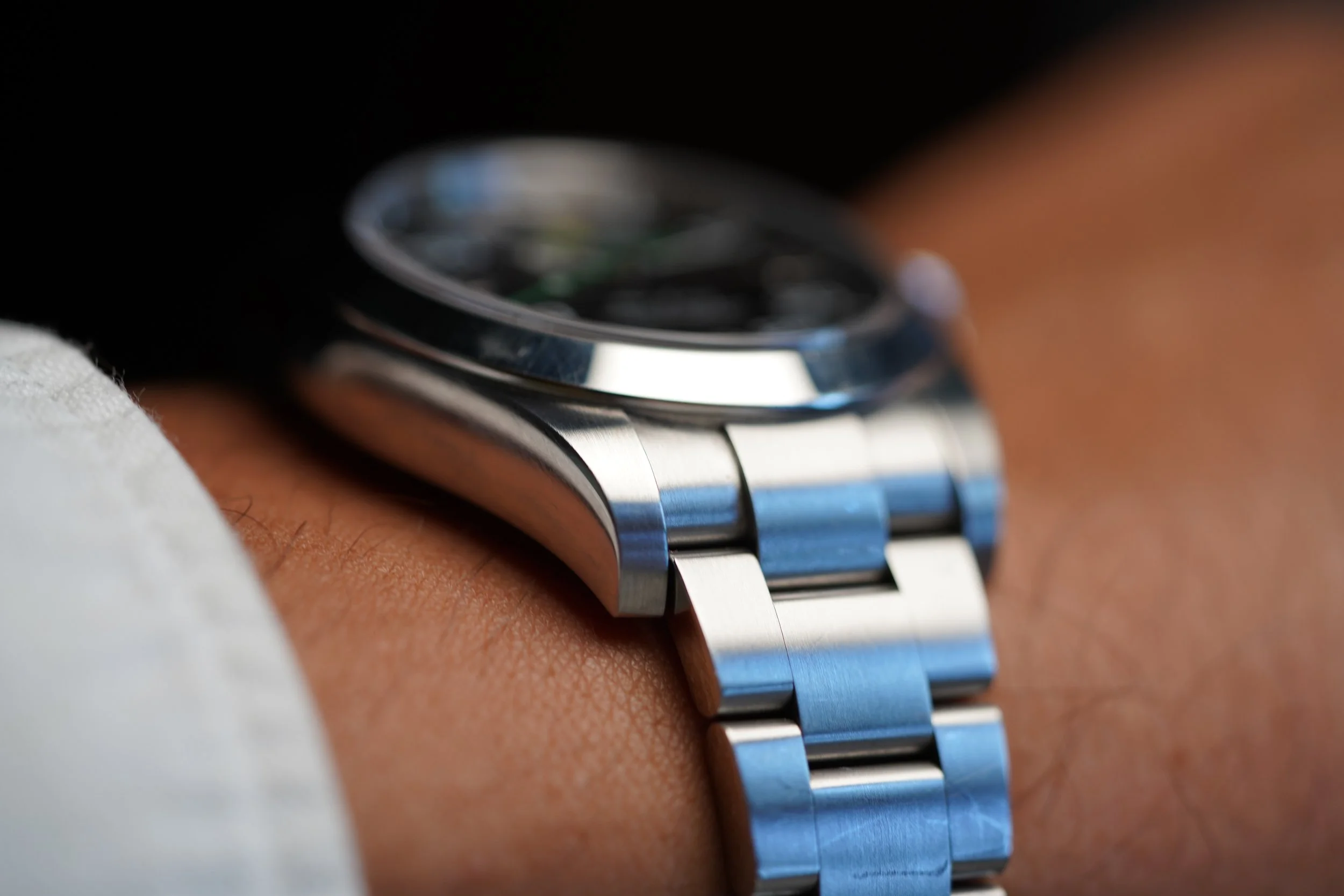 This Rolex Air-King reference 116900 is a great modern watch. The case is unpolished a measures 40mm in diameter. The dial features pronounced numerals at 3, 6 and 9 and features the highly attractive green “Rolex” print. It was sold in 2018.
