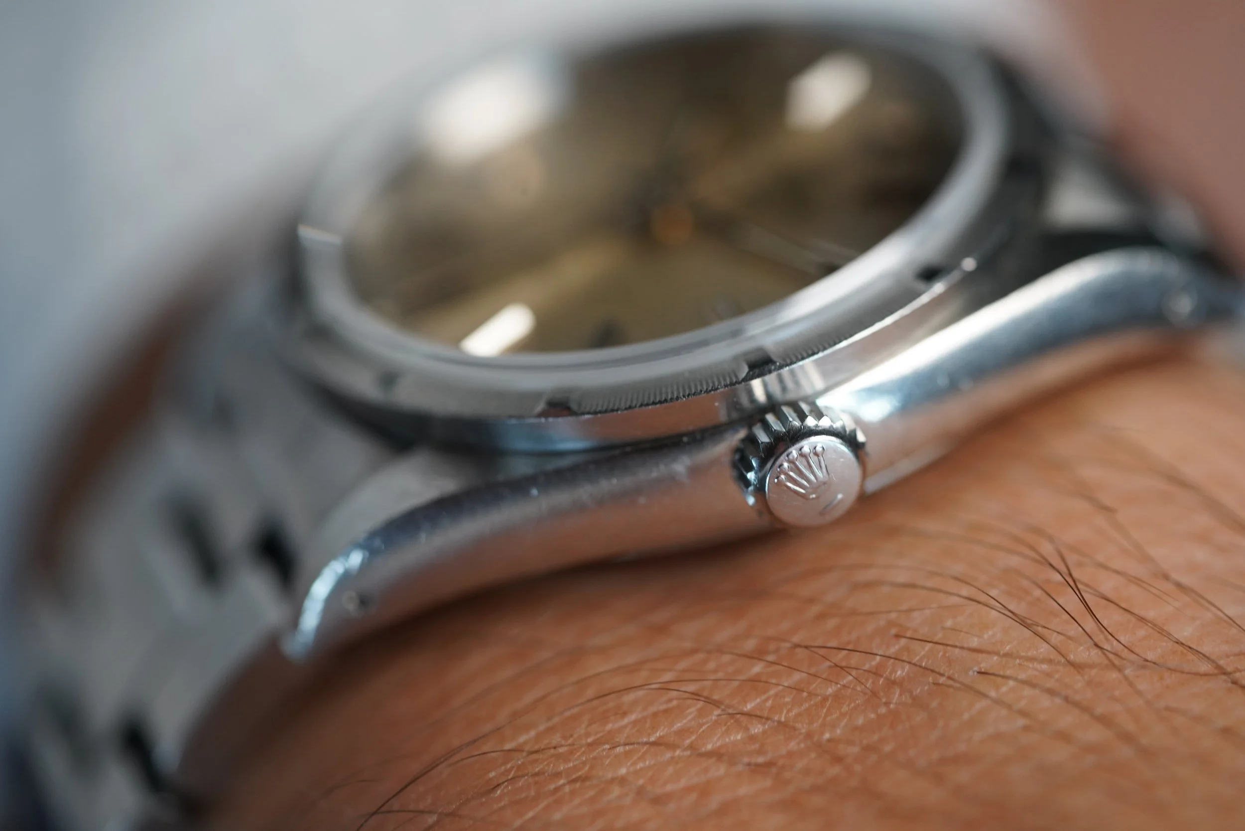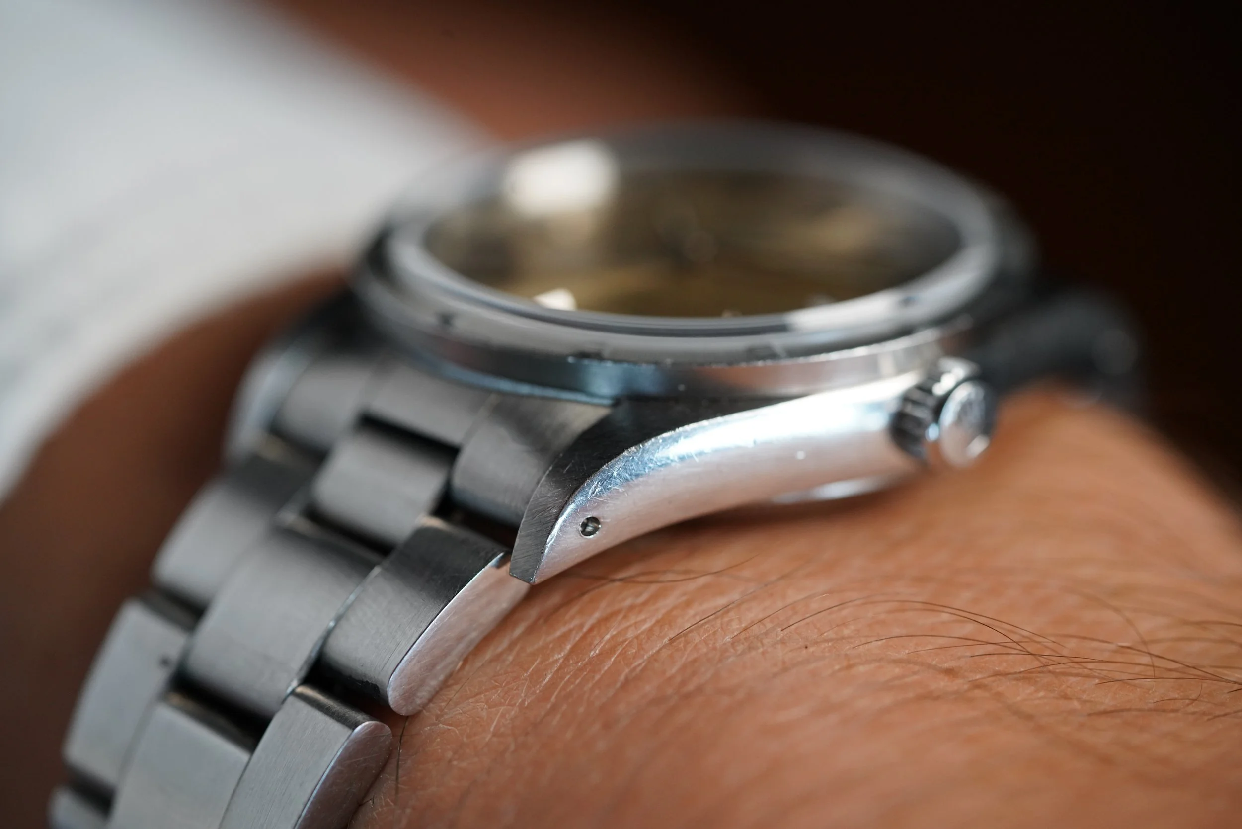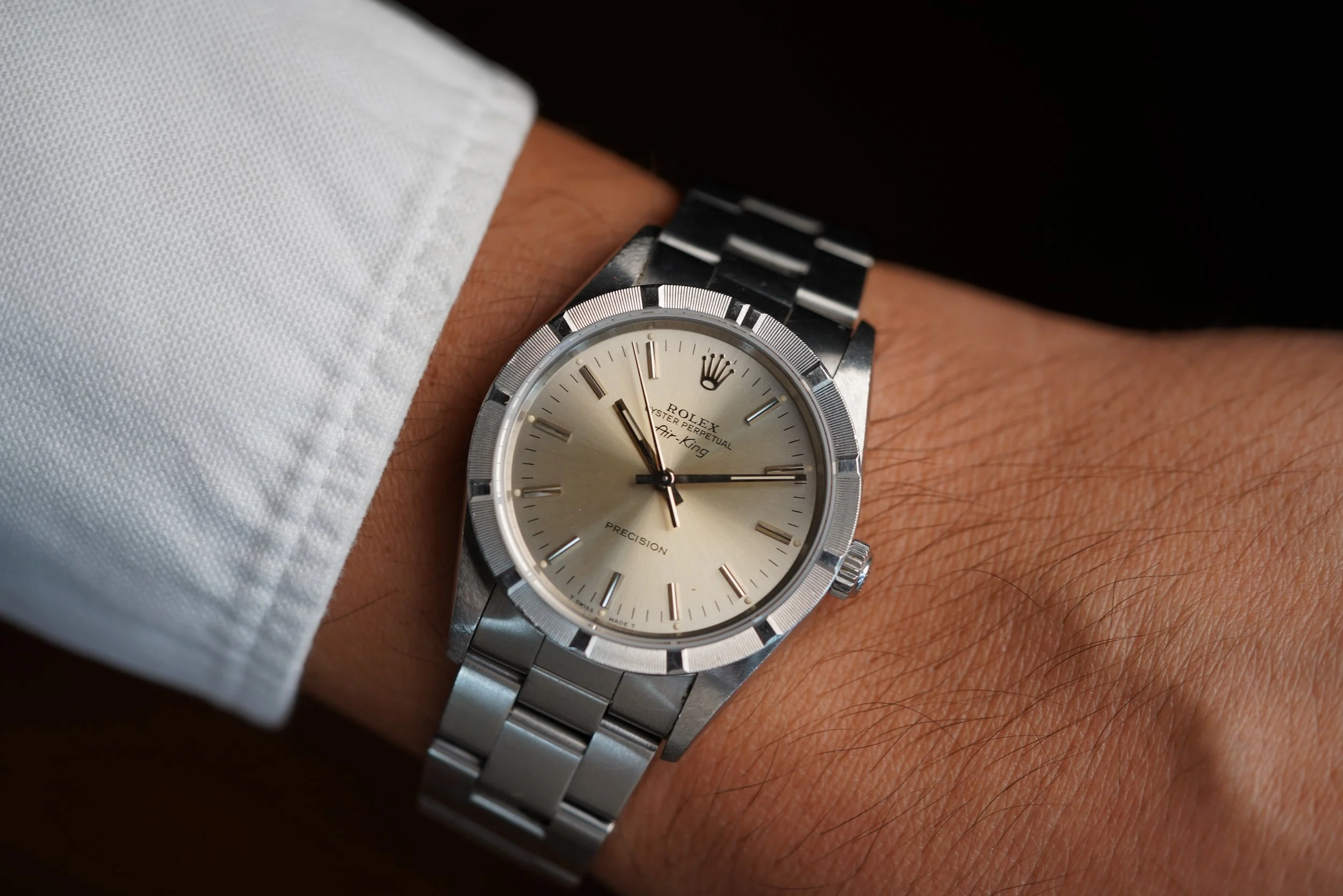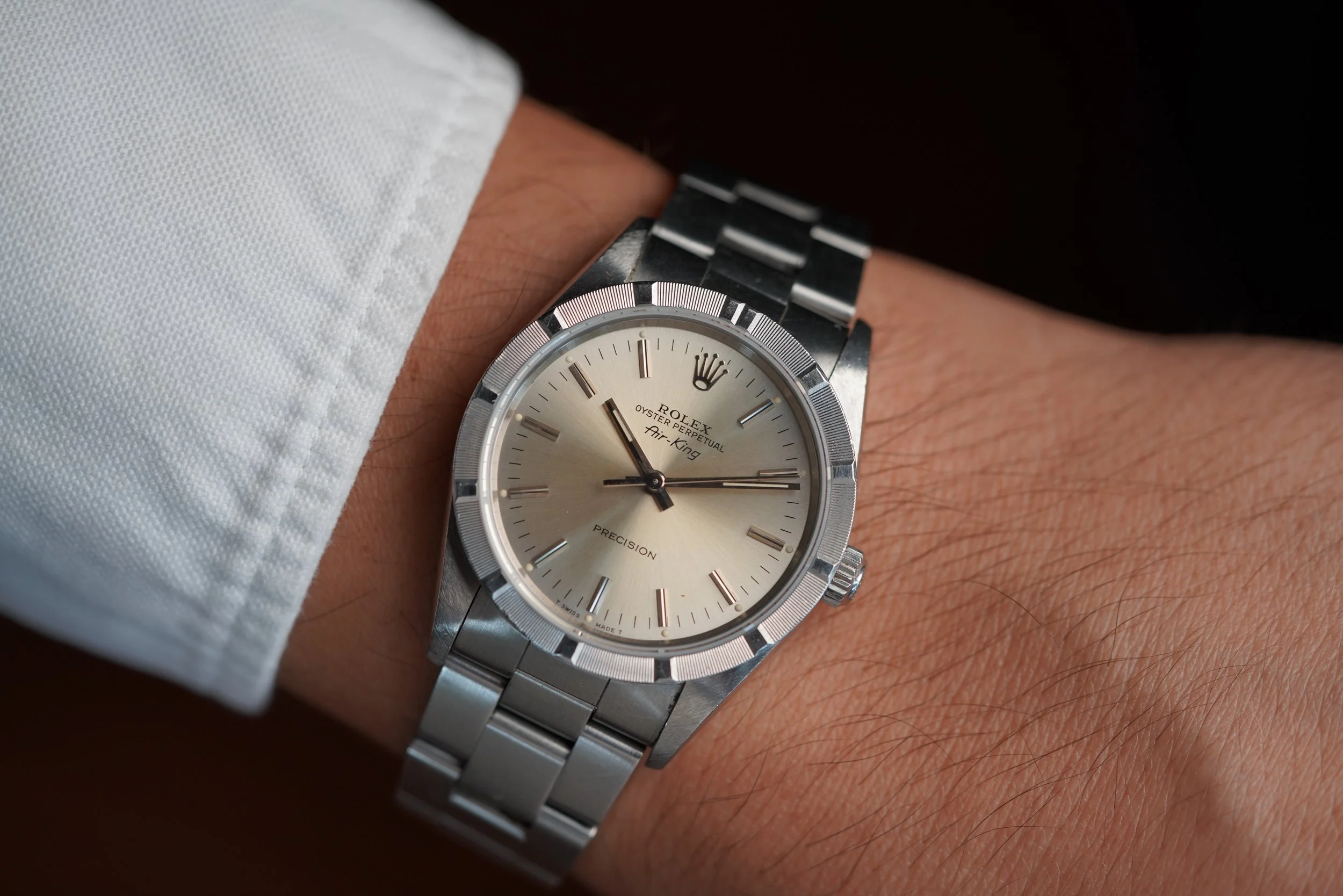 This Rolex Air-King reference 14010 is a very attractive timepiece. The watch is slightly over 34mm in diameter (with a lug-to-lug length of 43mm). The lug width is 19mm and the height is slightly lower at around 11.5mm including the crystal. The case appears to be unpolished.