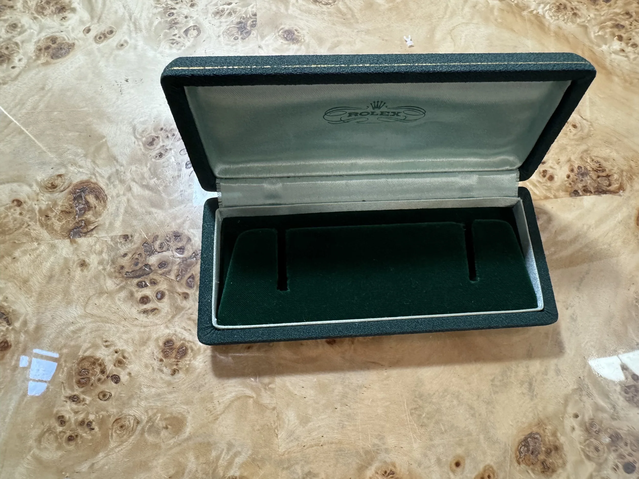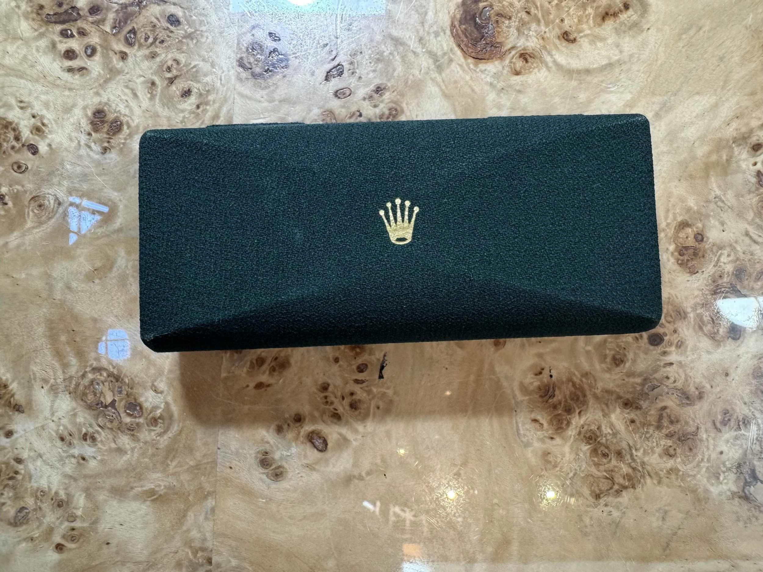 The watch comes with the original box. It does not come with papers. We do not know the service history, but it is running well.