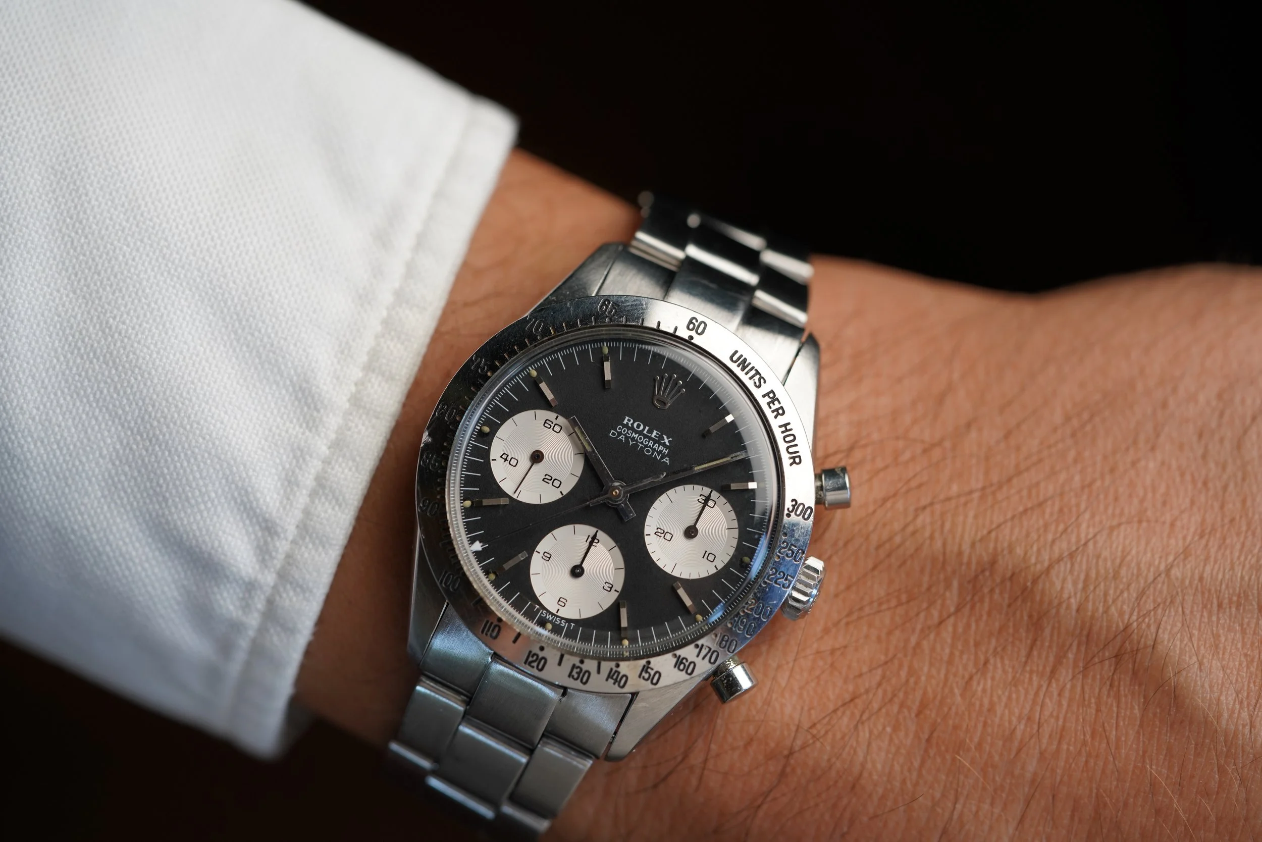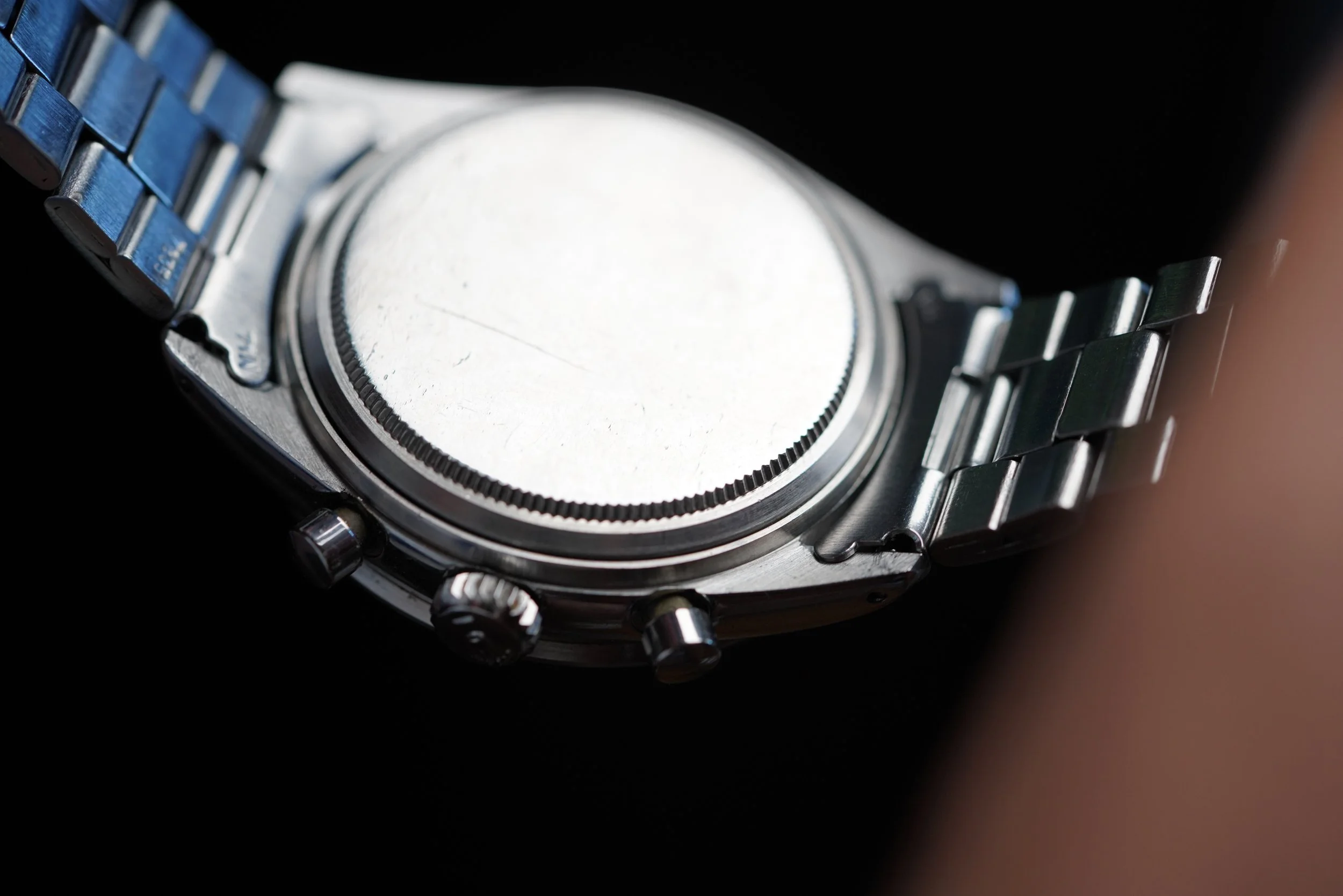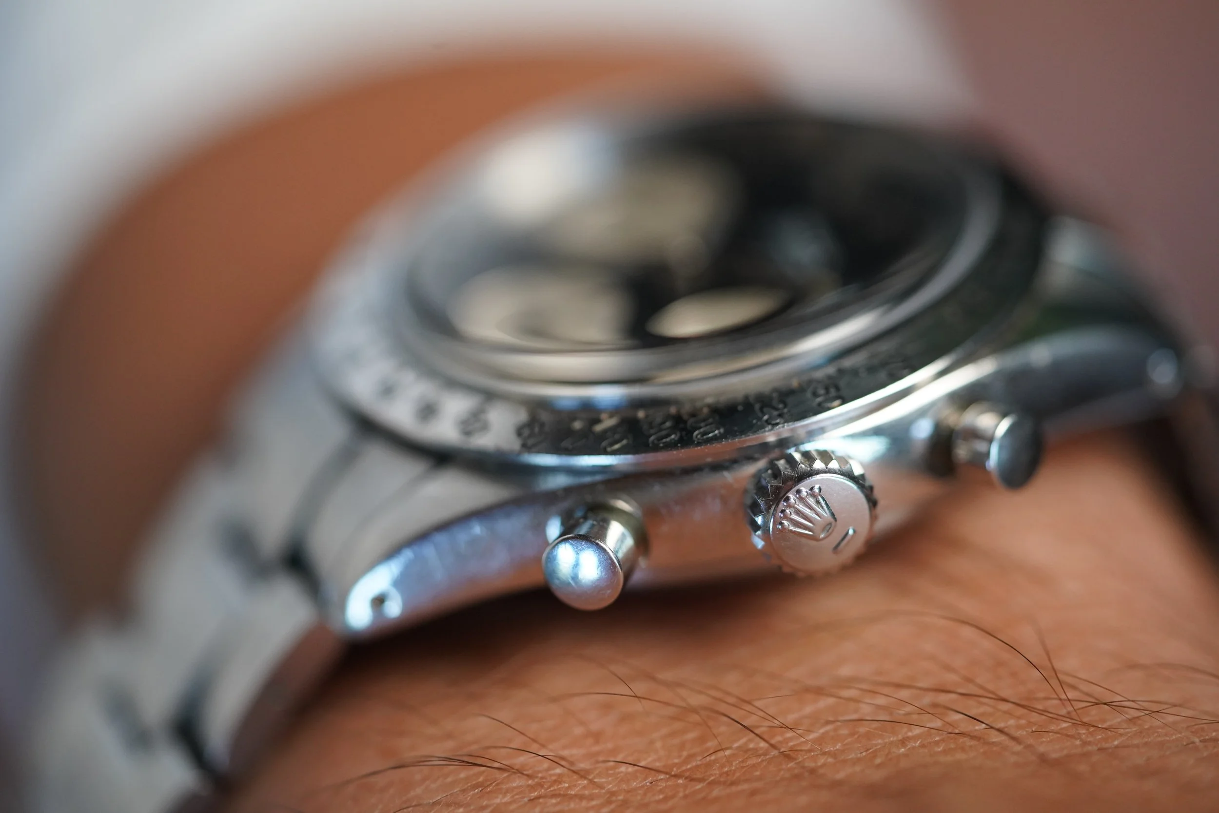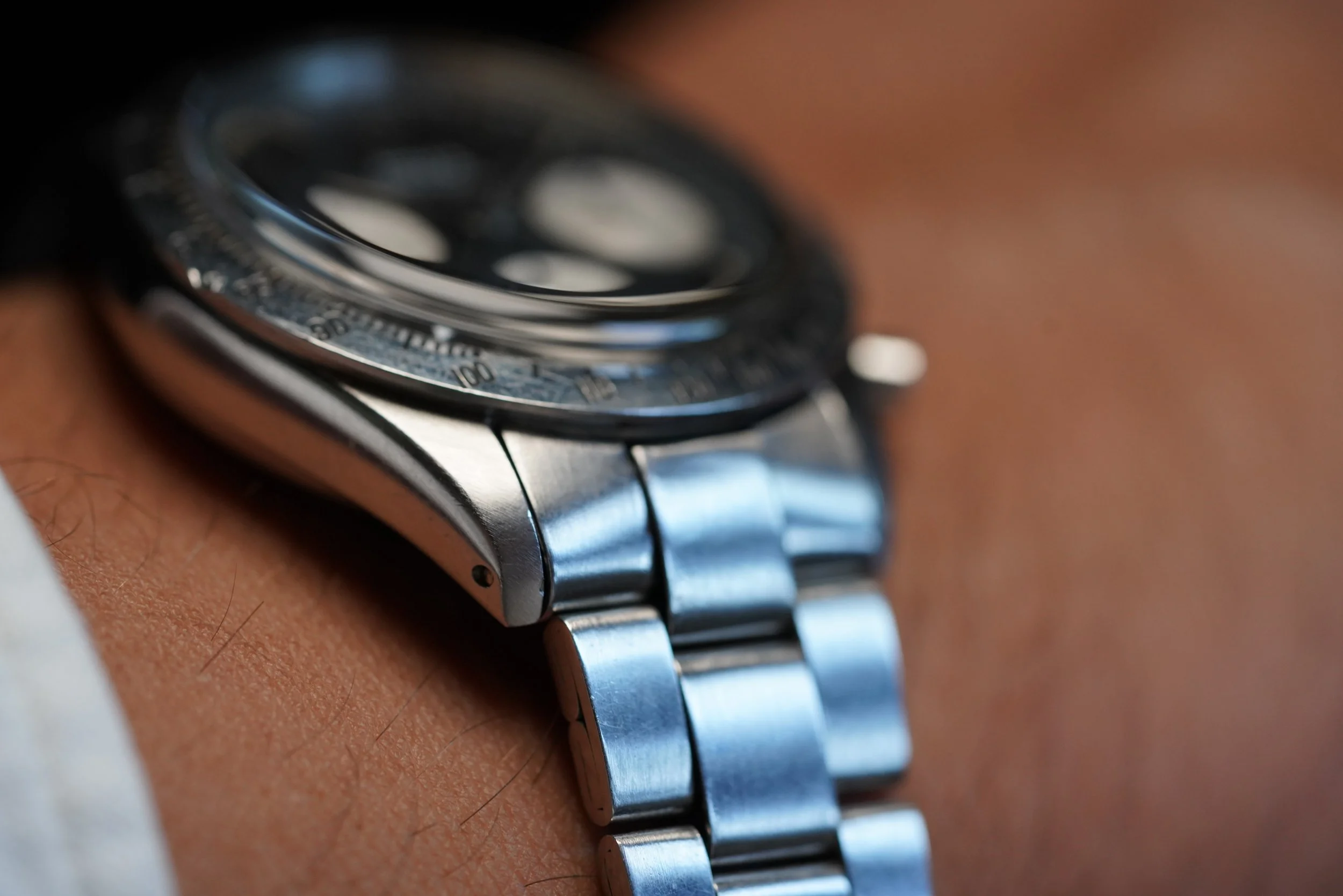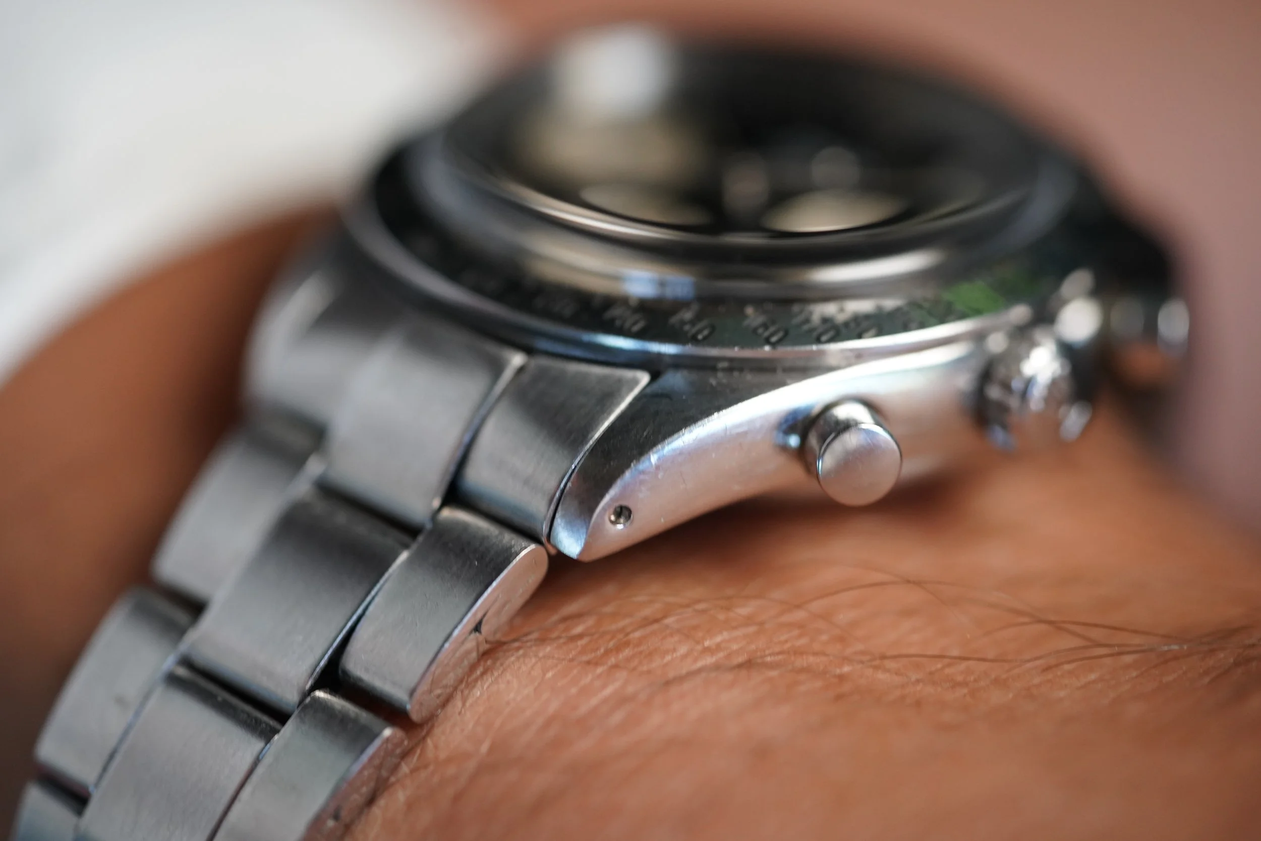 The Rolex Daytona reference 6239 is the original and earliest reference of the Daytona. This example features a “Big Daytona” logo where DAYTONA is large and underneath COSMOGRAPH on the dial. I really love the way the ROLEX / COSMOGRAPH / DAYTONA text lines up in descending order like a pyramid in shape.