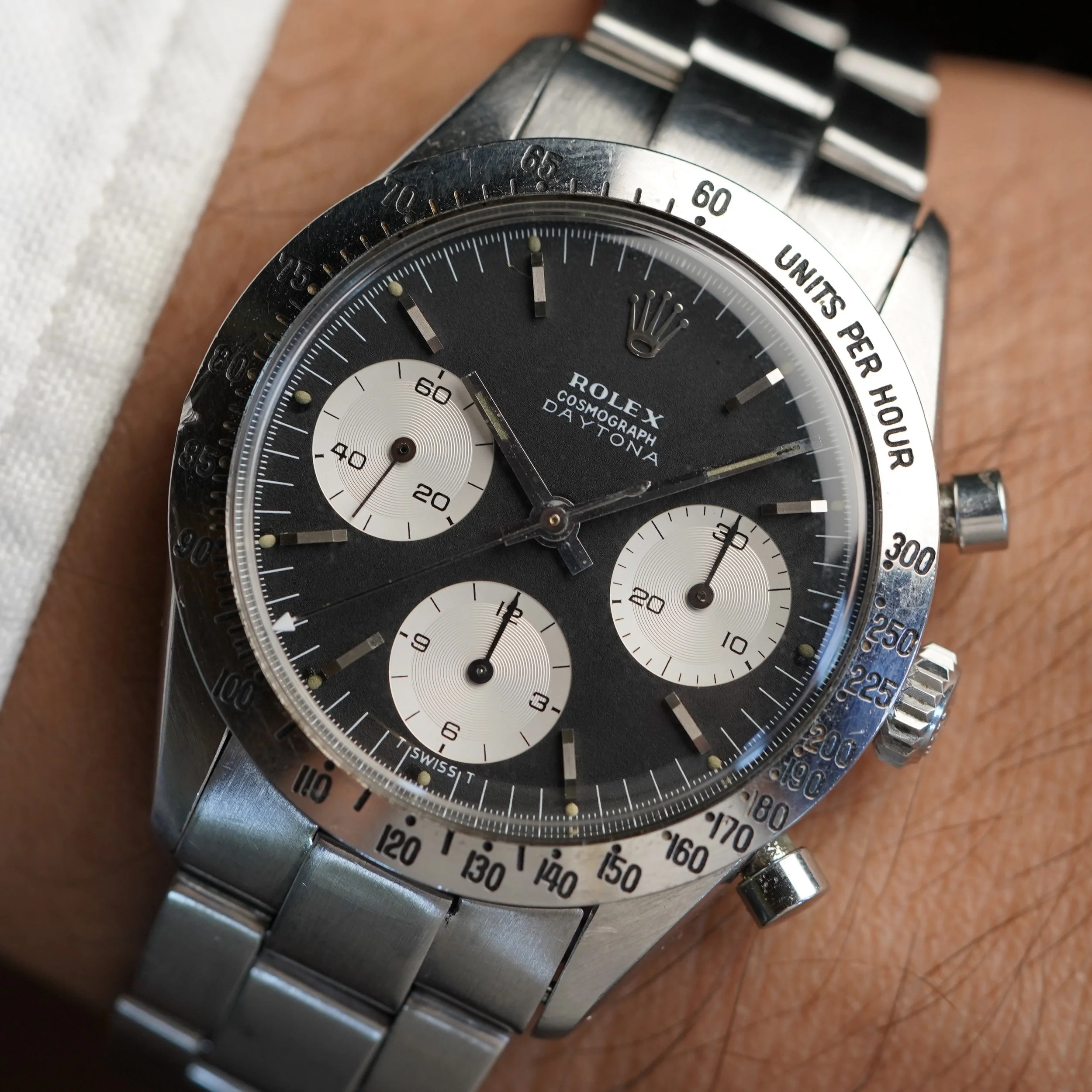 This example also has the original early “300” Mark 2 reference 6239 bezel, which differs from later examples by having 300 on the tachymeter bezel and “UNITS PER HOUR” between 12 and 2 o’clock, whereas later bezels have it by 3 o’clock. This is the second version of the steel bezel found on the reference 6239 and the earliest Mark 1 examples have a 275 and dashes rather than dots next to the numbers.