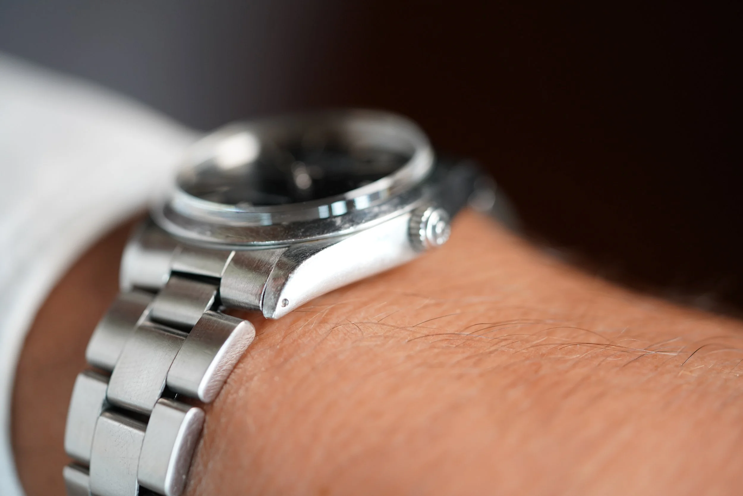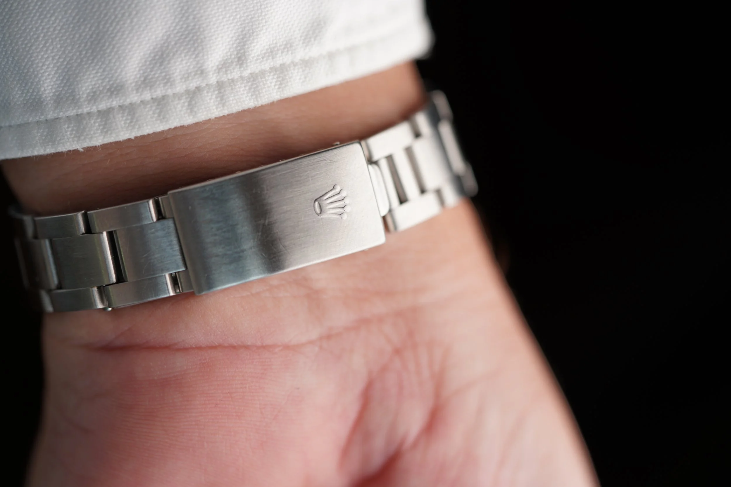 This Rolex Air-King reference 5500 is an amazing watch. The steel case is 34mm. It appears to be unpolished. The watch features an R serial dating to circa 1987. It features an uncommon black dial.