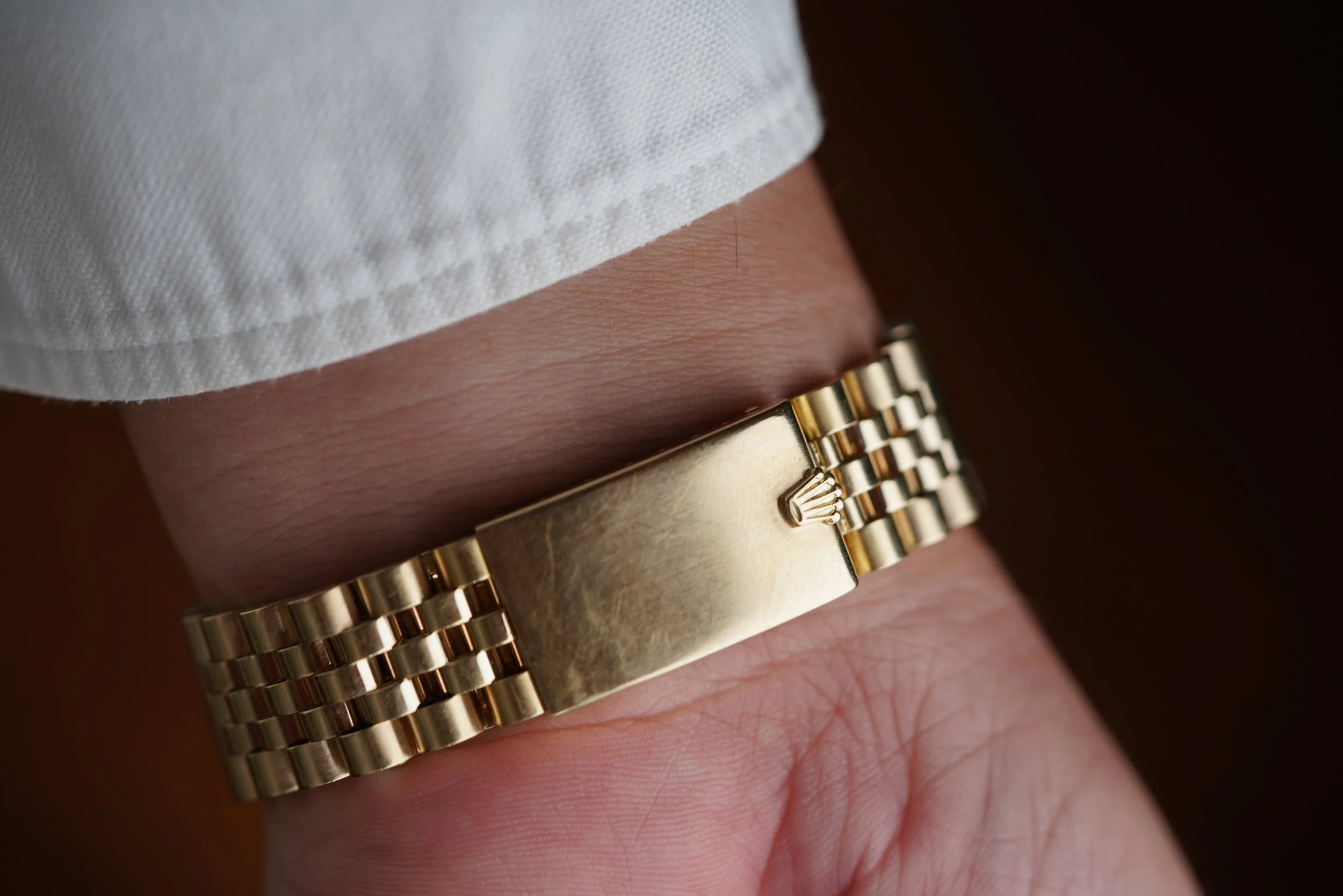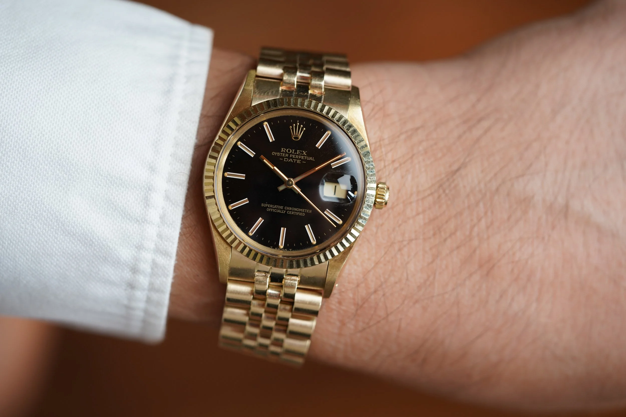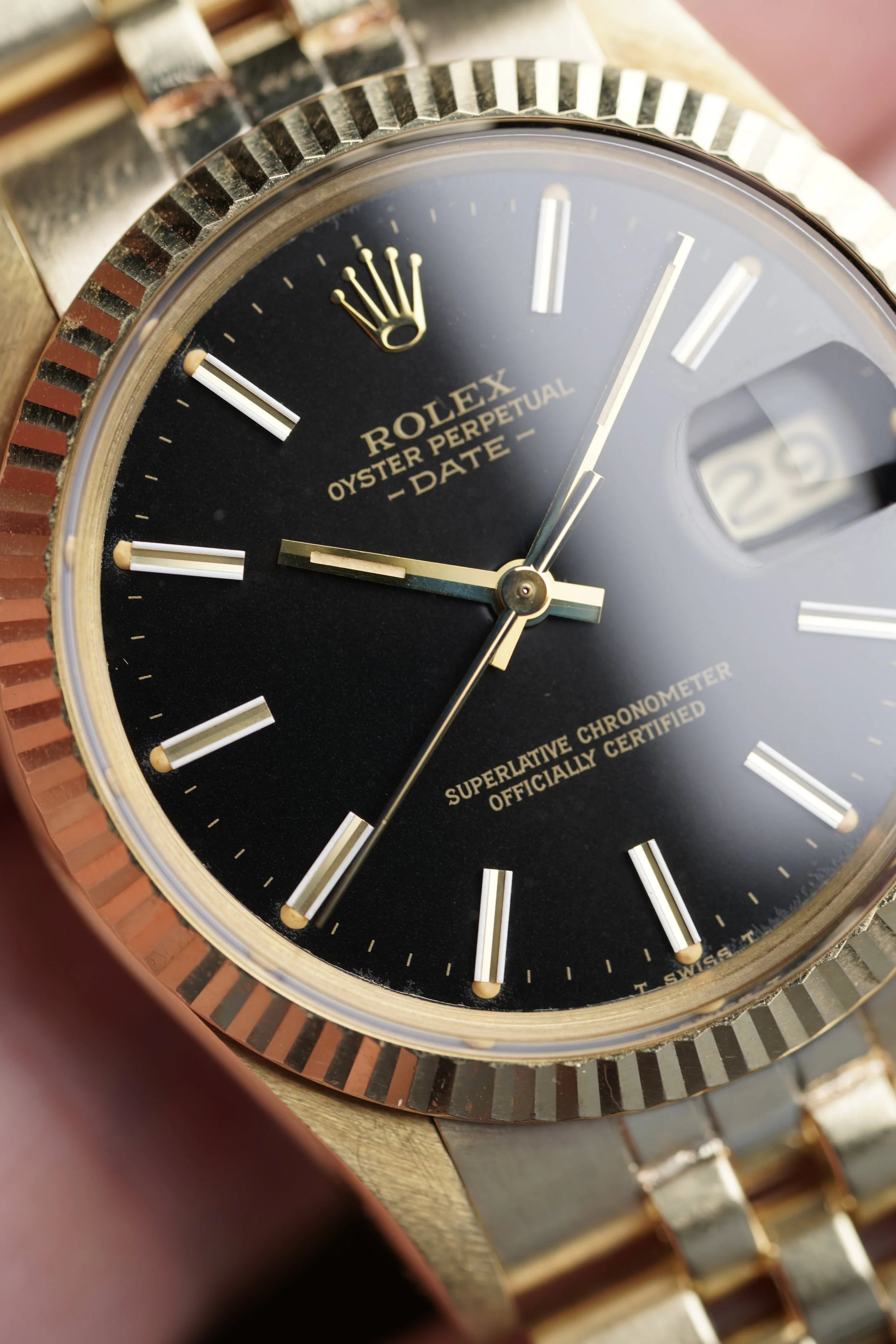 This Rolex Date reference 15037 is an outstanding example with a black dial. The case is a rare version in 14K yellow gold. It appears to be un unpolished. The case is 34mm in diameter. It is paired on its original Jubilee bracelet with G date code dating to 1982 and appears to be original to the watch. The watch features a 6.7M serial dating to circa 1981. The gold font on the dial is very sharp and resembles the gilt dial Rolex watches of the 1960s. The hands have developed a very attractive patina that appears somewhat green. For those looking for an incredible Rolex Date in yellow gold, this watch is a great option.