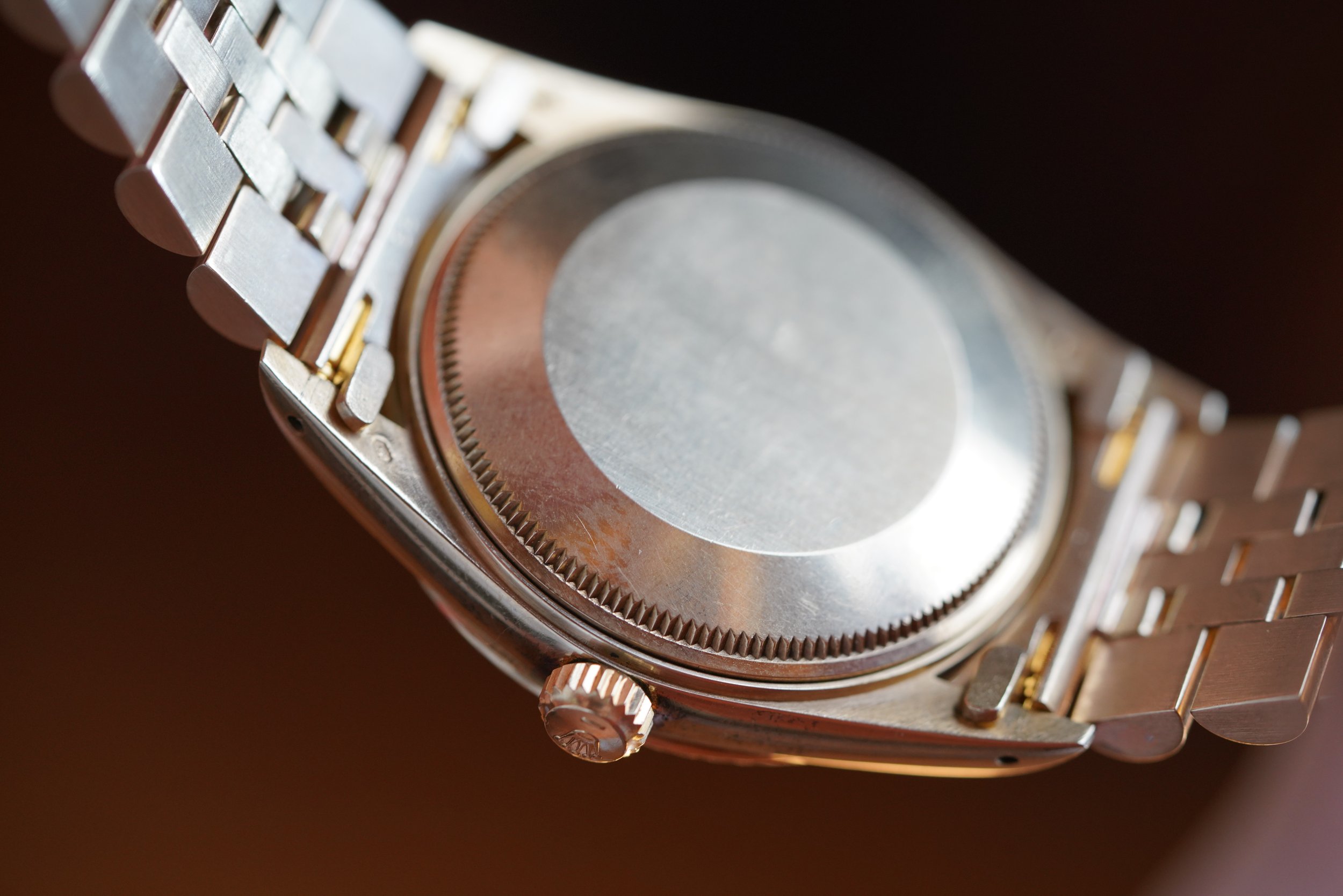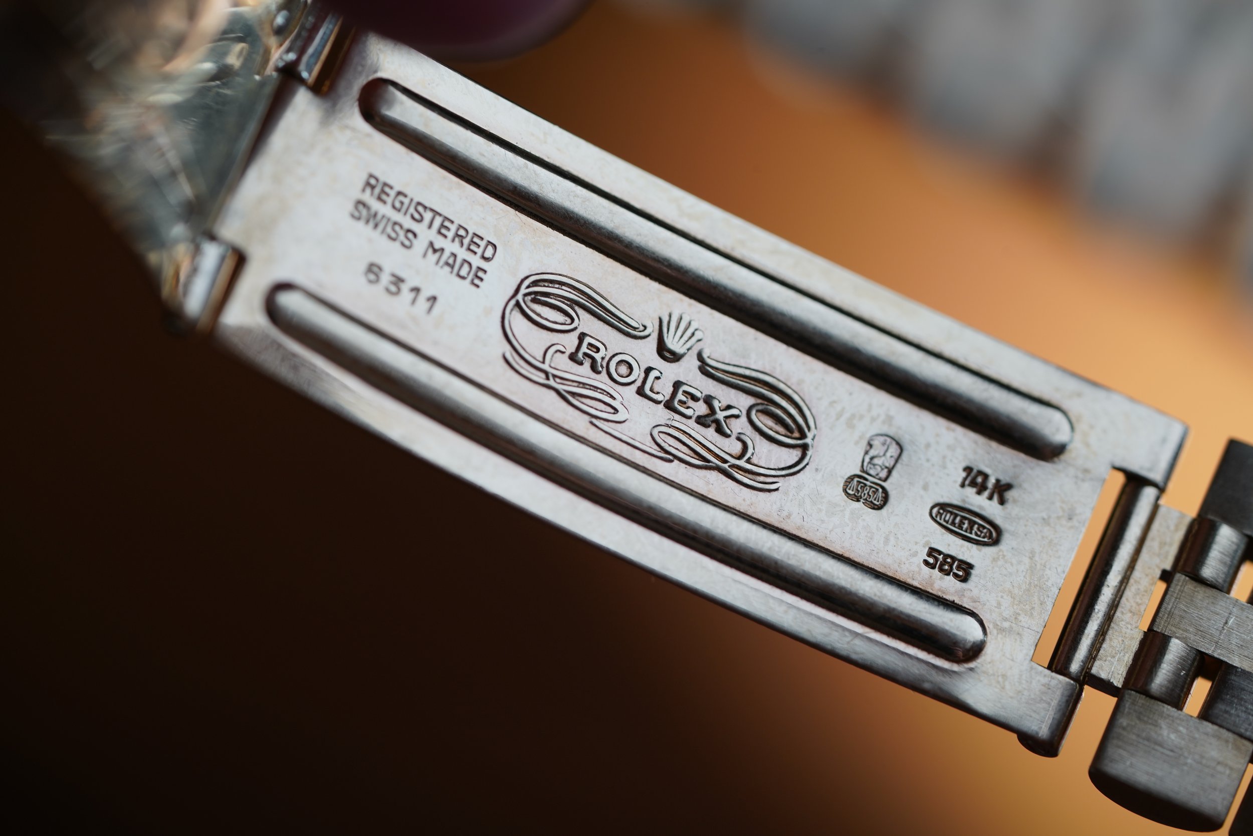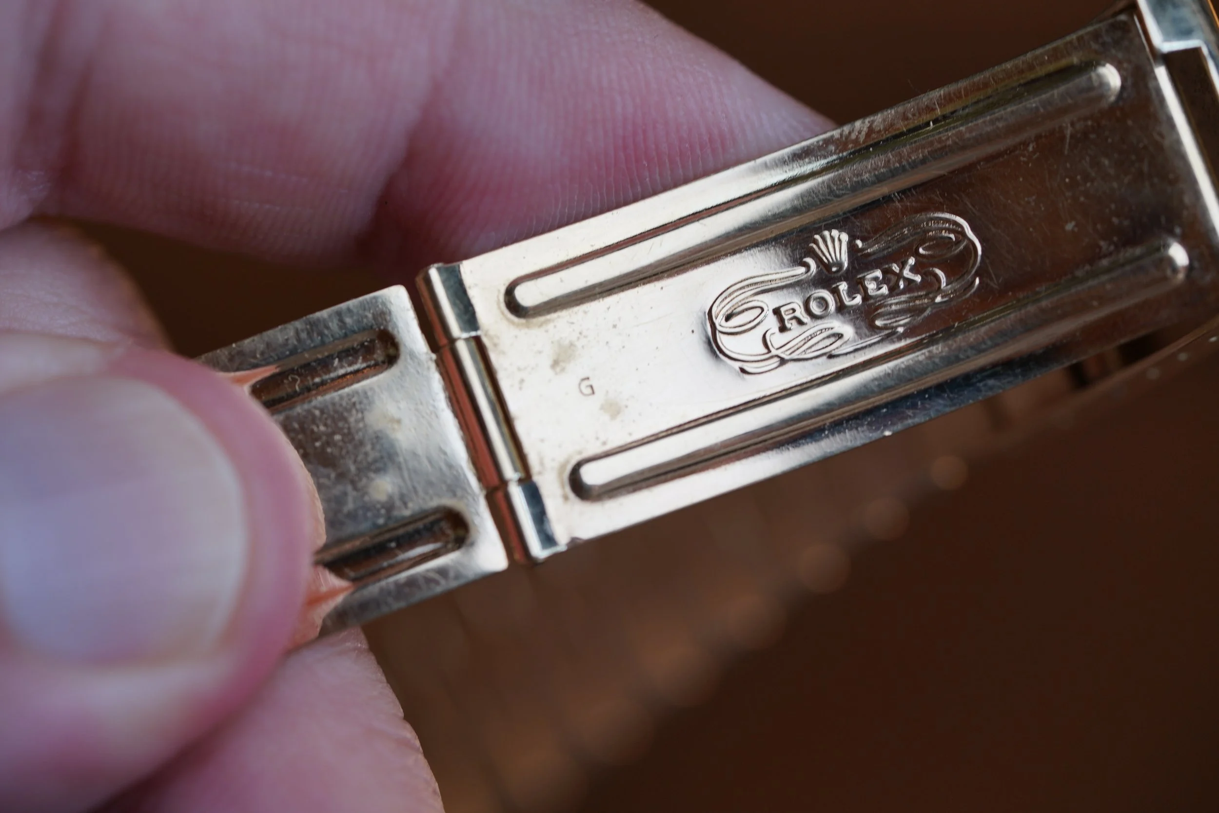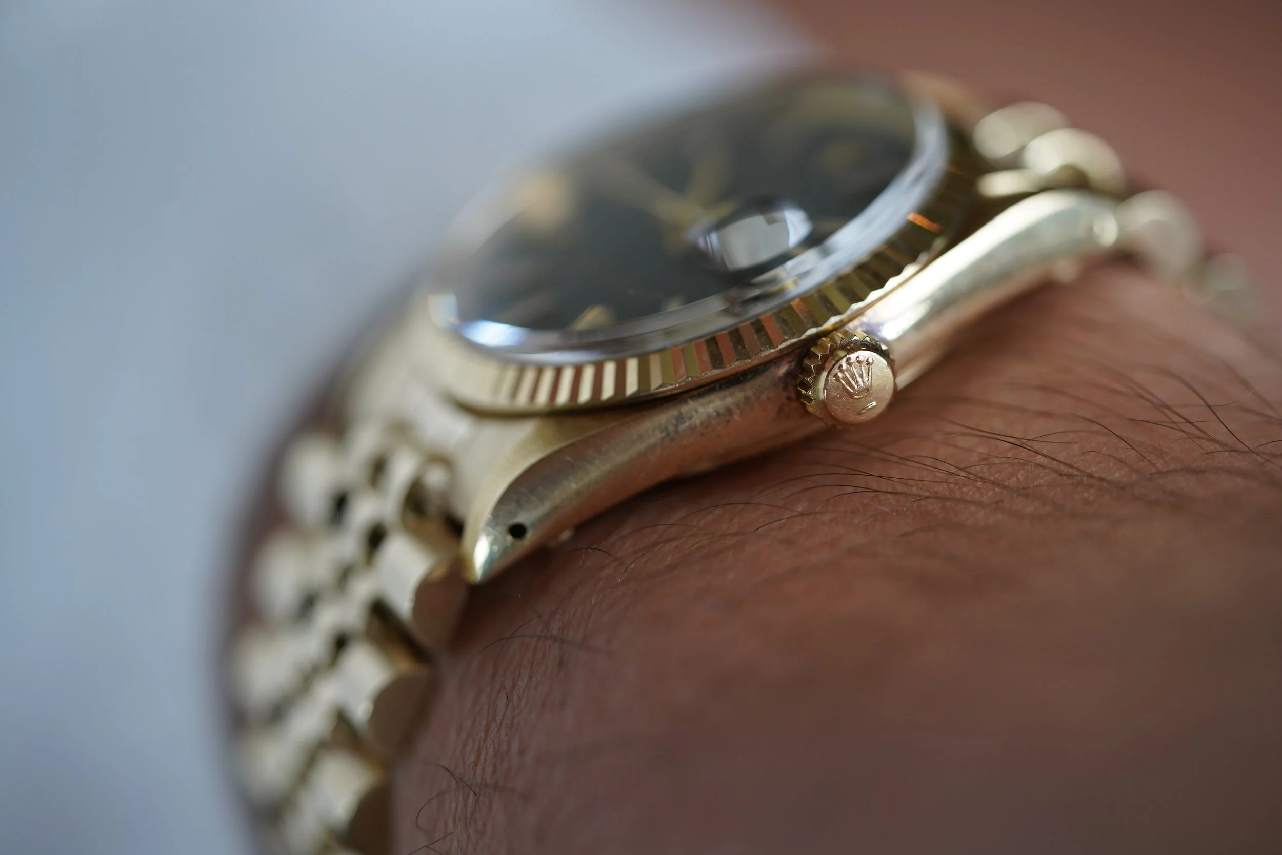 This Rolex Date reference 15037 is an outstanding example with a black dial. The case is a rare version in 14K yellow gold. It appears to be un unpolished. The case is 34mm in diameter. It is paired on its original Jubilee bracelet with G date code dating to 1982 and appears to be original to the watch. The watch features a 6.7M serial dating to circa 1981. The gold font on the dial is very sharp and resembles the gilt dial Rolex watches of the 1960s. The hands have developed a very attractive patina that appears somewhat green. For those looking for an incredible Rolex Date in yellow gold, this watch is a great option.