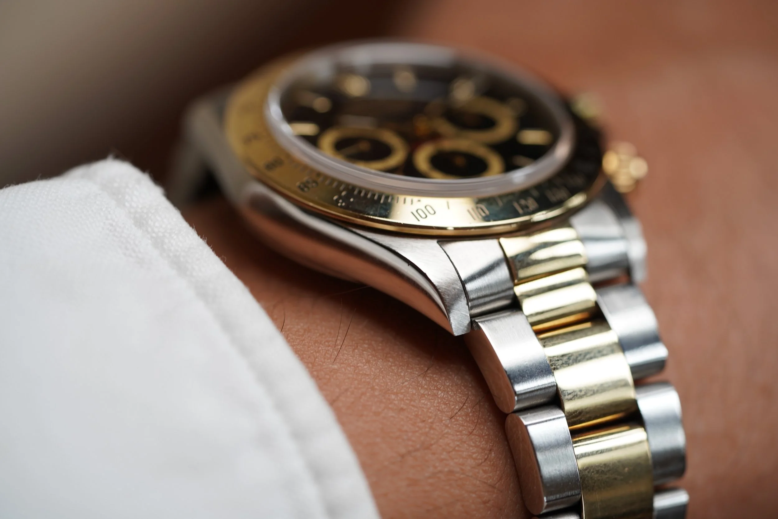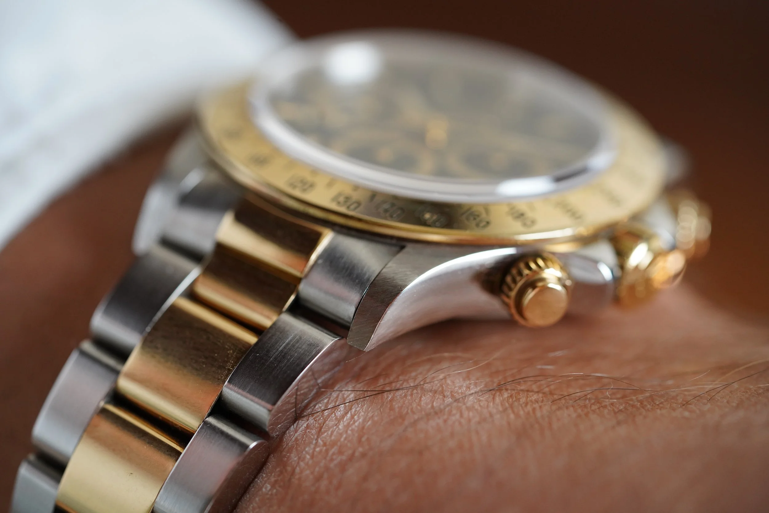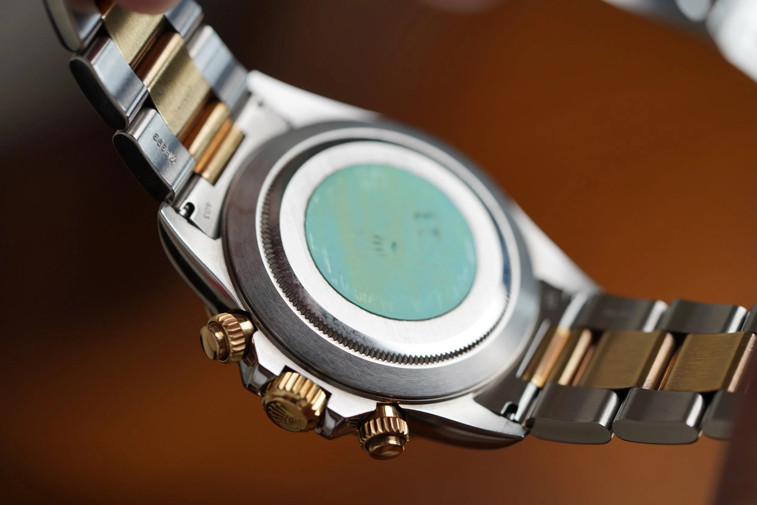 This two-tone Rolex Zenith Daytona Reference 16523 dates to circa 2000. It has a P serial number, which denotes the final run of the reference 16523 and is very uncommon. There were also some P serial reference 116523 examples made with the in-house Rolex automatic calibre 4130.