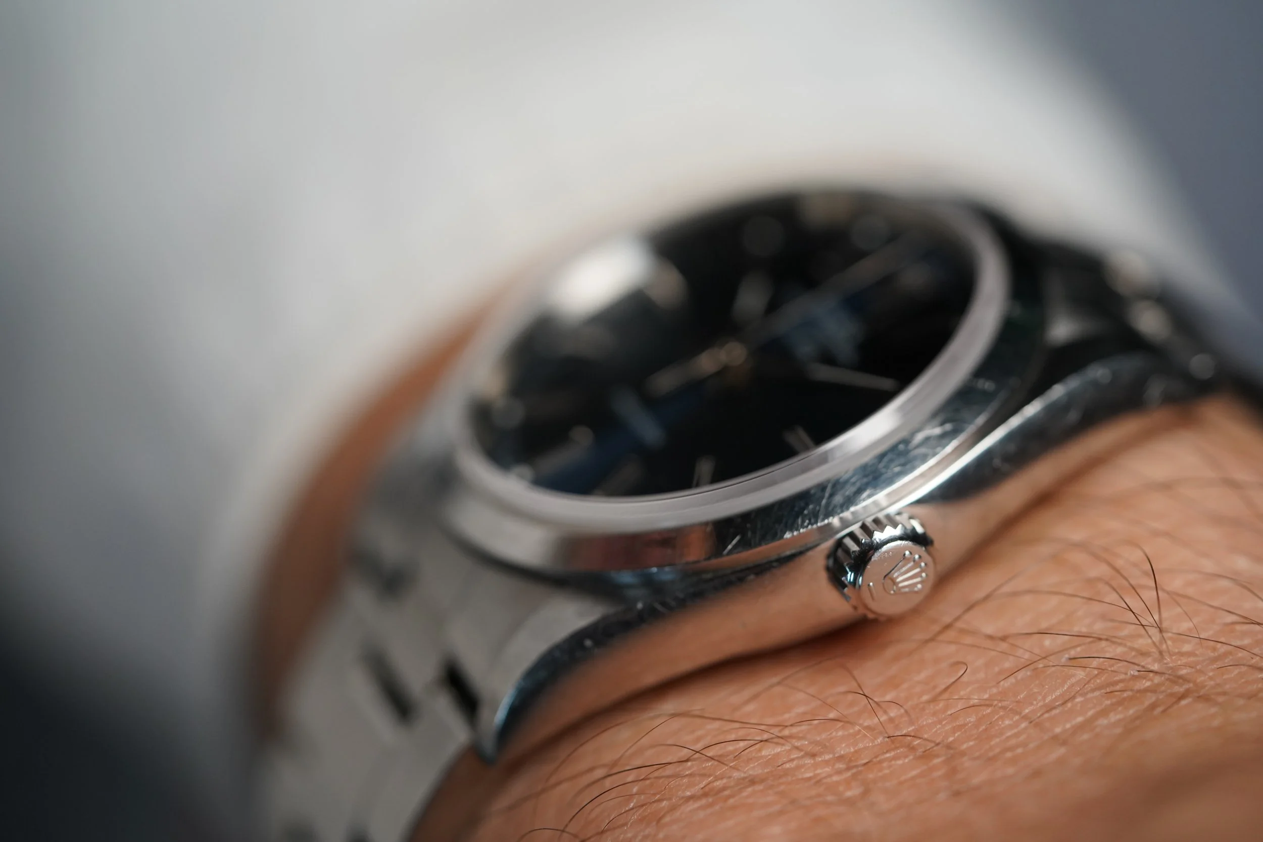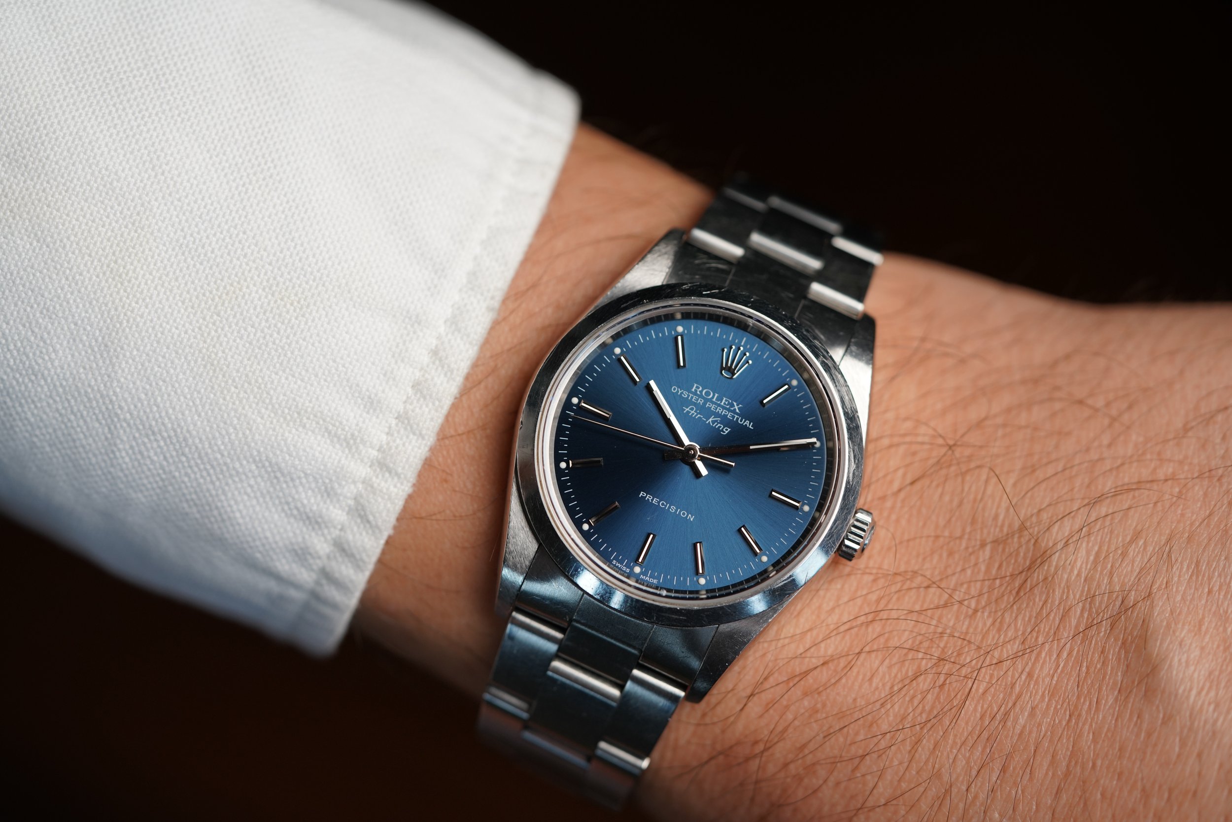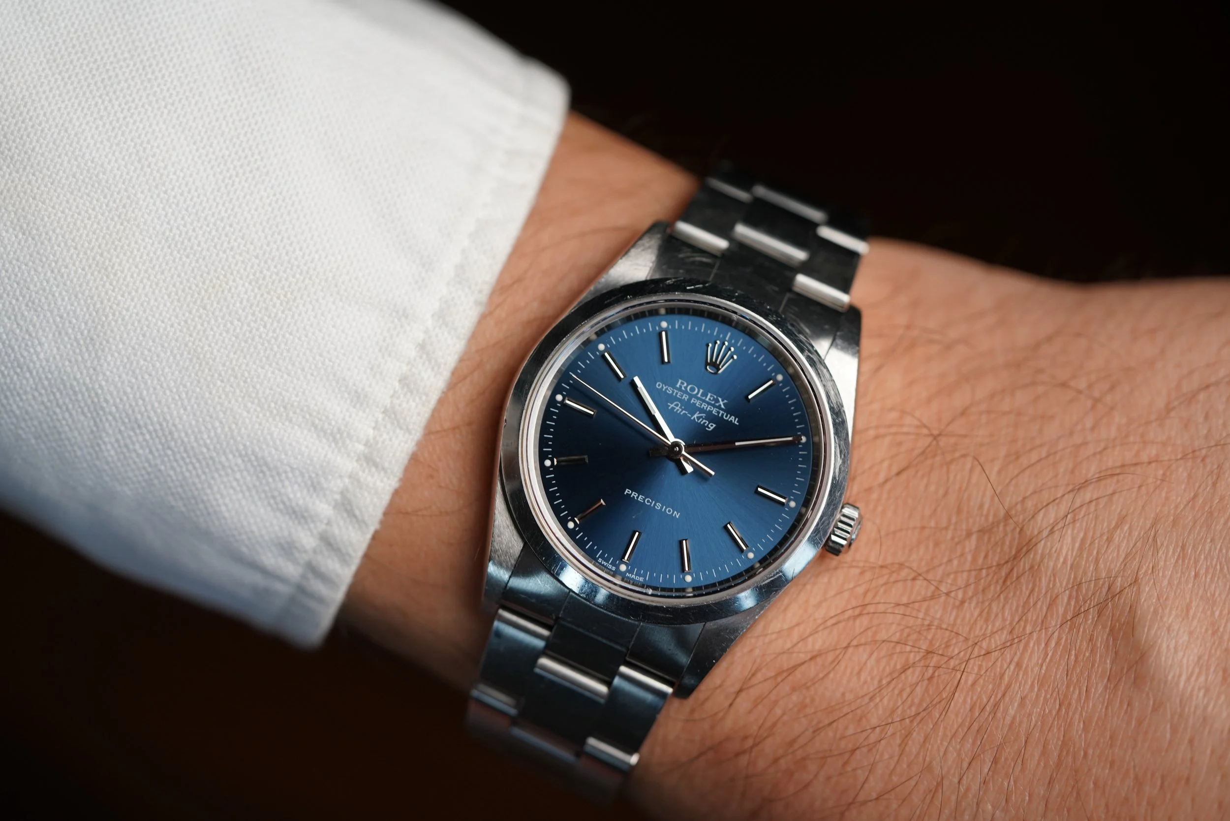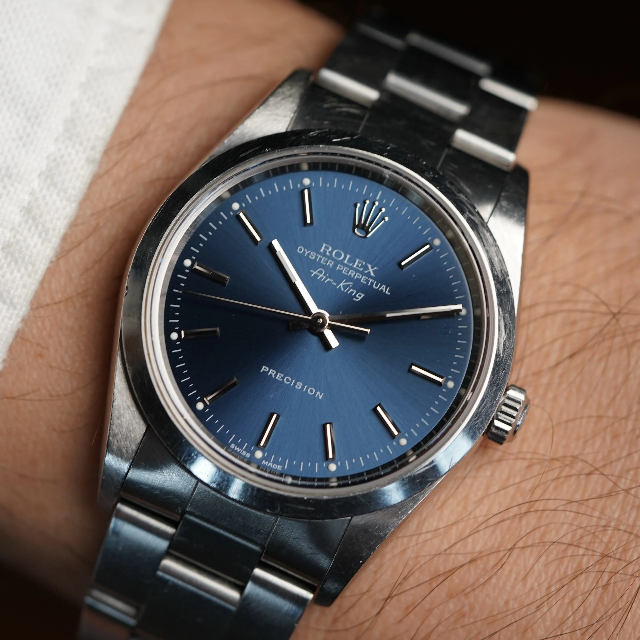 This Rolex Air-King reference 14000 is a superb example with a stunning blue dial. The watch features a Y serial number and dates to circa 2001-2002. We believe the case is unpolished. This Air-King is an awesome wristwatch for both casual and formal attire.