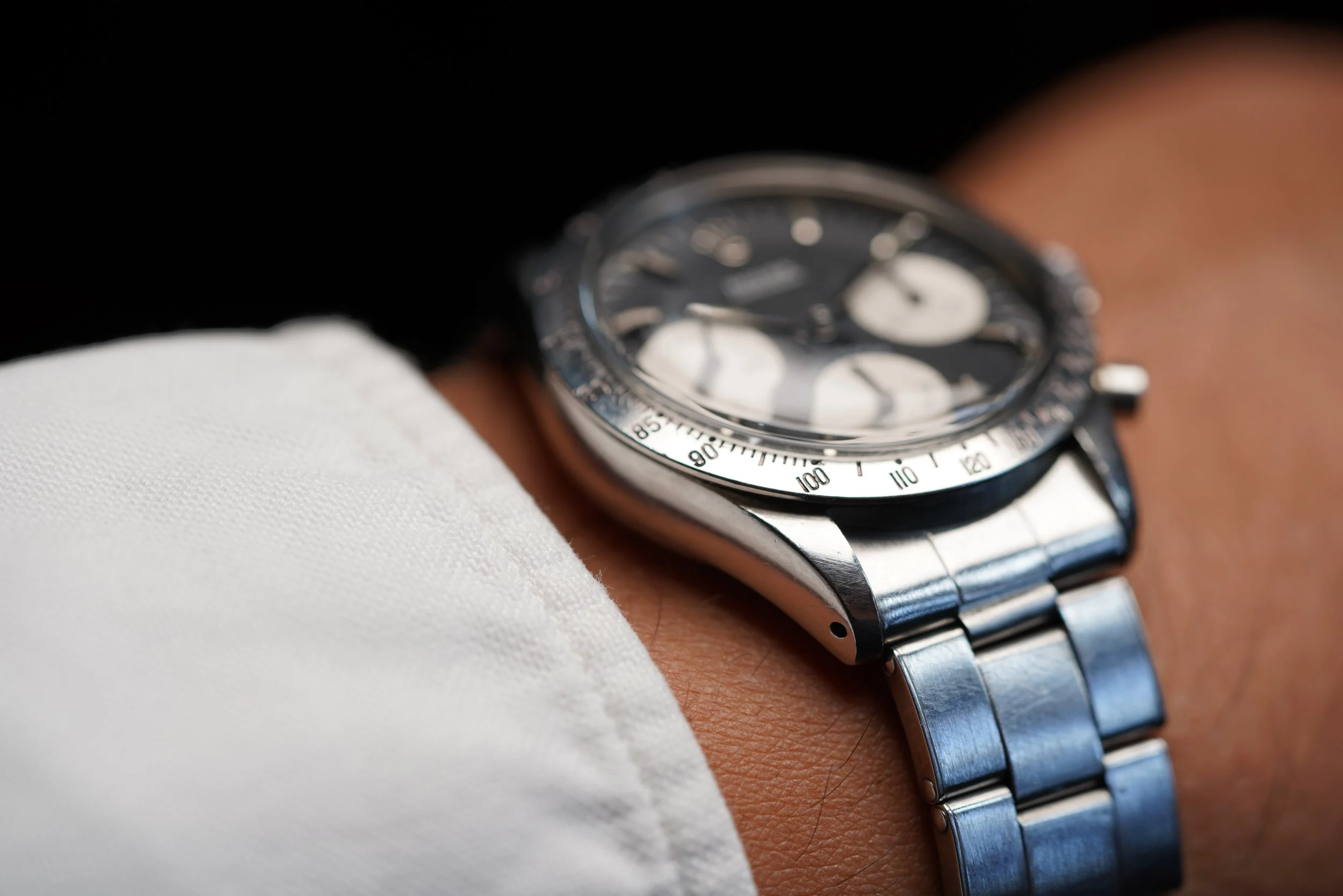 This Rolex Blue Daytona reference 6262 is an incredibly attractive watch. The “DAYTONA” font on these examples feature a light blue color in certain lights (similar to secondary stamped Submariner 5512’s SCOC font). This occurs as the font was stamped subsequent to the Rolex Cosmograph font on the dial. The dial is attractive with clean subdials.