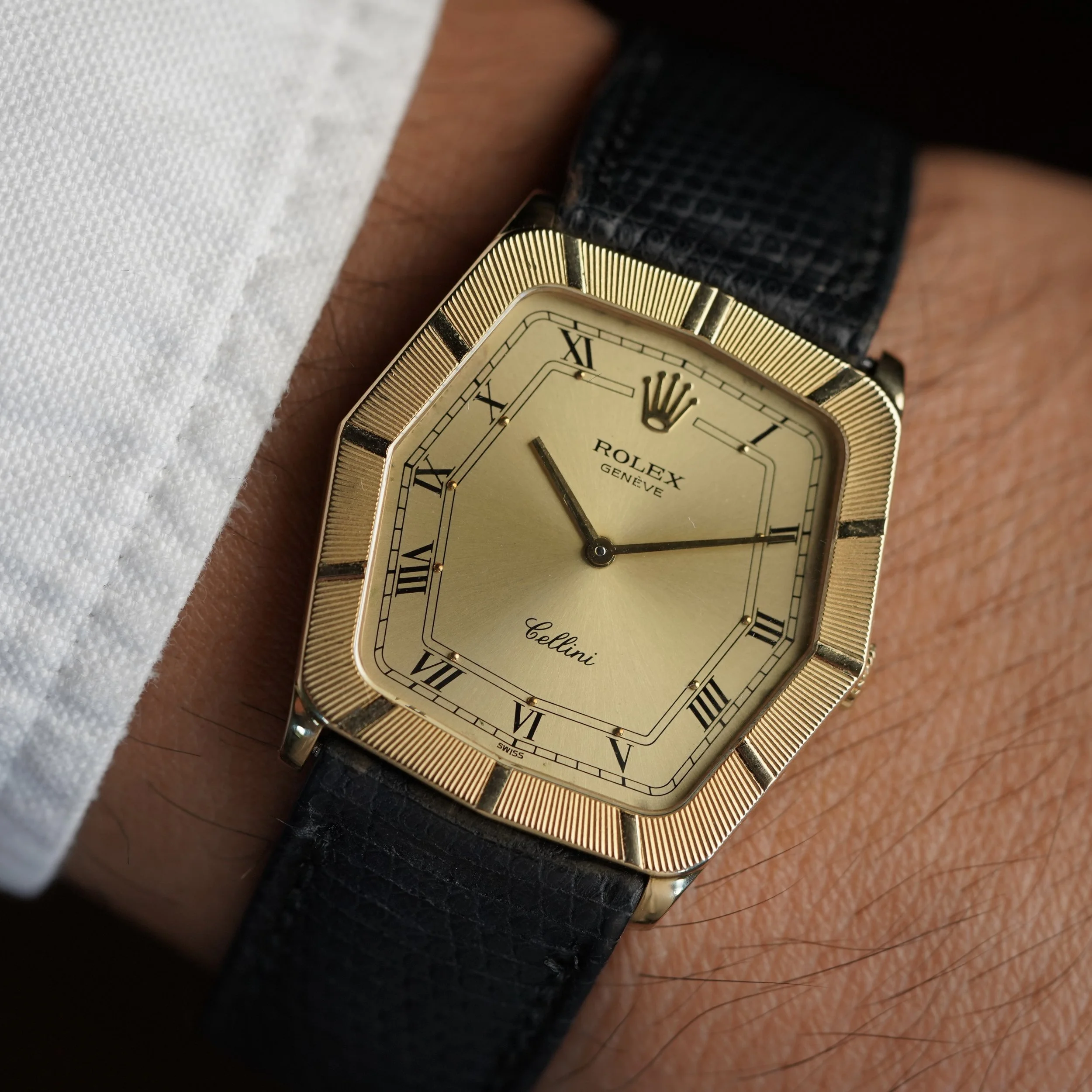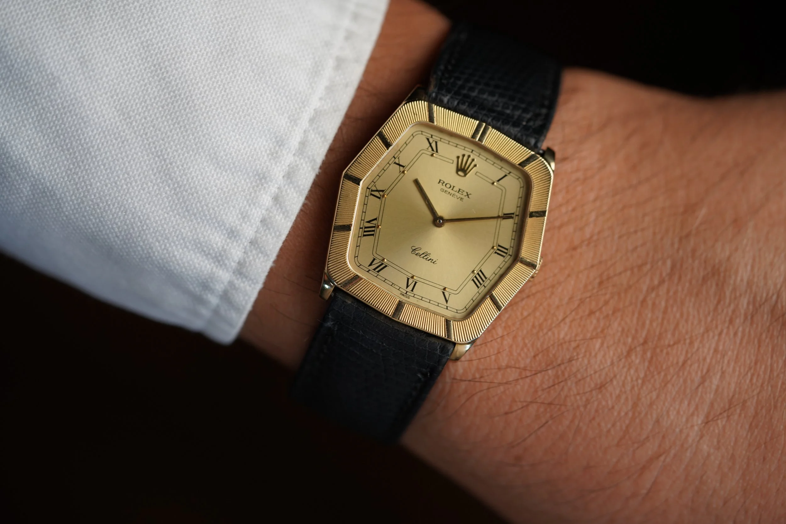 This Rolex Cellini is a very cool and interesting timepiece. The watch dates to 1990. The 18K yellow gold case measures 38mm in diameter. We believe it is unpolished. The case features 6.9M serial dating to circa 1981.