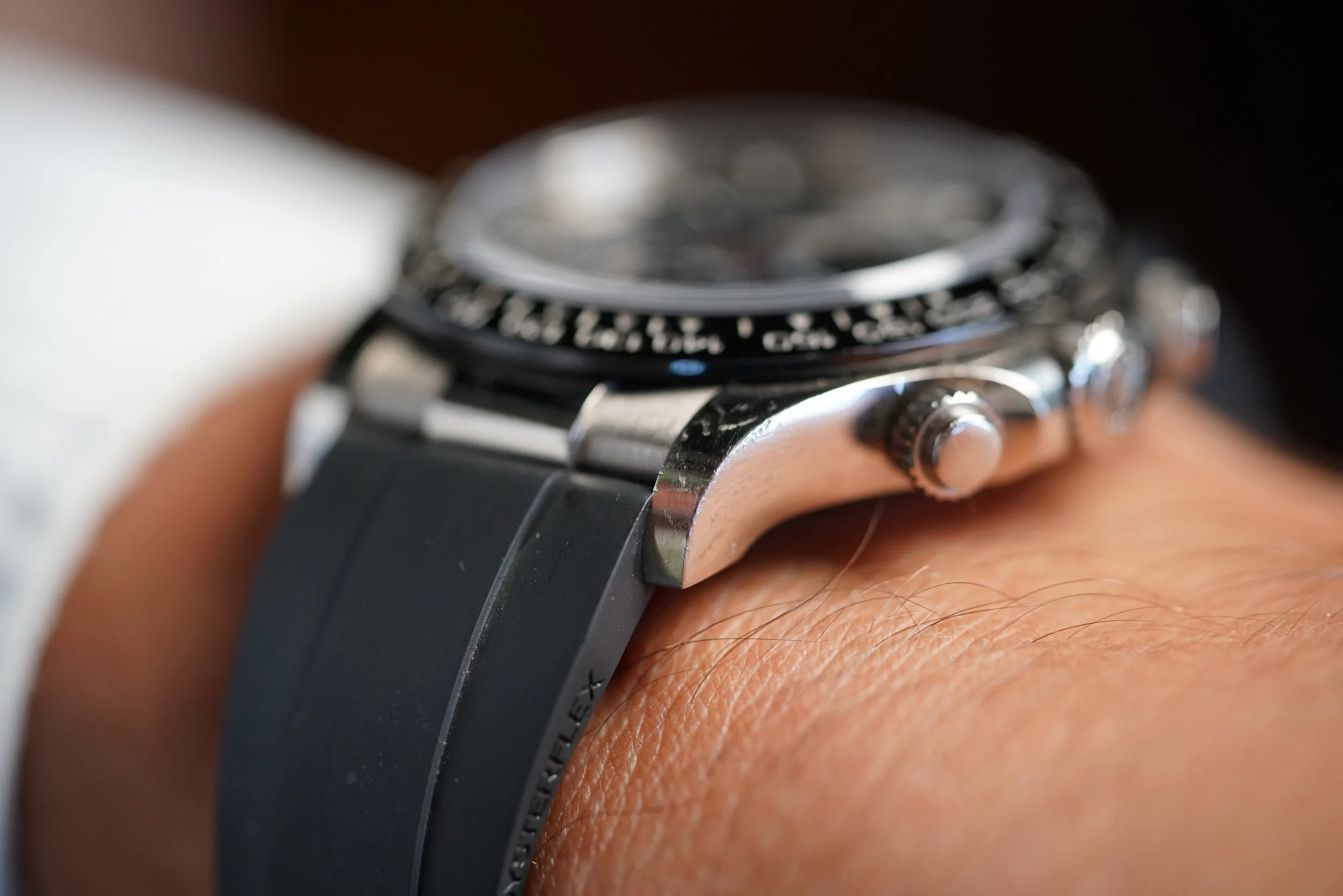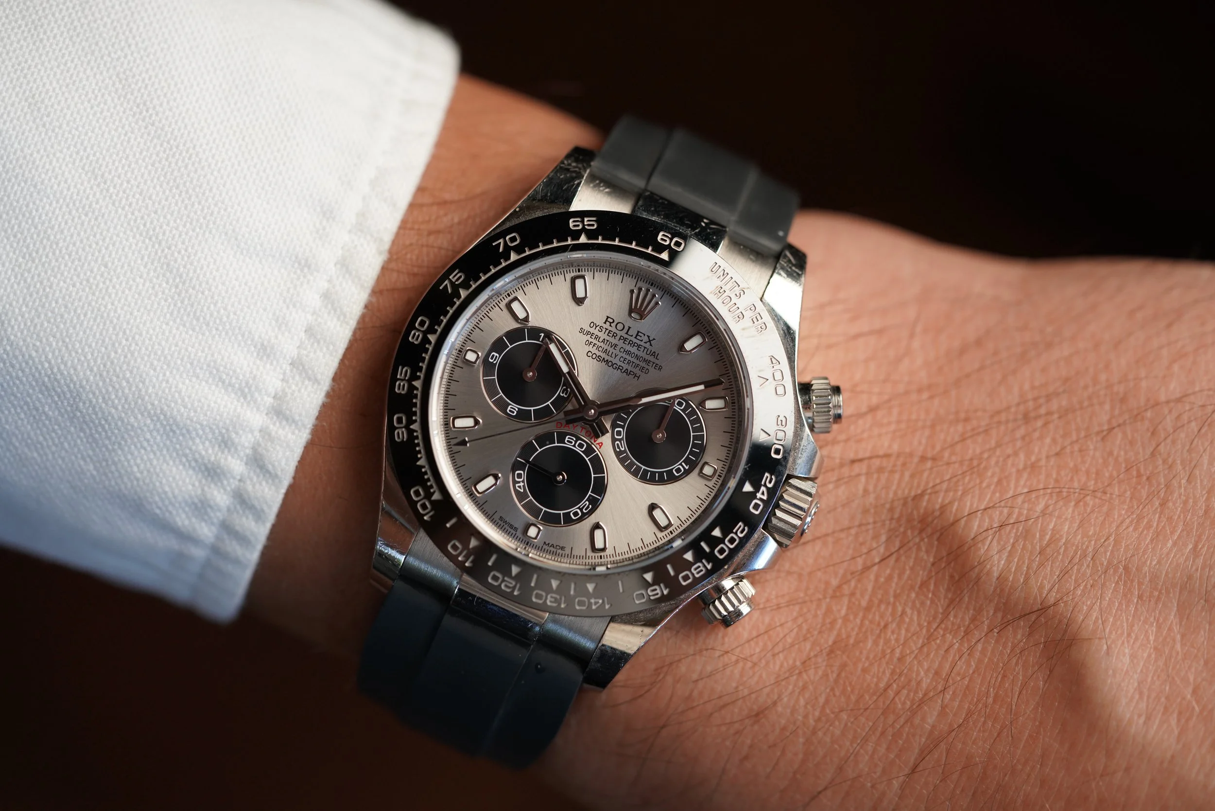 The Rolex Daytona Cosmograph reference 116519LN with grey dial is a fantastic iteration of the iconic sports watch. Paired on its original Oysterflex band, it is truly suited to be worn in all active situations.