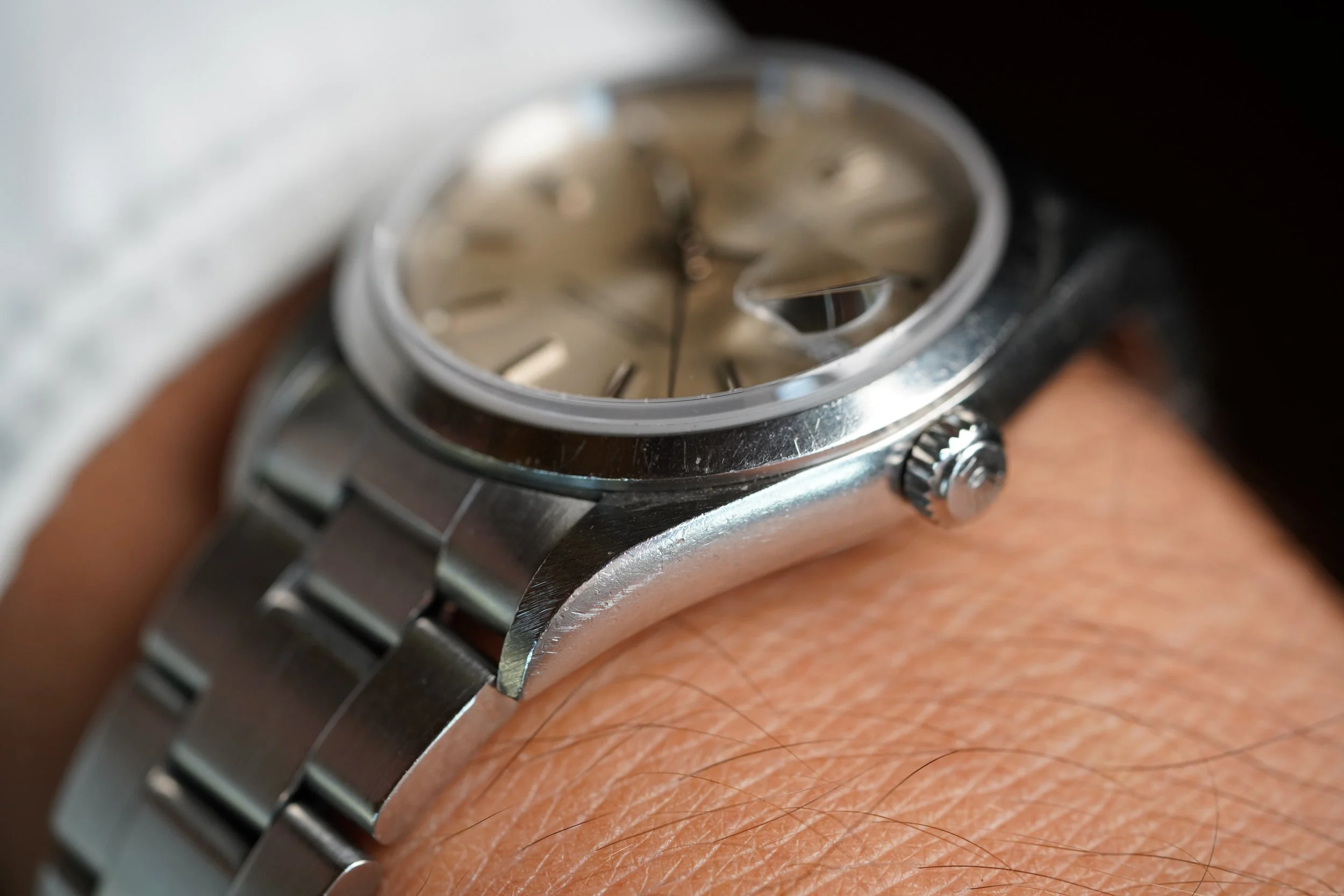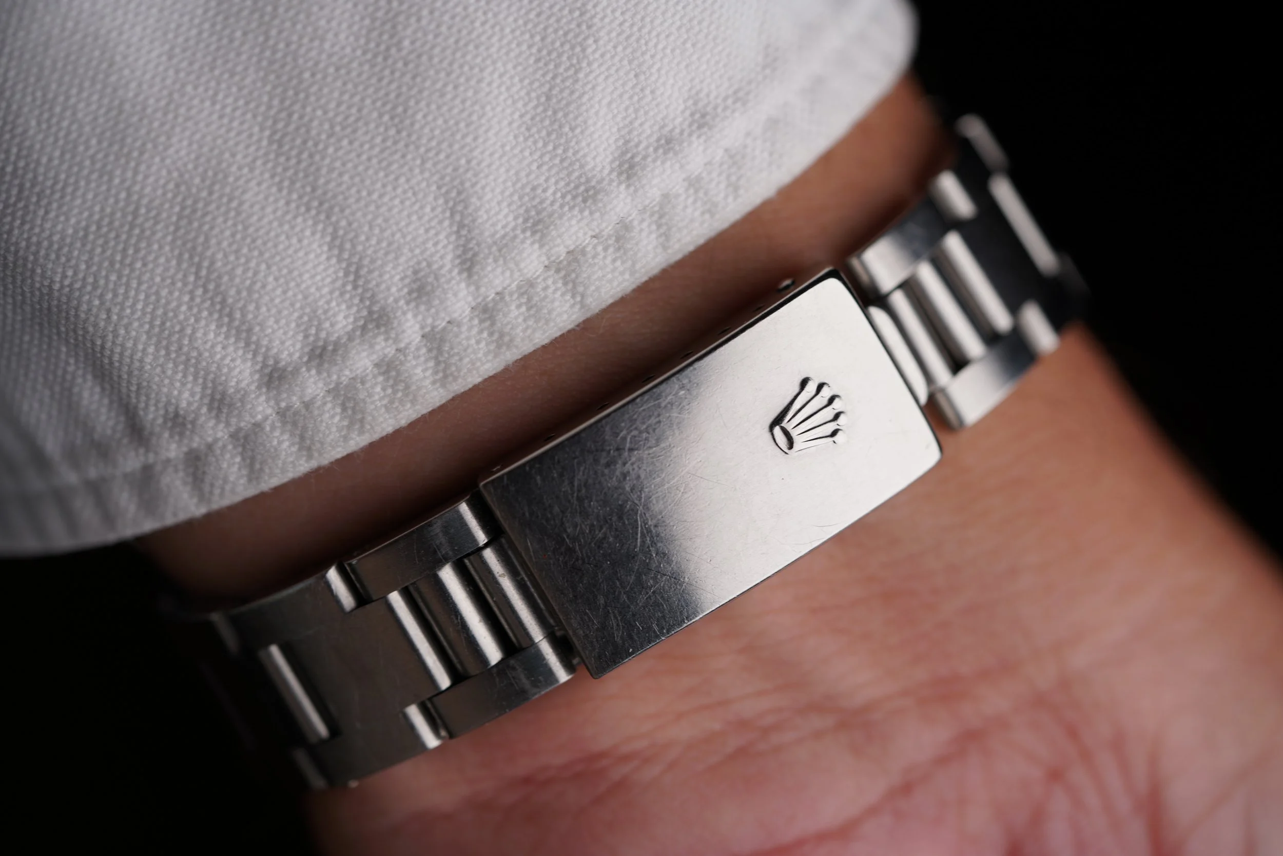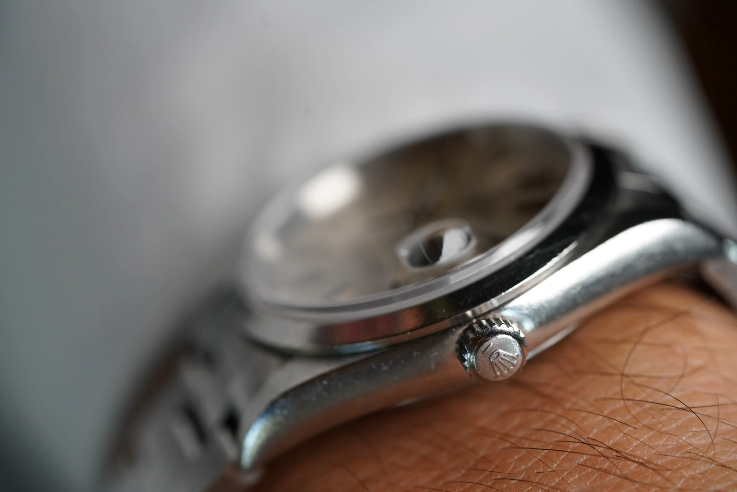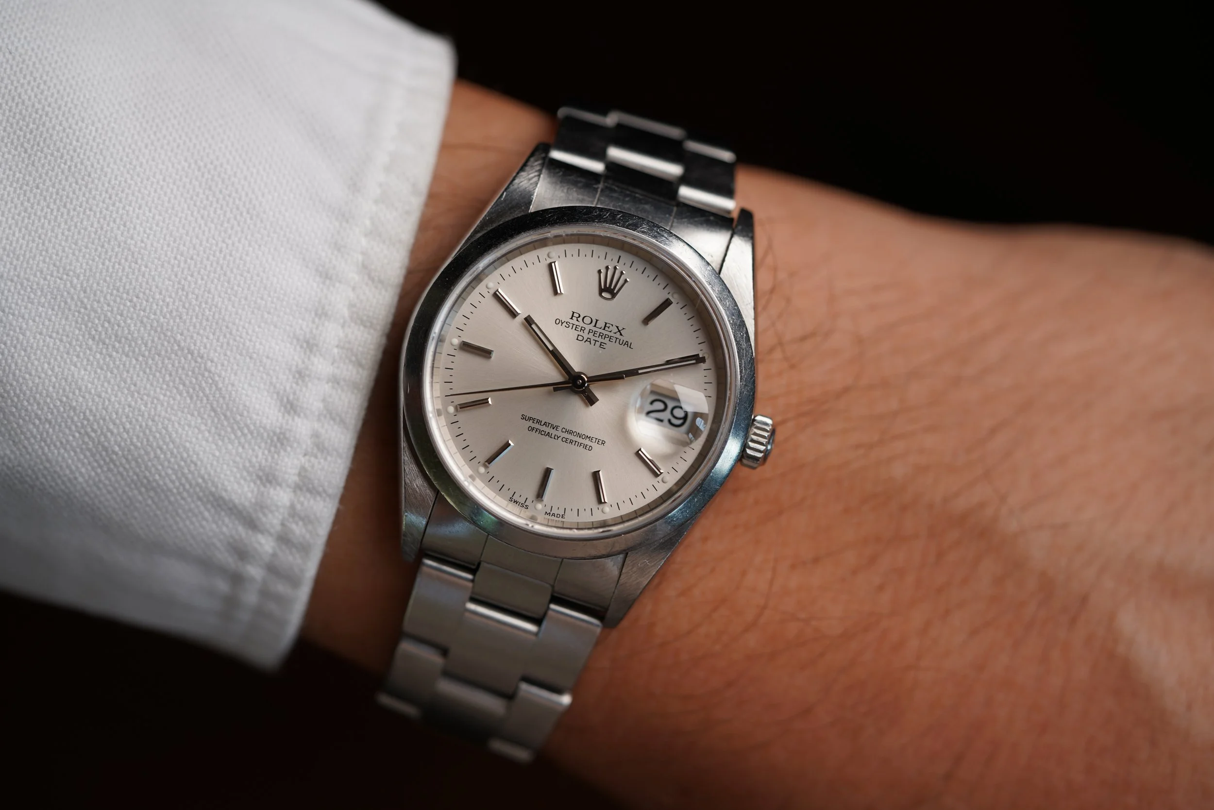 I absolutely love this Rolex Date reference 15200 The watch dates to circa 2000 with a P5 serial. The case measures 34mm in diameter. The watch is in excellent condition. The case appears to be unpolished.