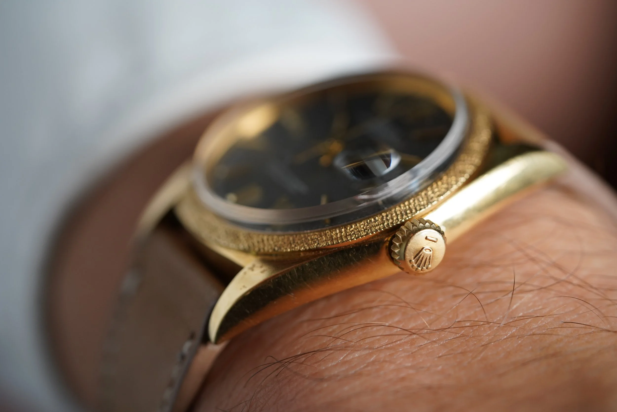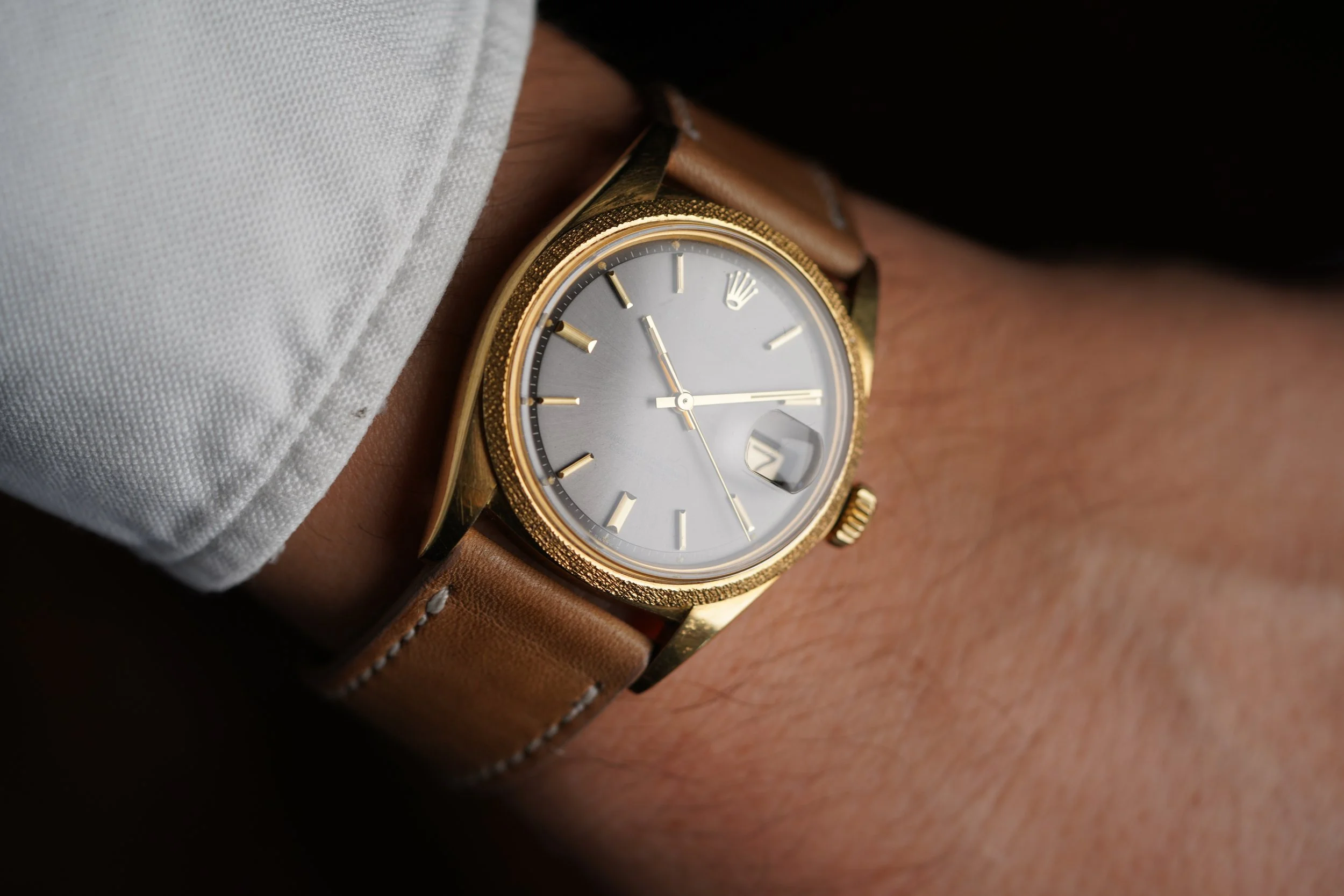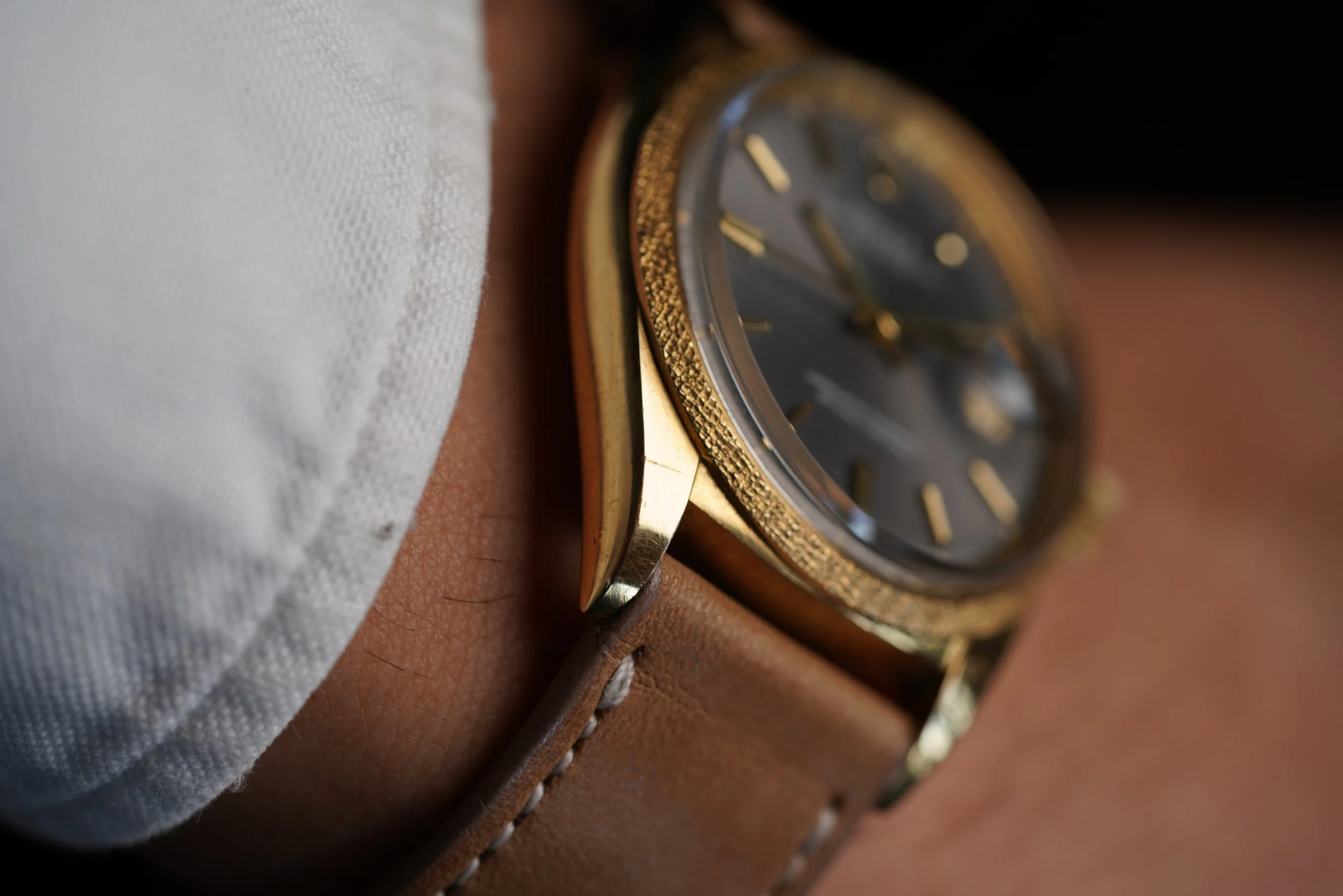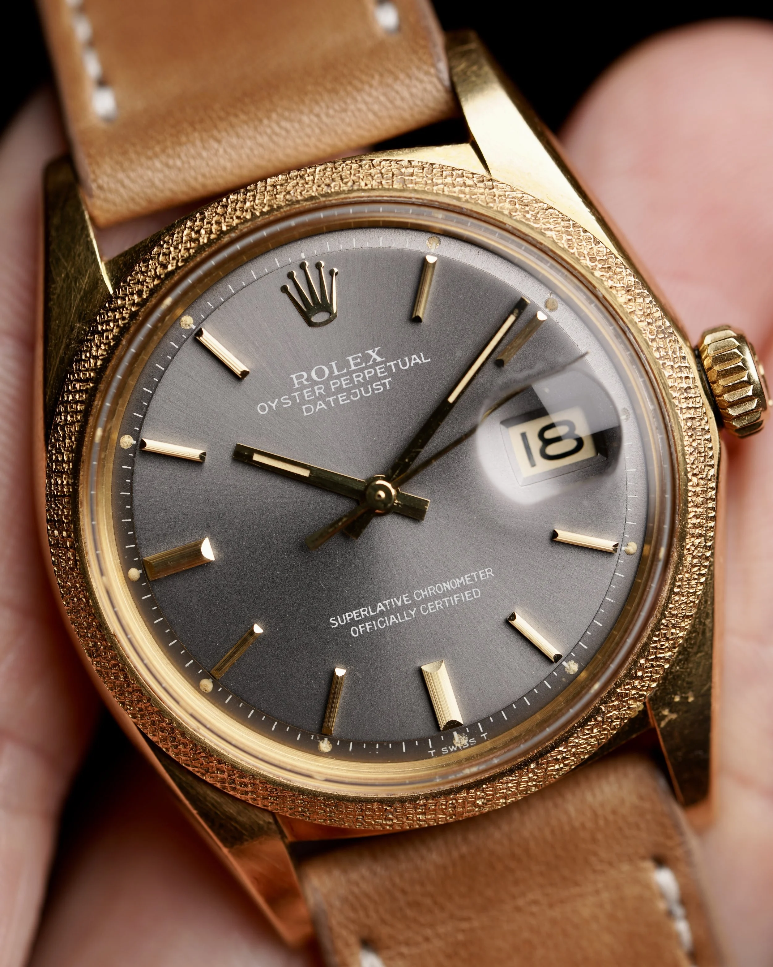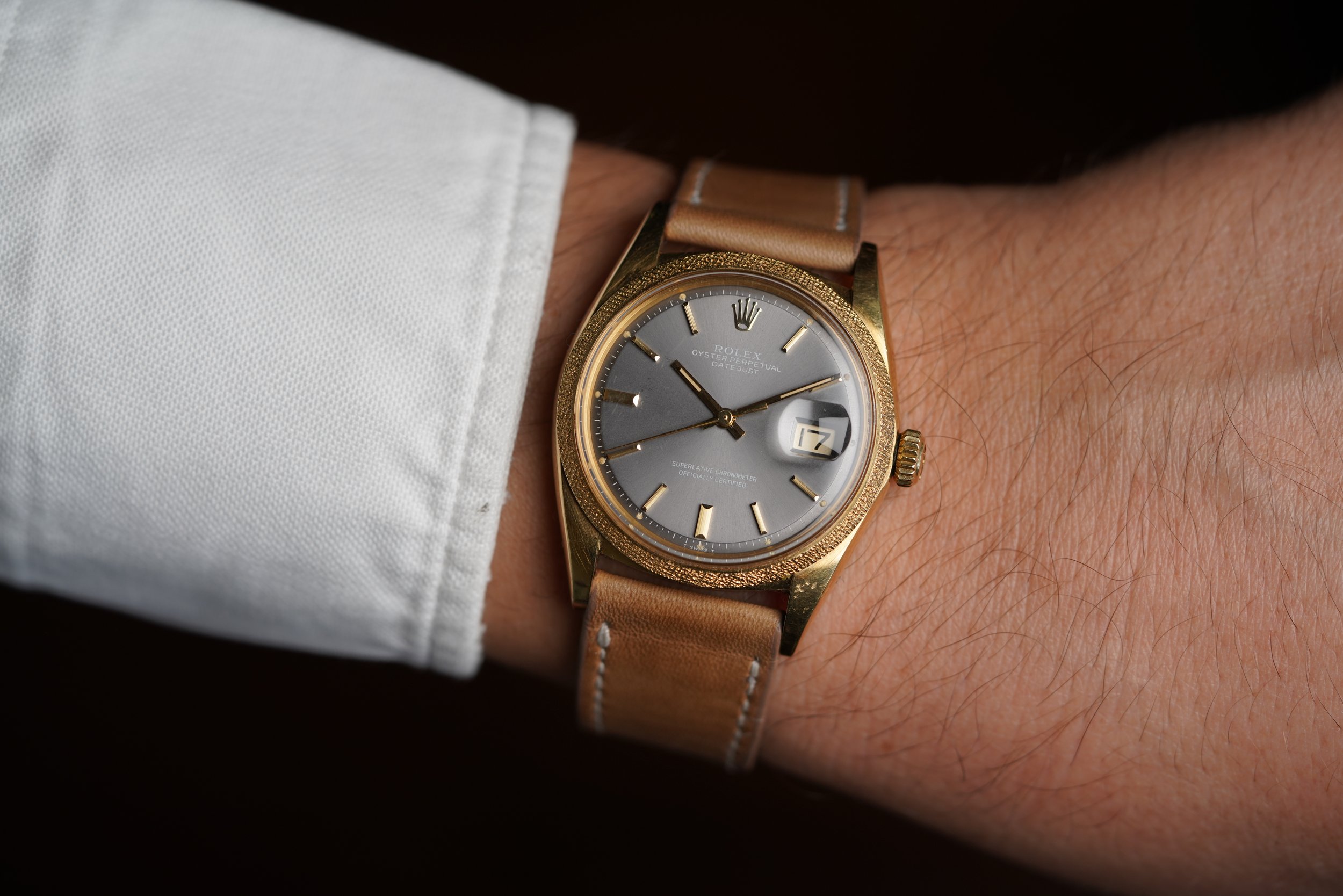 I’m constantly amazed by the quality and differentiations of the dials that Rolex used in vintage Datejusts over the decades. I have found the Rolex Datejust to be one of the most versatile watches a person can have. This is an extremely cool and uncommon Datejust reference 1611 in 18k yellow gold featuring the a beautiful Morellis finish bezel. It features a gorgeous grey pie pan dial and yellow gold hour markers and hands. The watch features a bezel with an interesting florentine finish. It is paired with a brown leather strap and 18k yellow gold Rolex buckles. It features a 2.98M dating to circa 1972. It was sold in 1974. The case appears to be unpolished.