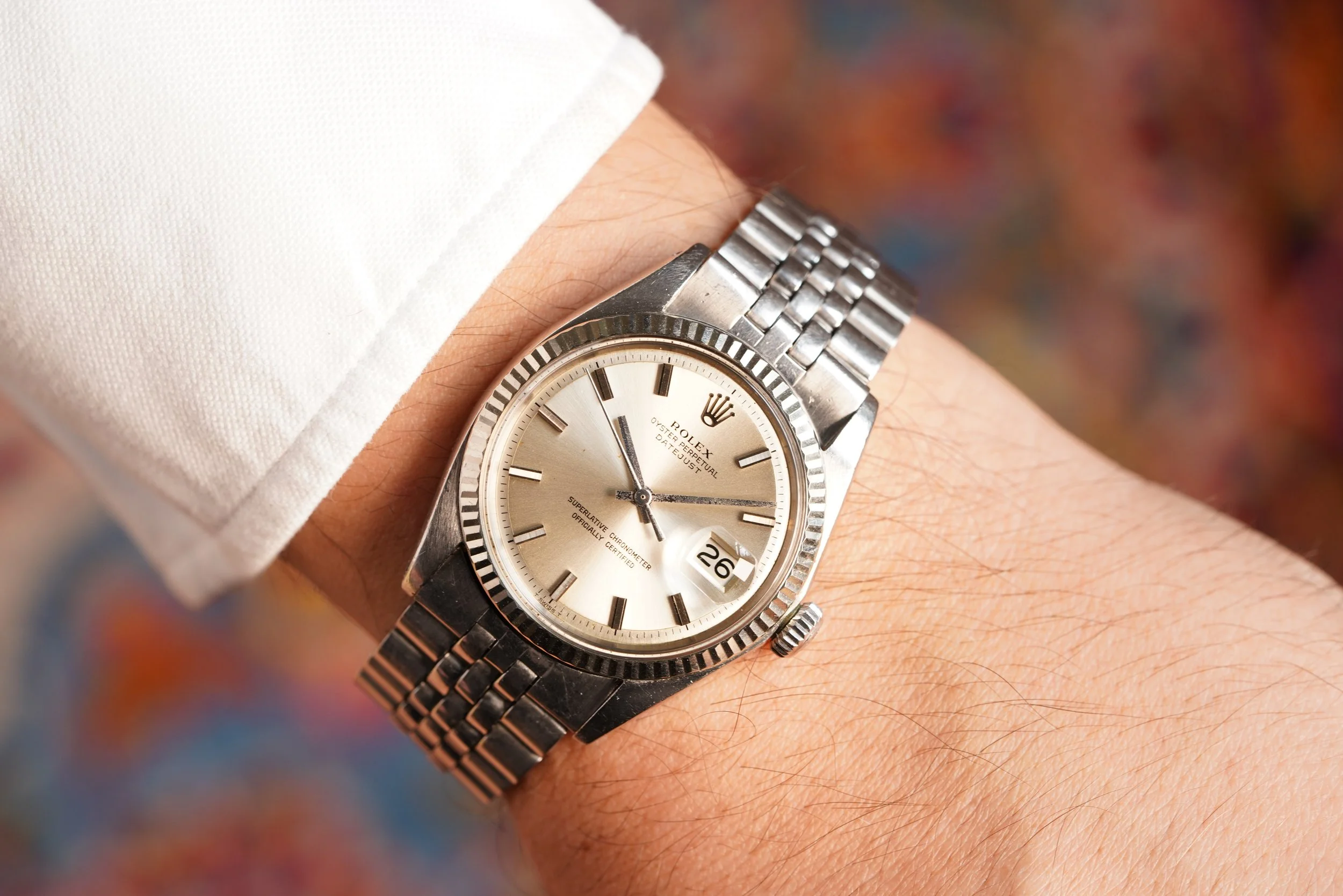 This Rolex dates to the early 1970s. The 36mm case is in great condition, and remains unpolished. Its dial is a highly legible silver sunburst finish with applied indexes.