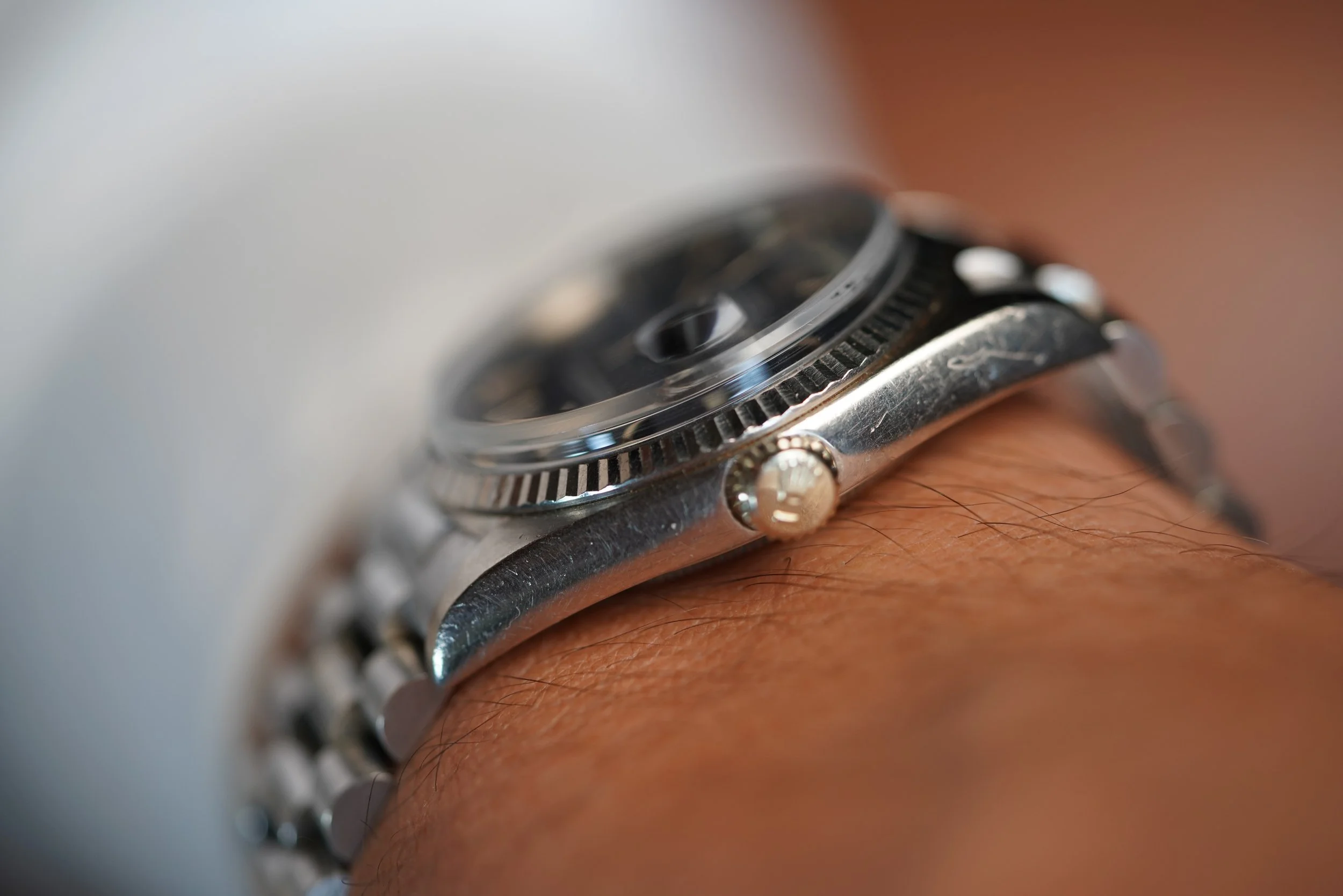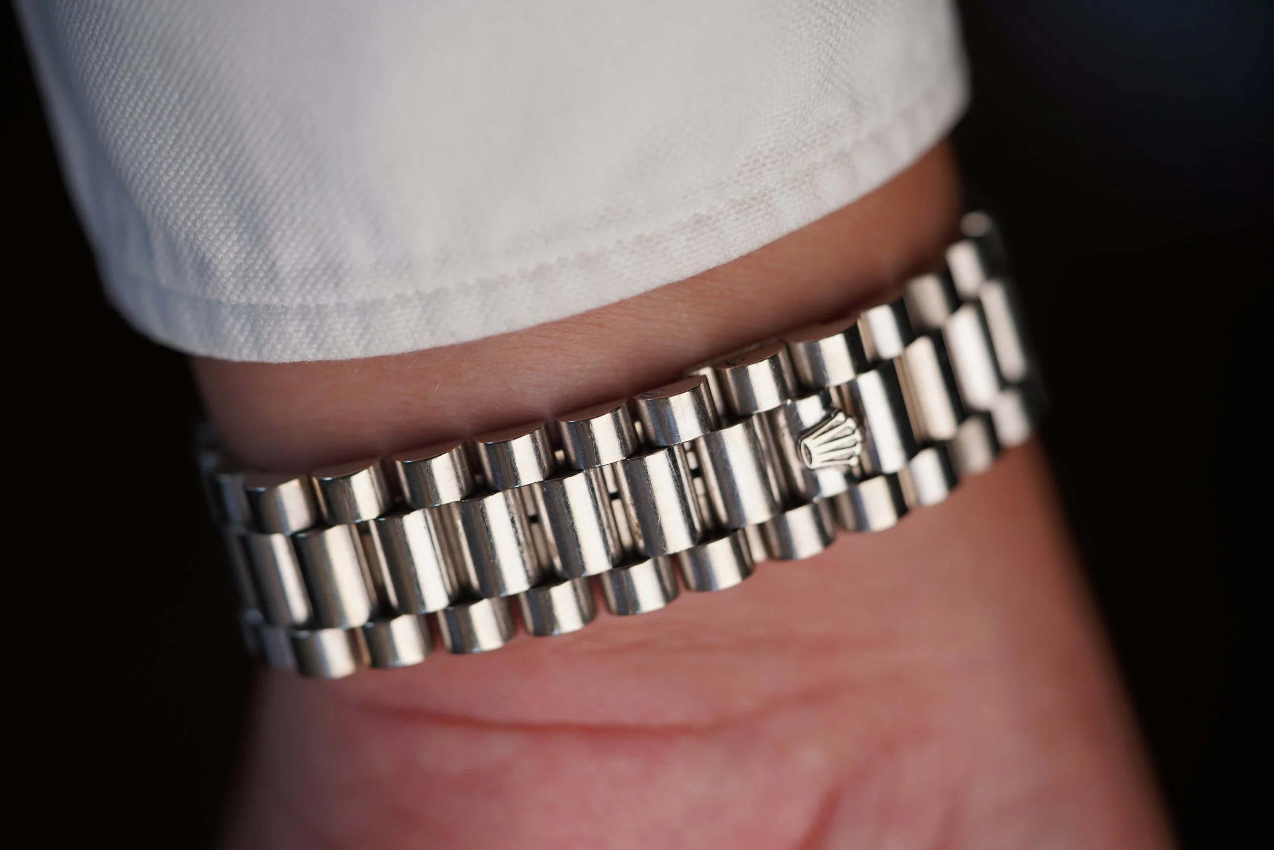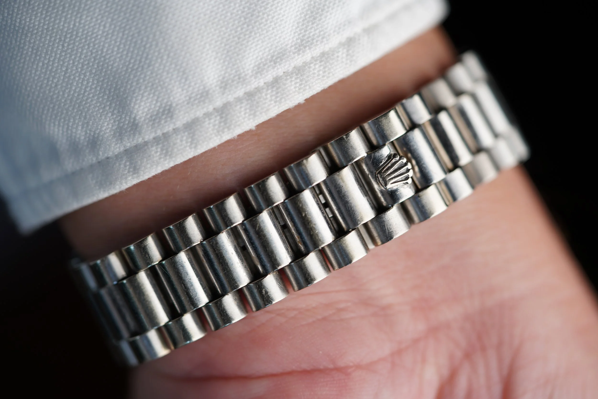 This Rolex Day-Date reference 1803 is a very cool example in white gold on the rare Presidential bracelet. It features a very attractive blue dial. The watch features a 4.0M serial, which dates to circa 1976. The white gold case and bracelet appear to be unpolished. This watch is extremely interesting and one of my favorite Day-Dates we have offered.