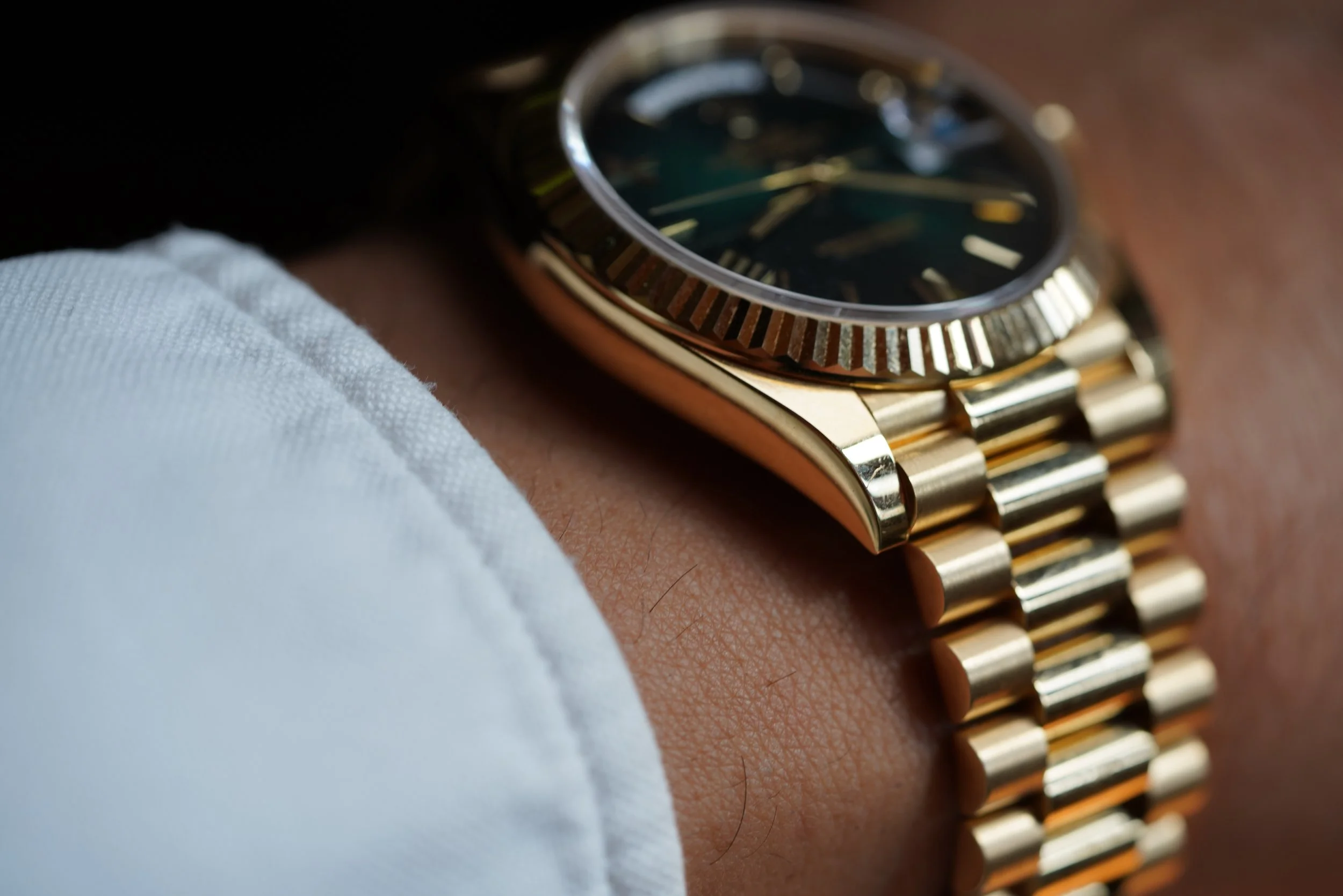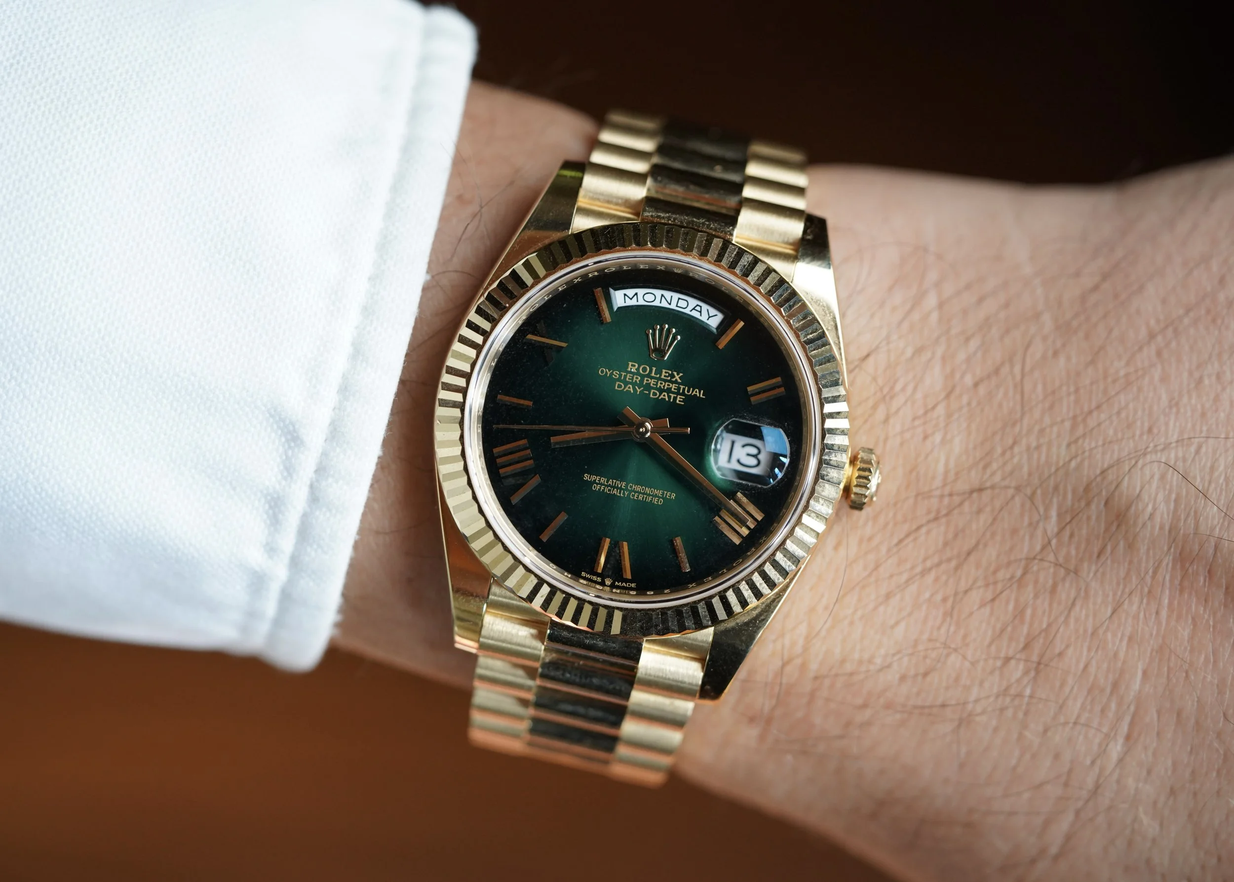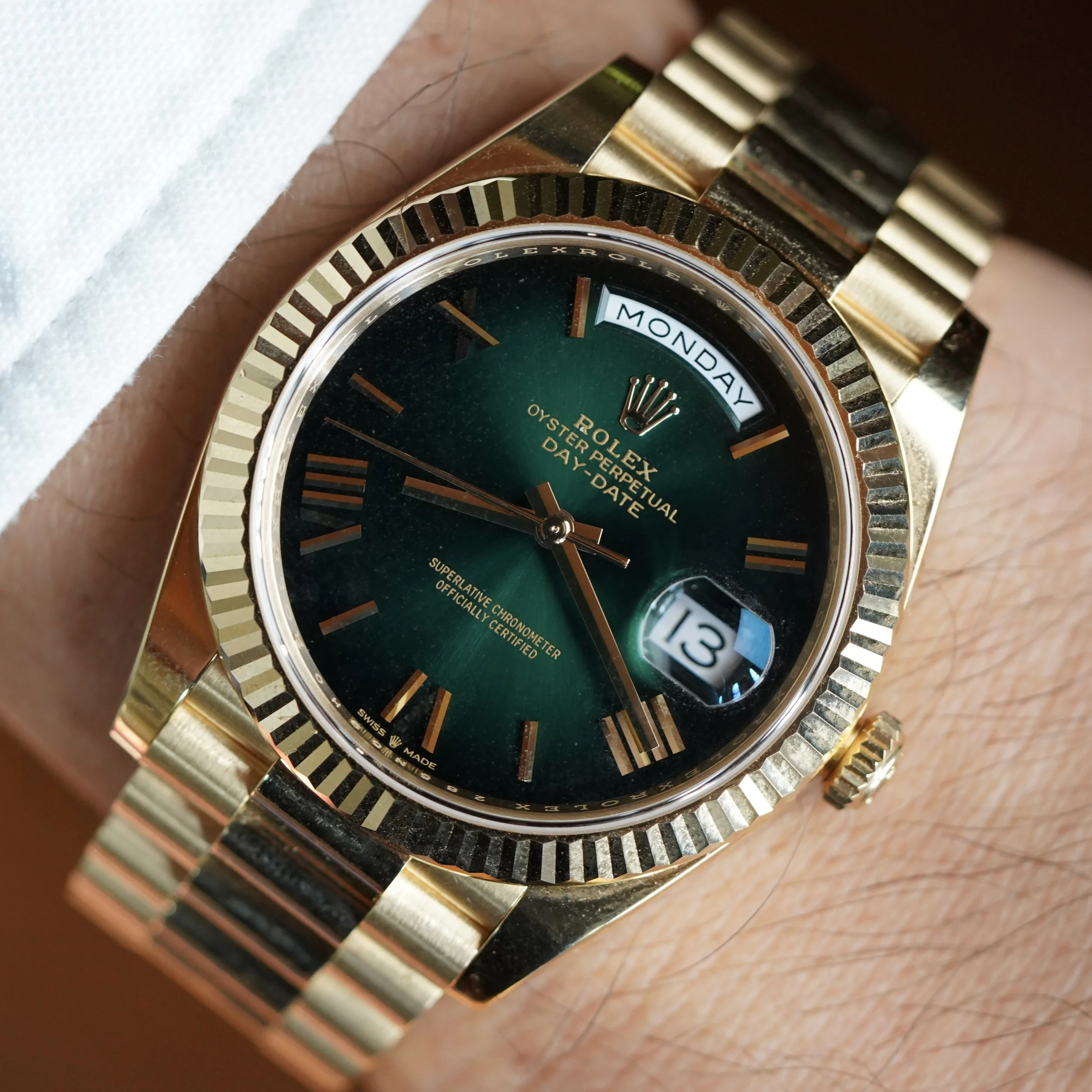 The Rolex Day-Date is a luxurious watch. The green Ombre dial with Roman numerals are very sophisticated and rich. The watch is a reference 228238. It comes with full links. The case measures 40mm in diameter and is made of 18k yellow gold.