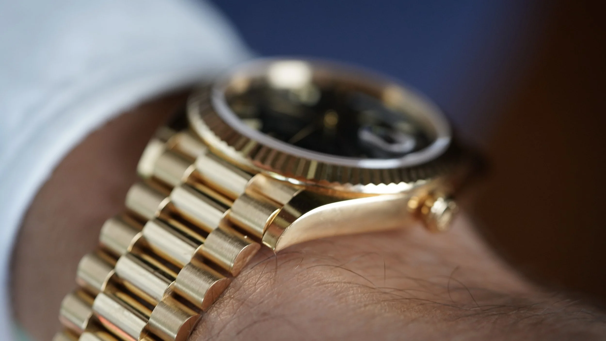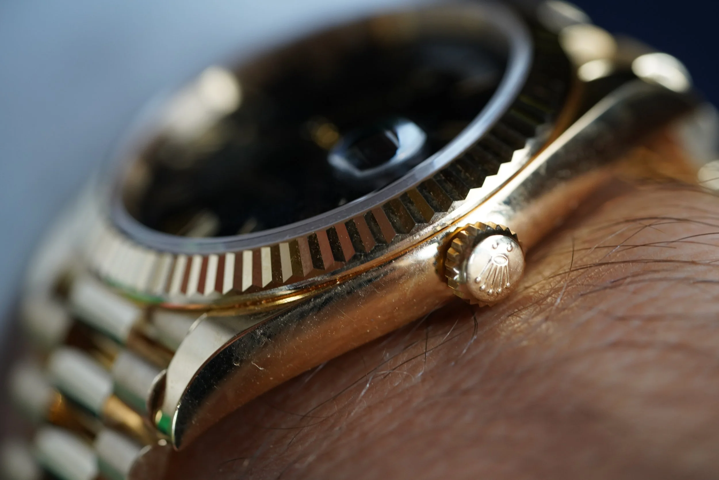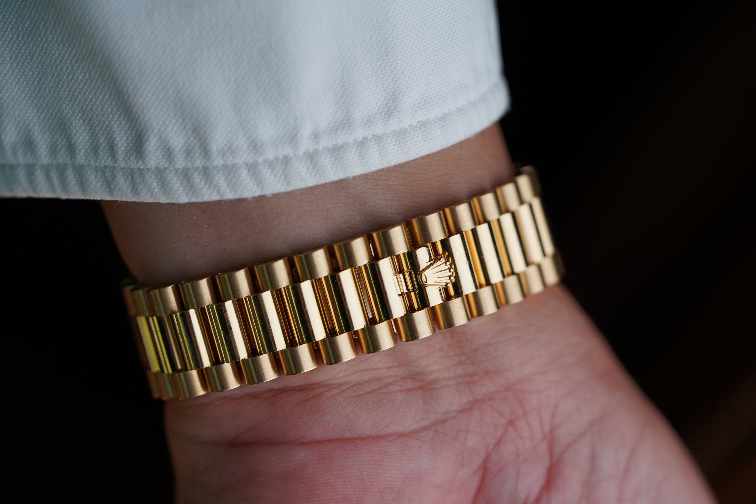 The Rolex Day-Date is a luxurious watch. The green Ombre dial with Roman numerals are very sophisticated and rich. The watch is a reference 228238. It comes with full links. The case measures 40mm in diameter and is made of 18k yellow gold.