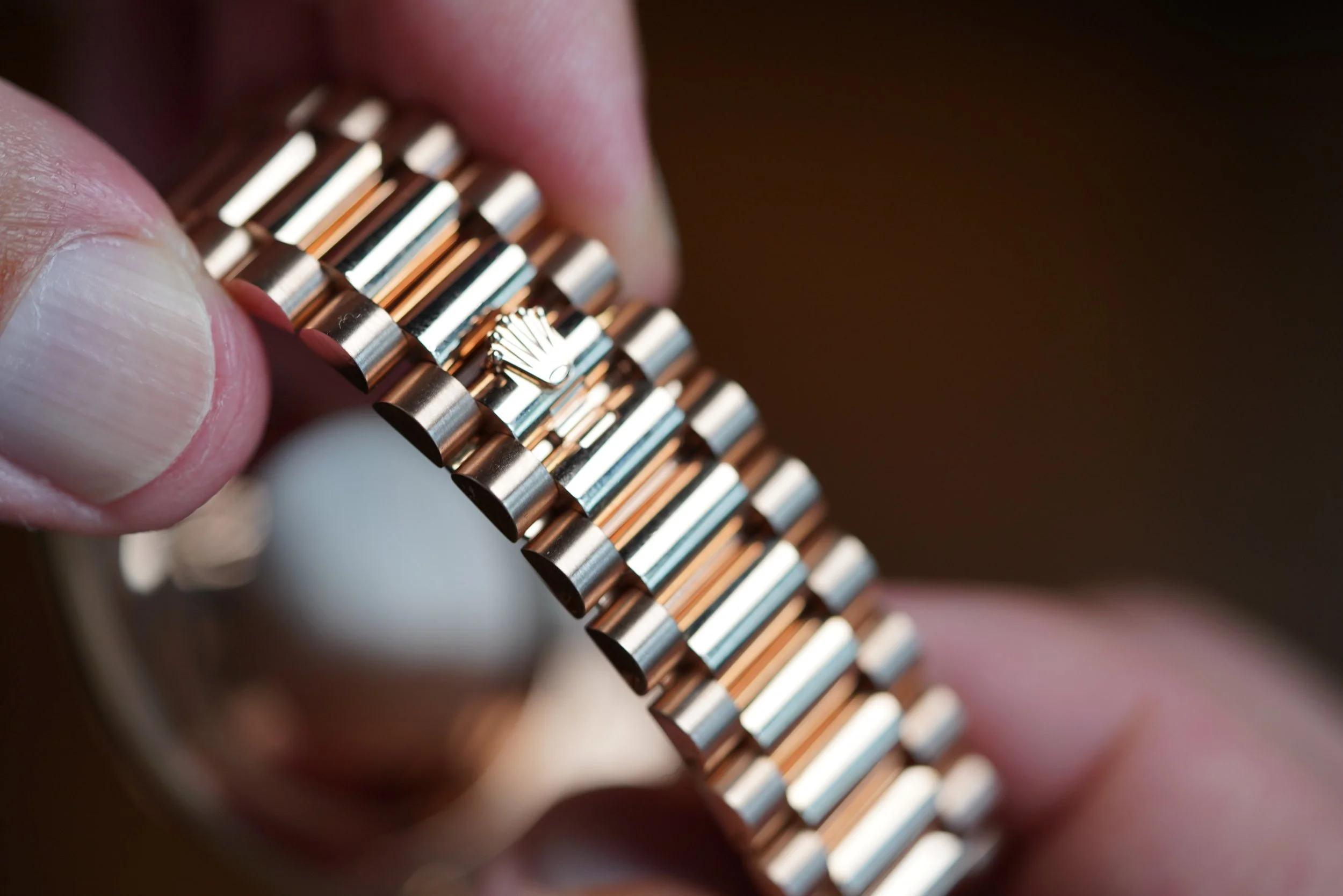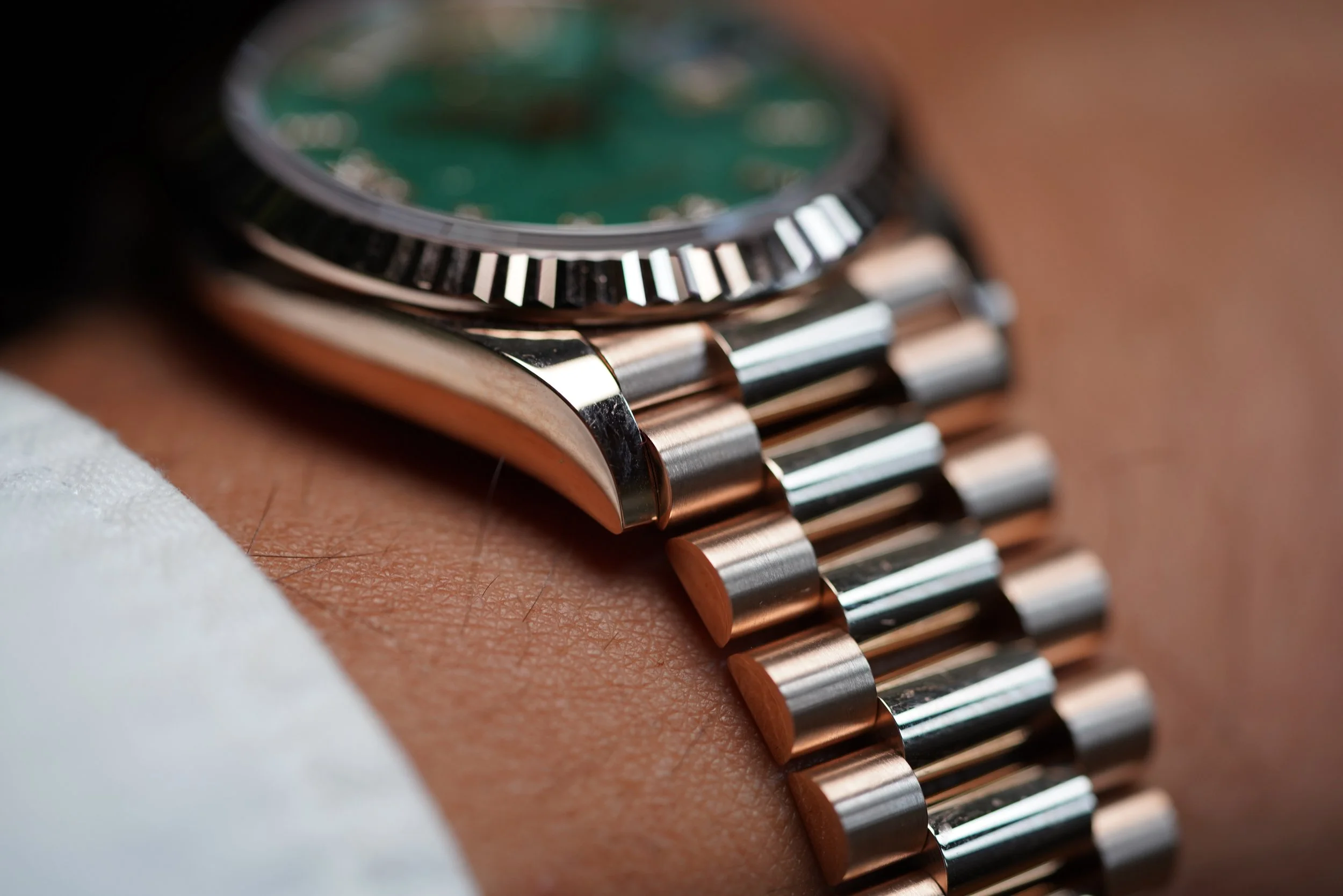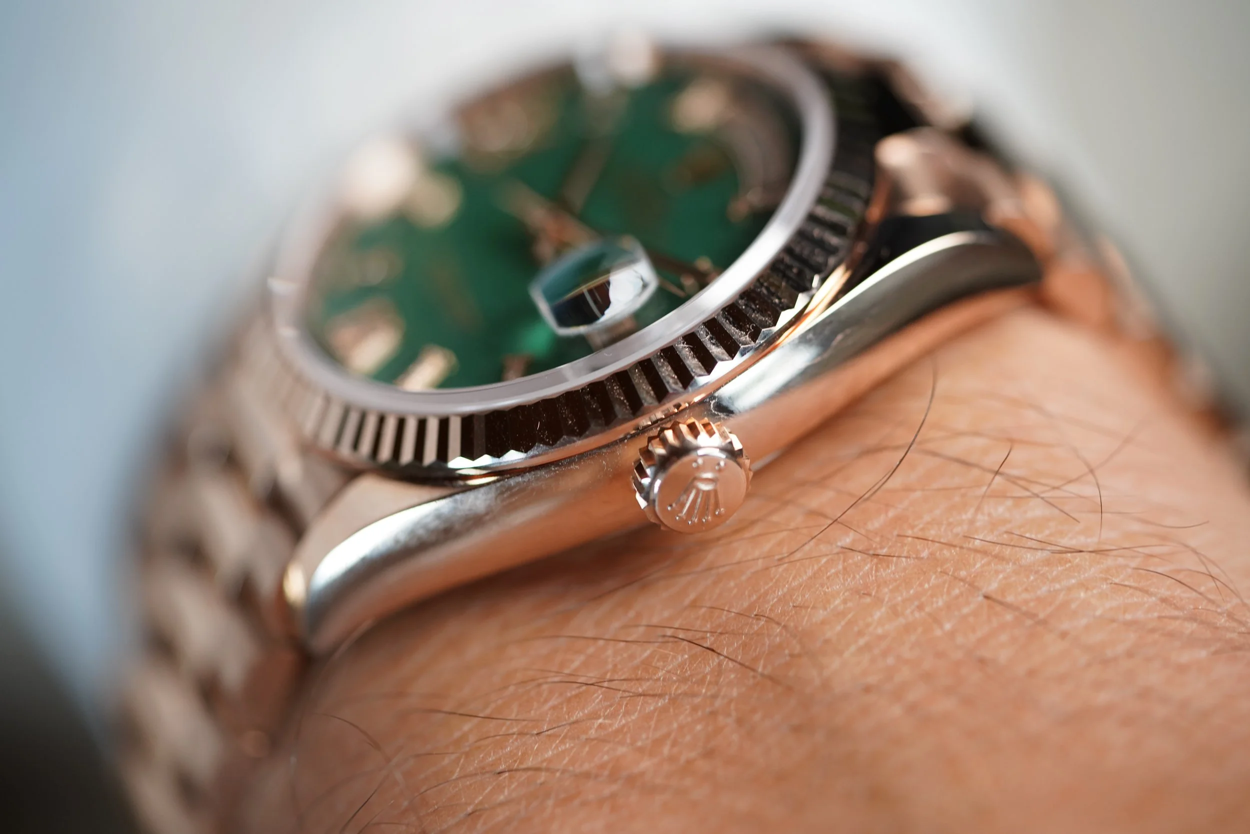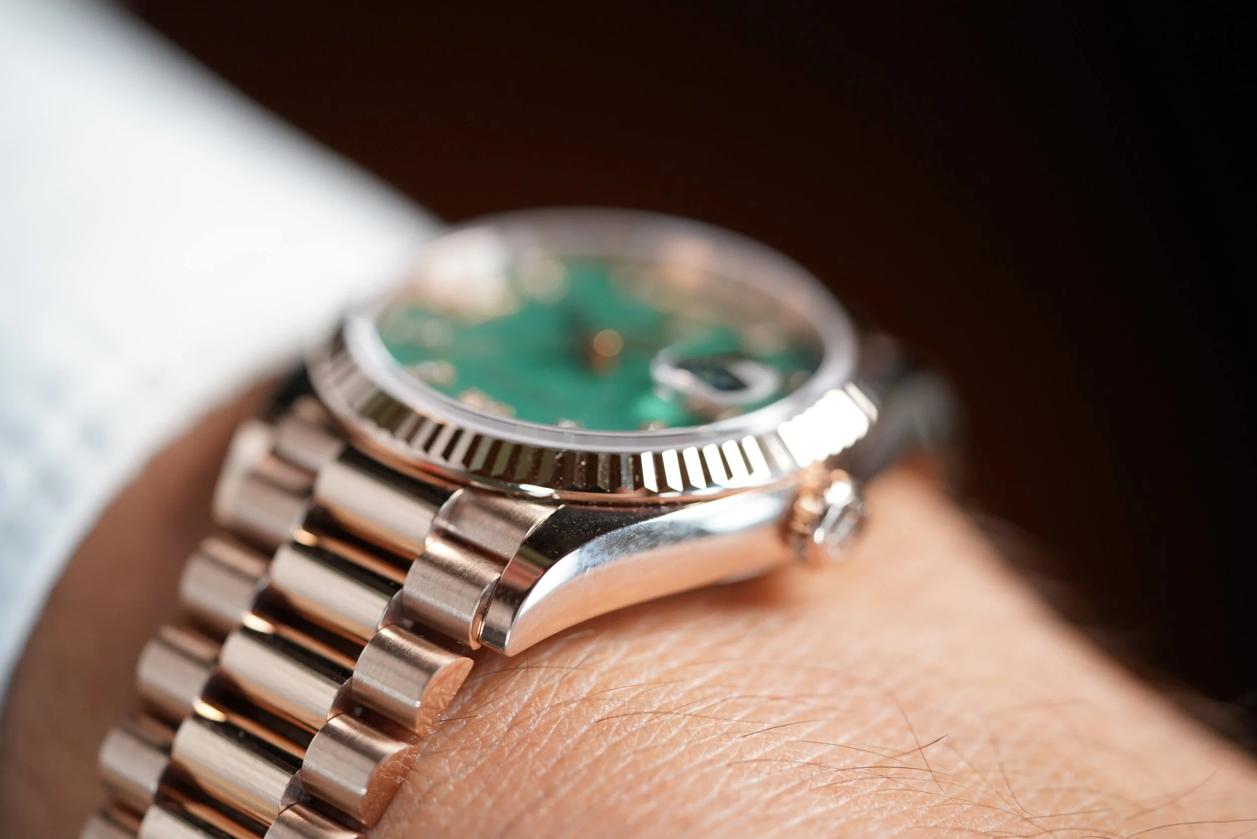 This Everose gold Day-Date, in outstanding condition, is a great watch from the current classic catalogue. It features a “Green Aventurine” dial with Roman numeral indexes set with diamonds. The watch is powered by the Rolex Calibre 3255, with a 70-hour power reserve and a double quick-set day and date function. The case measures 36mm in diameter and approximately 43mm lug-to-lug.