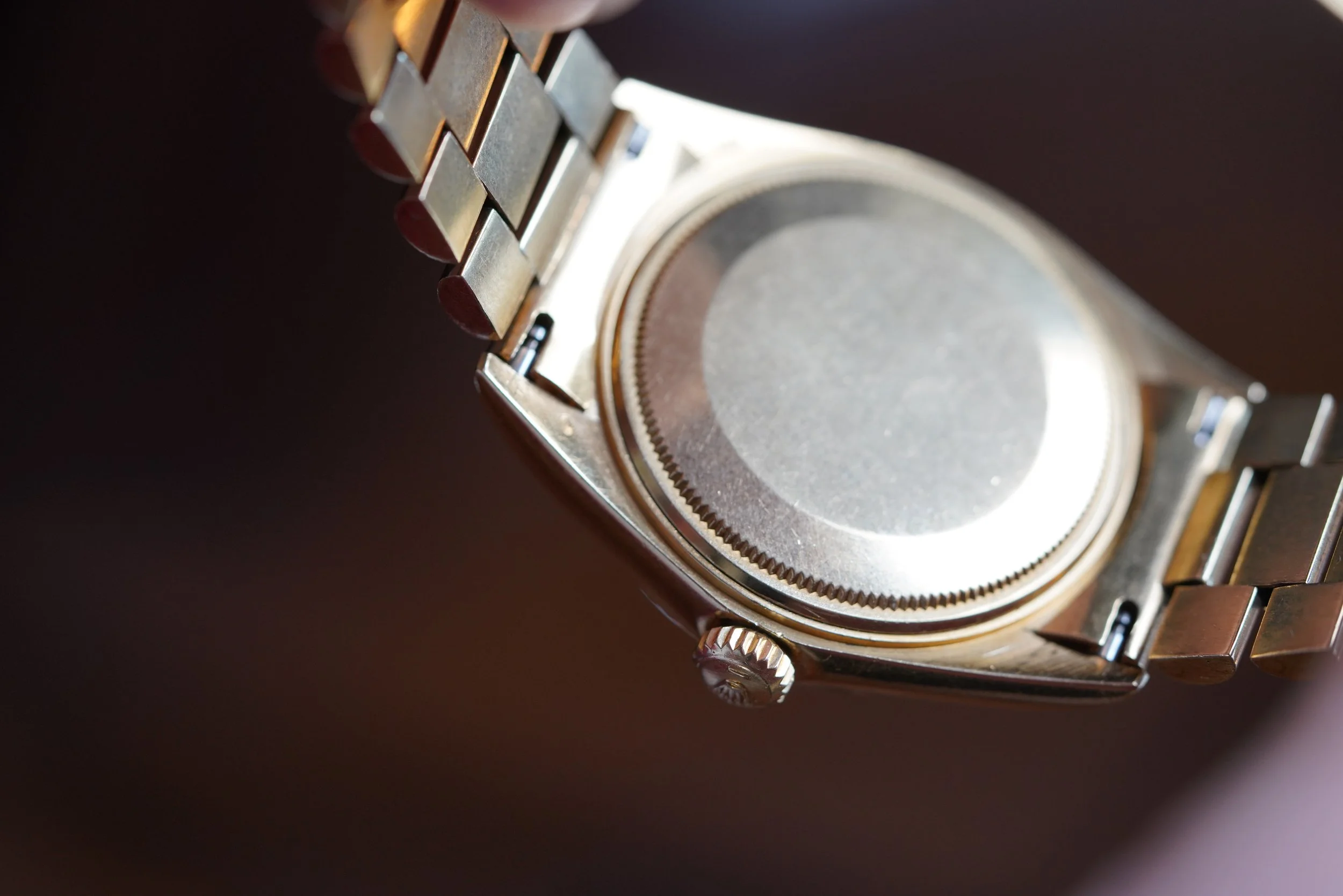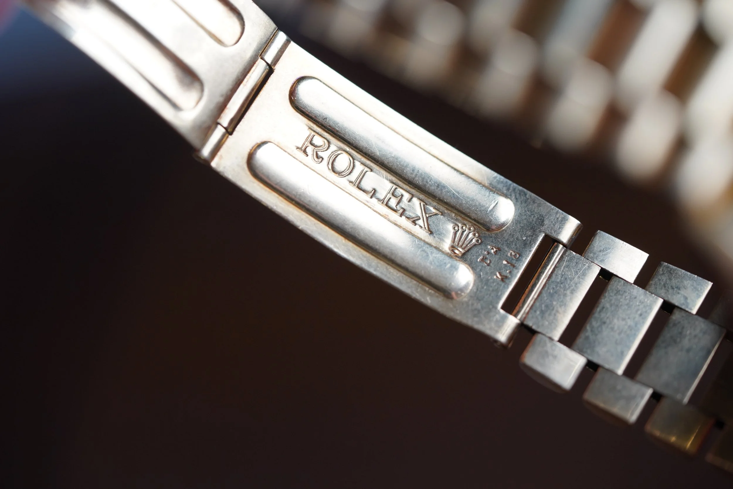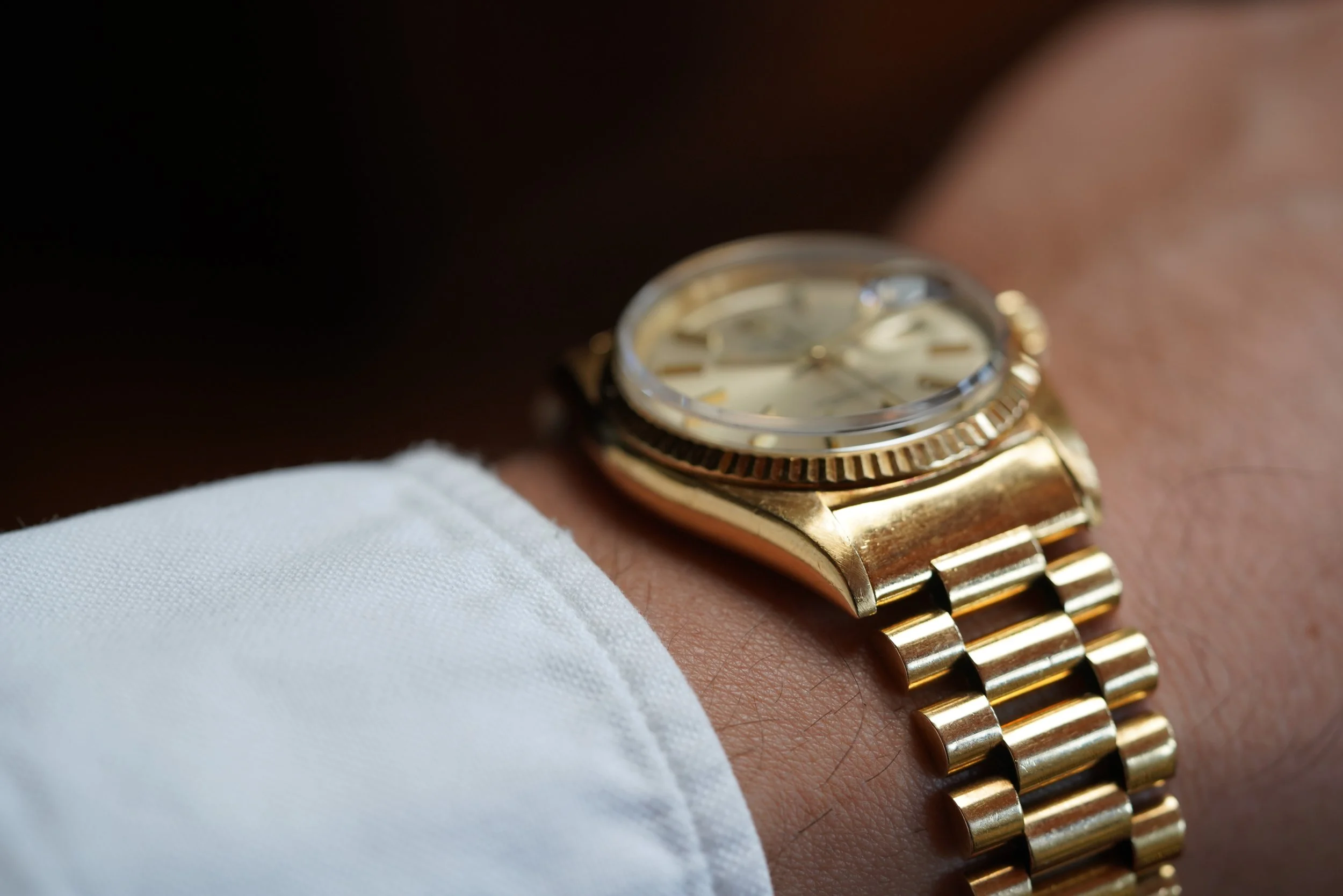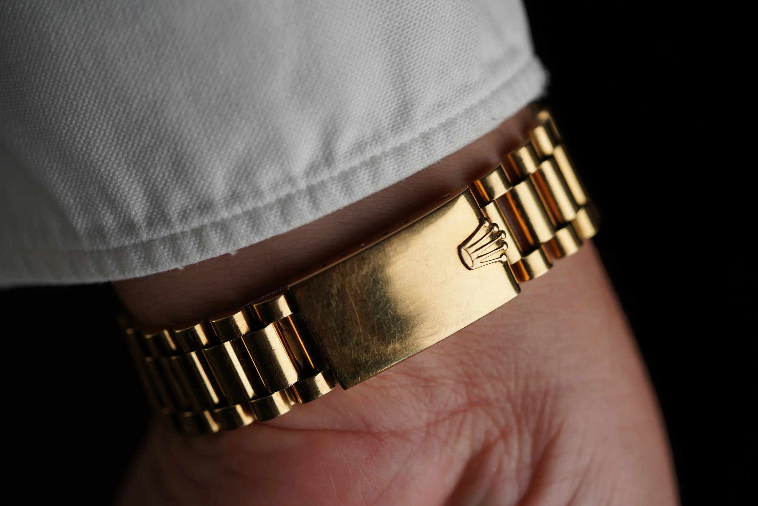 This Rolex Day-Date reference 1803 is a super sharp example and a great vintage Rolex. It measures 36mm in diameter. It features a 2.41M serial dating to circa 1970. The champagne dial is in nice condition. The case has been polished. The watch features a Spanish date wheel. It comes with an 18k gold Rolex President bracelet made by D’Agosto for the Venezuelan market.