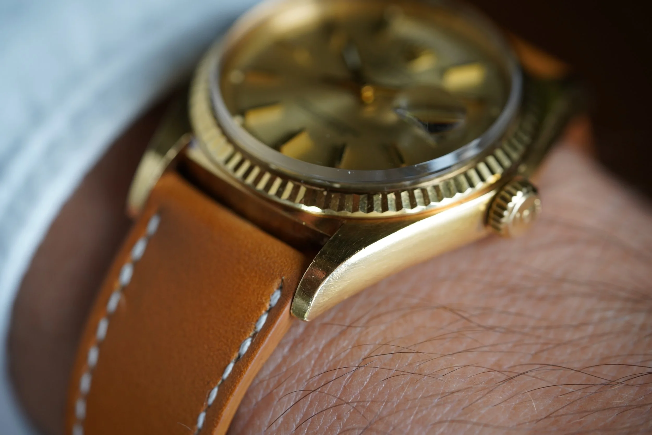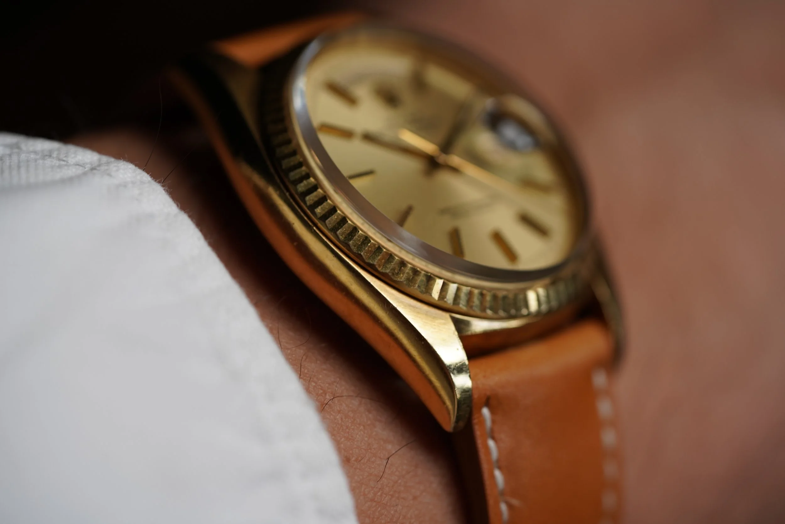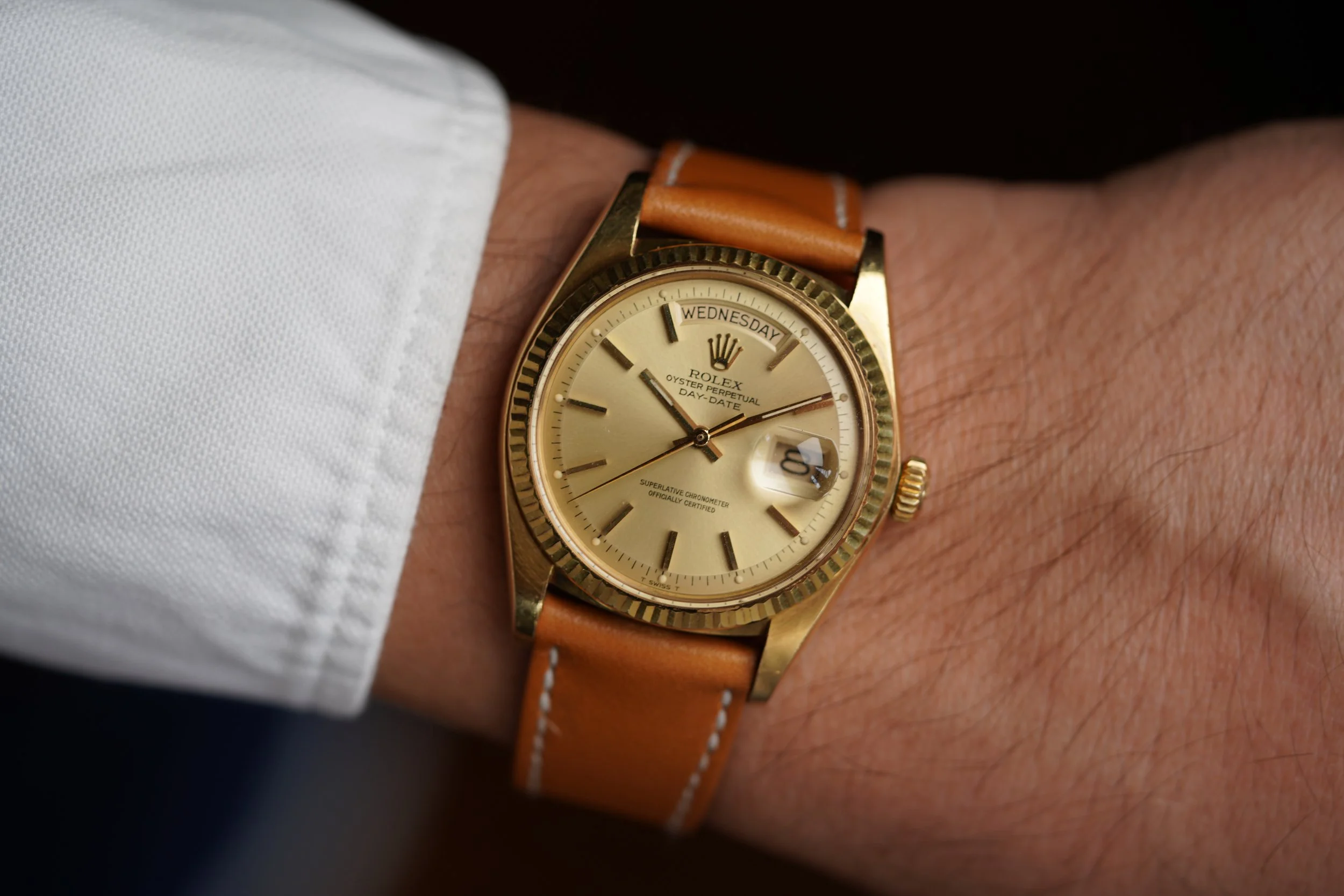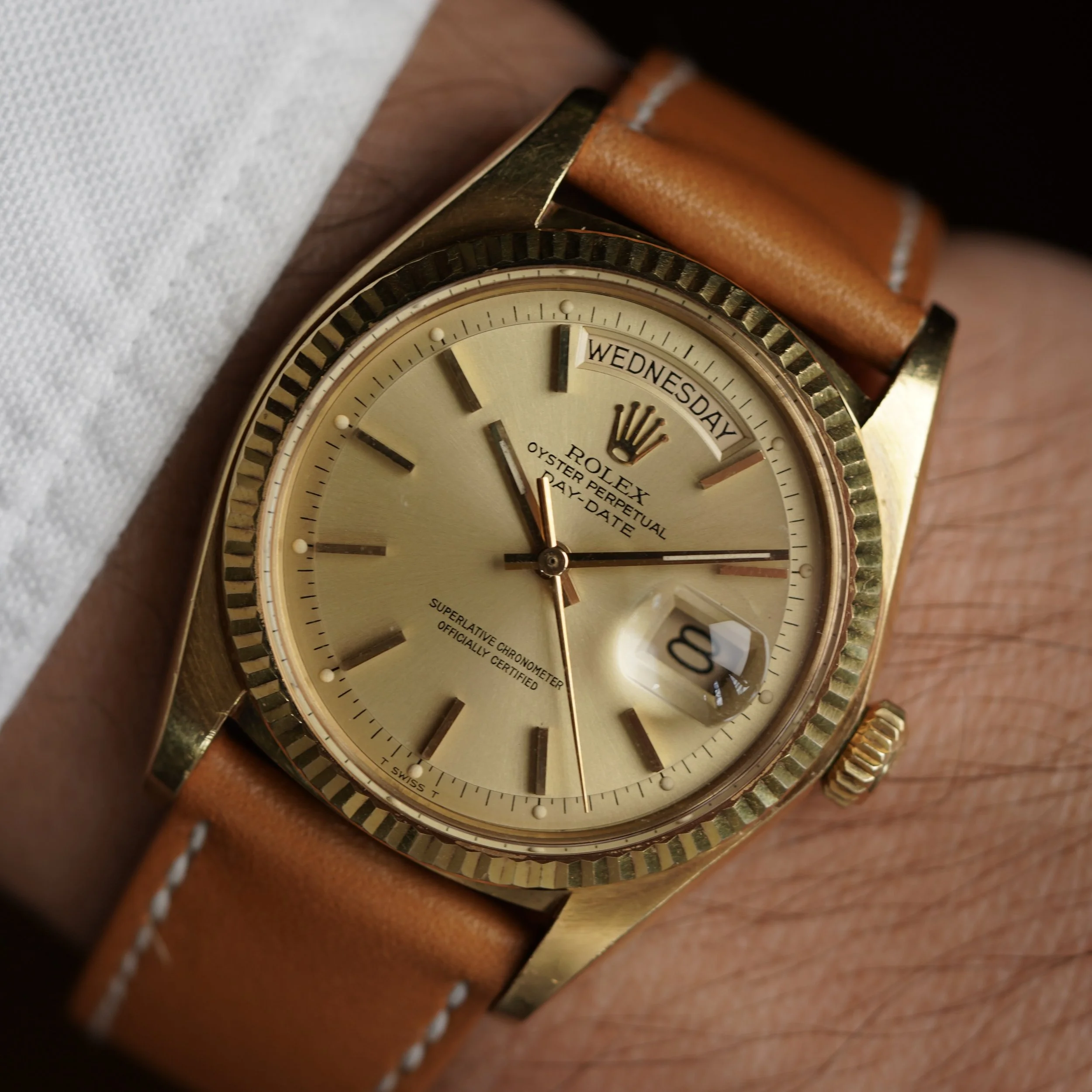 This Rolex Day-Date reference 1803 is an outstanding example. The 18K yellow gold case appears to be unpolished. It measures 36mm in diameter. It features a 4.01M serial dating to 1975. The champagne dial is incredibly attractive. It is paired on a beautiful tan leather strap.