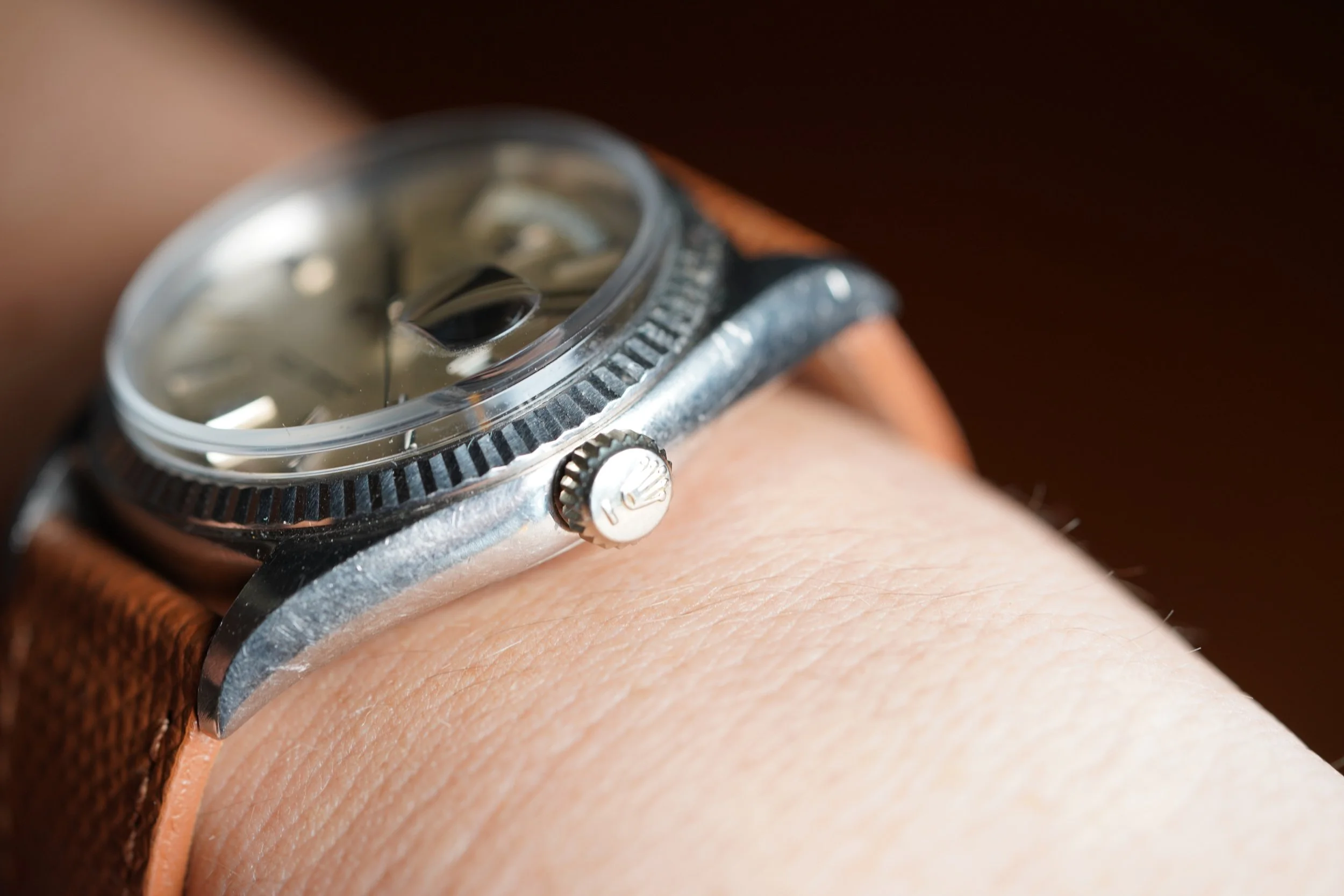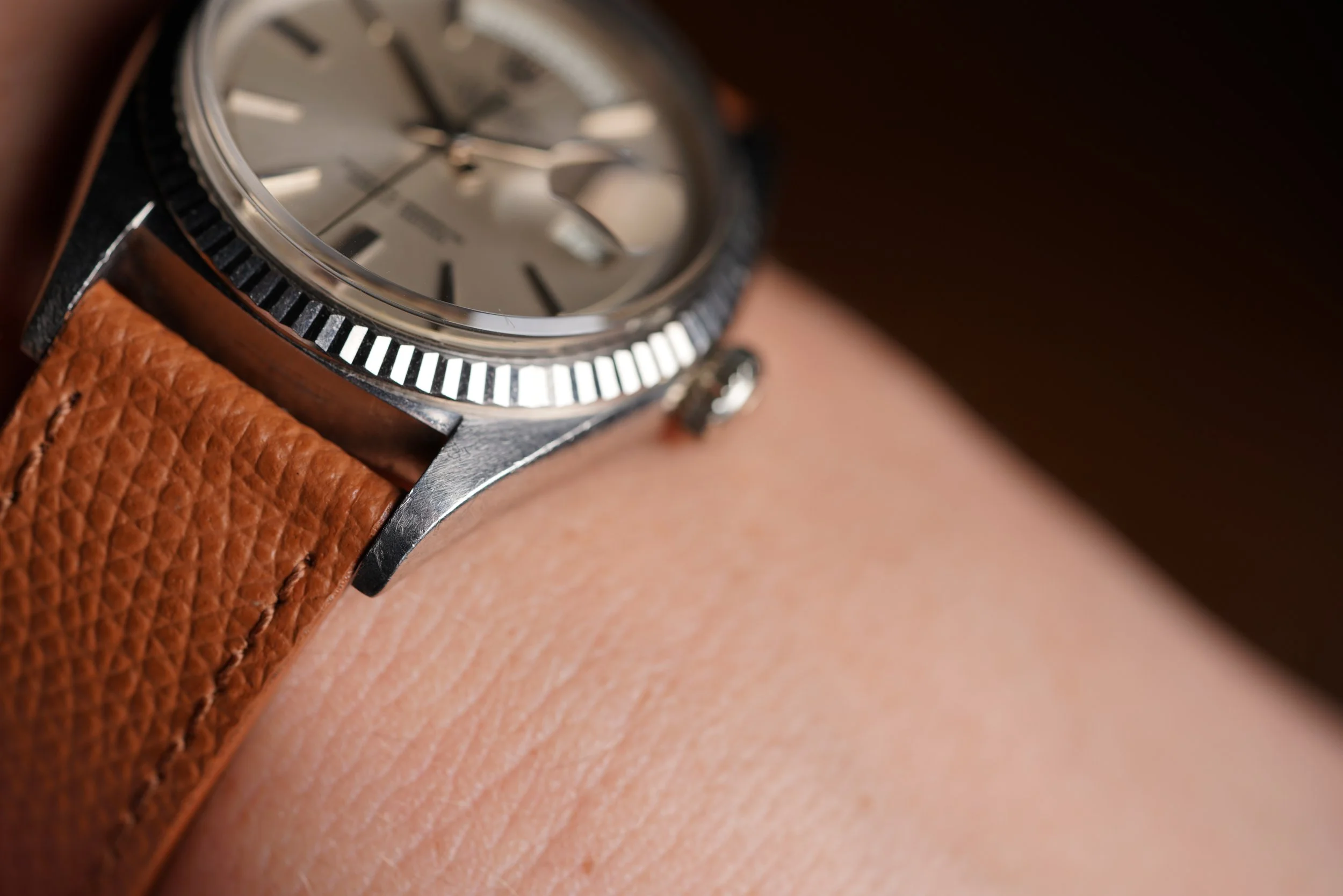 The Rolex Day-Date was introduced in 1956 and was the first watch to display the date, as well as the fully-spelled-out day of the week. This reference 1803 is an awesome watch with a very attractive silver “doorstop” dial. It is non luminous. The 18K-white gold case measures 36mm in diameter (43mm lug-to-lug). This particular example has a 2.27 serial dates to circa 1970. It is paired on a leather strap and steel buckle.