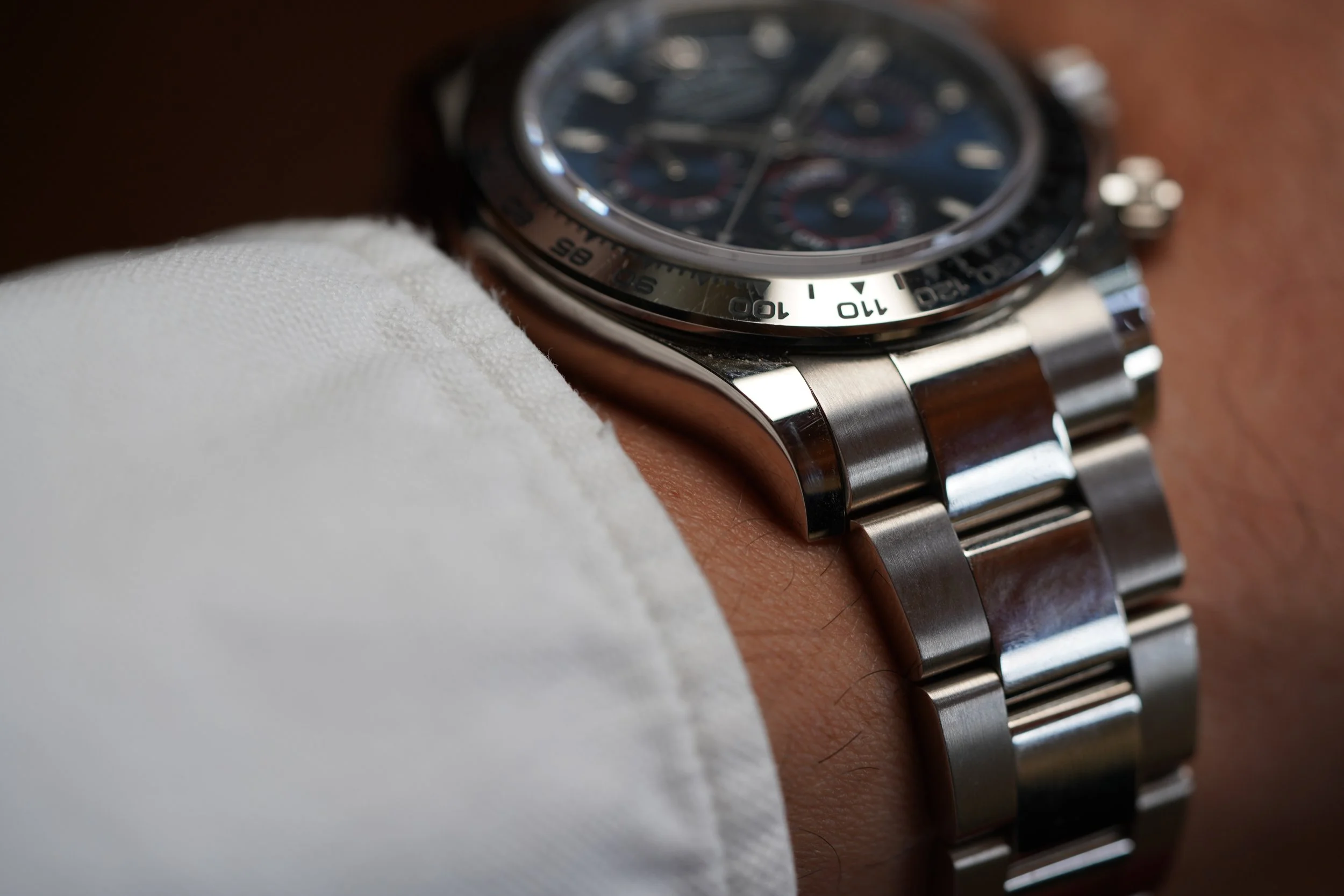 This Rolex Daytona reference 116509 is an awesome sports watch in white gold. It features a beautiful blue dial. The case is in great shape, it appears to be unpolished with minor scratches, and measures 40mm in diameter.