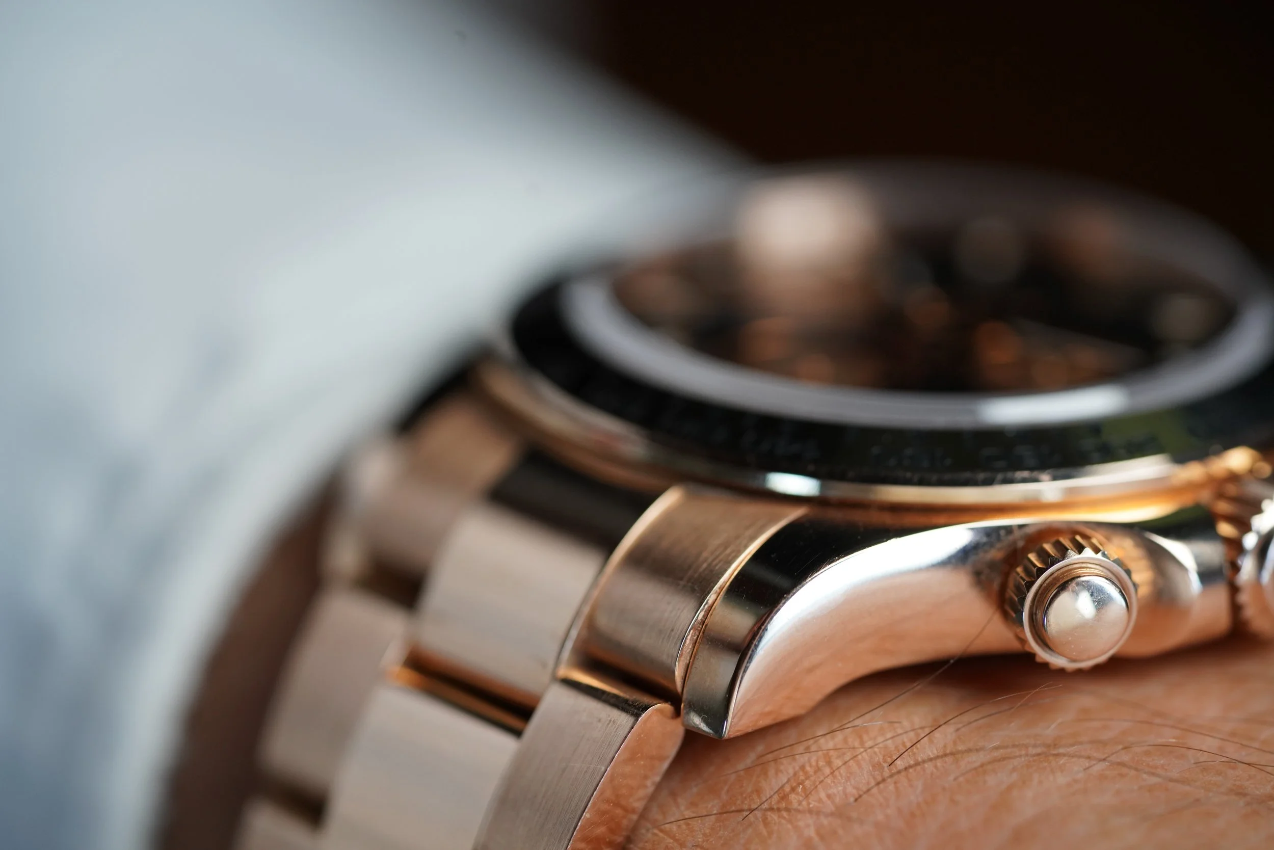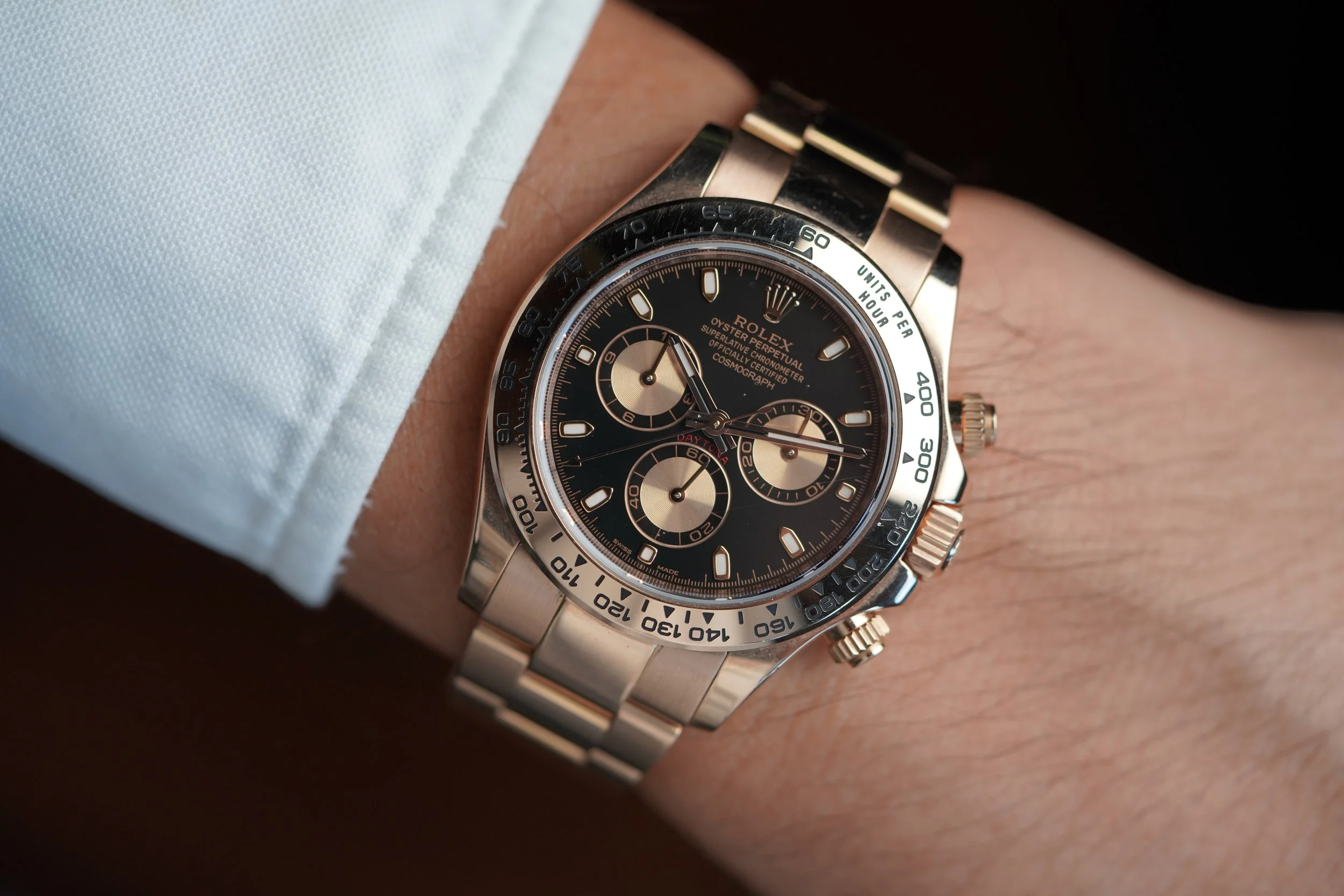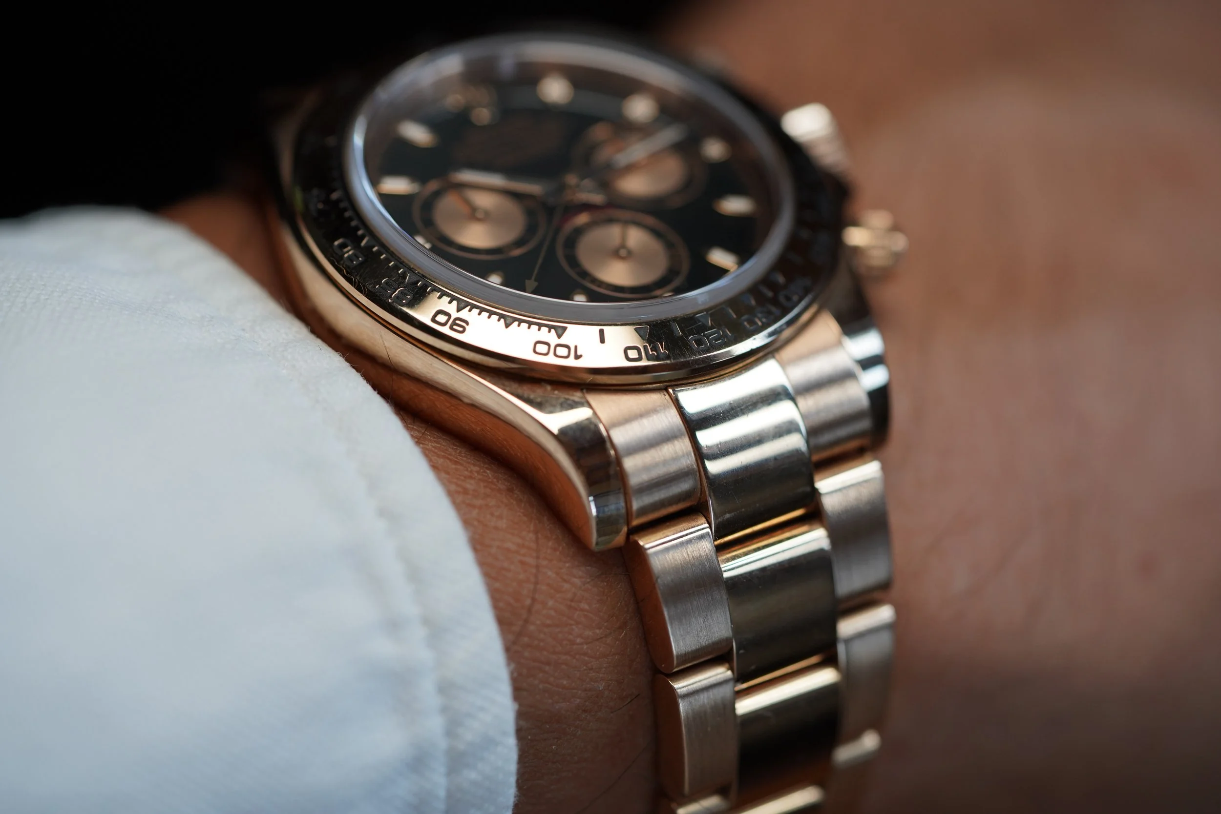 The Rolex Daytona Cosmograph reference 116505 is one of the most luxurious sport watches in the world. The everose case is has been polished in the past. It is in great condition.