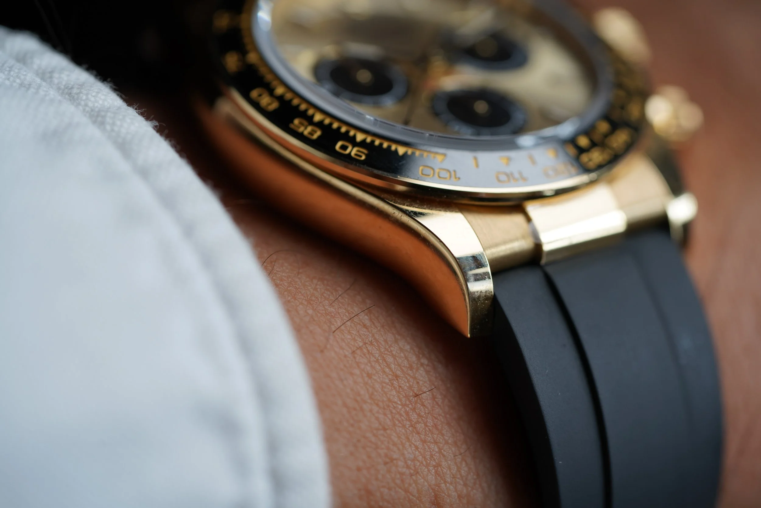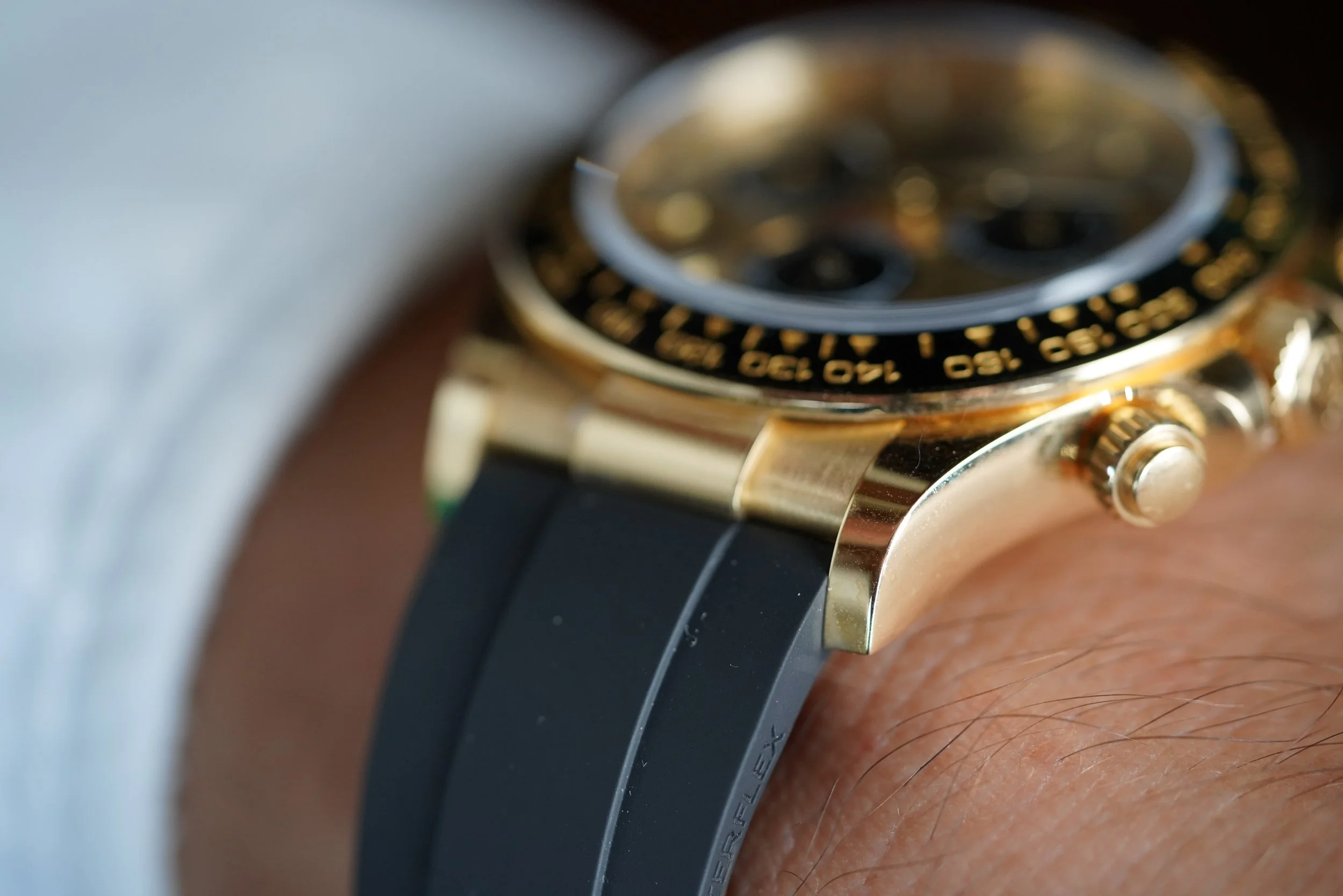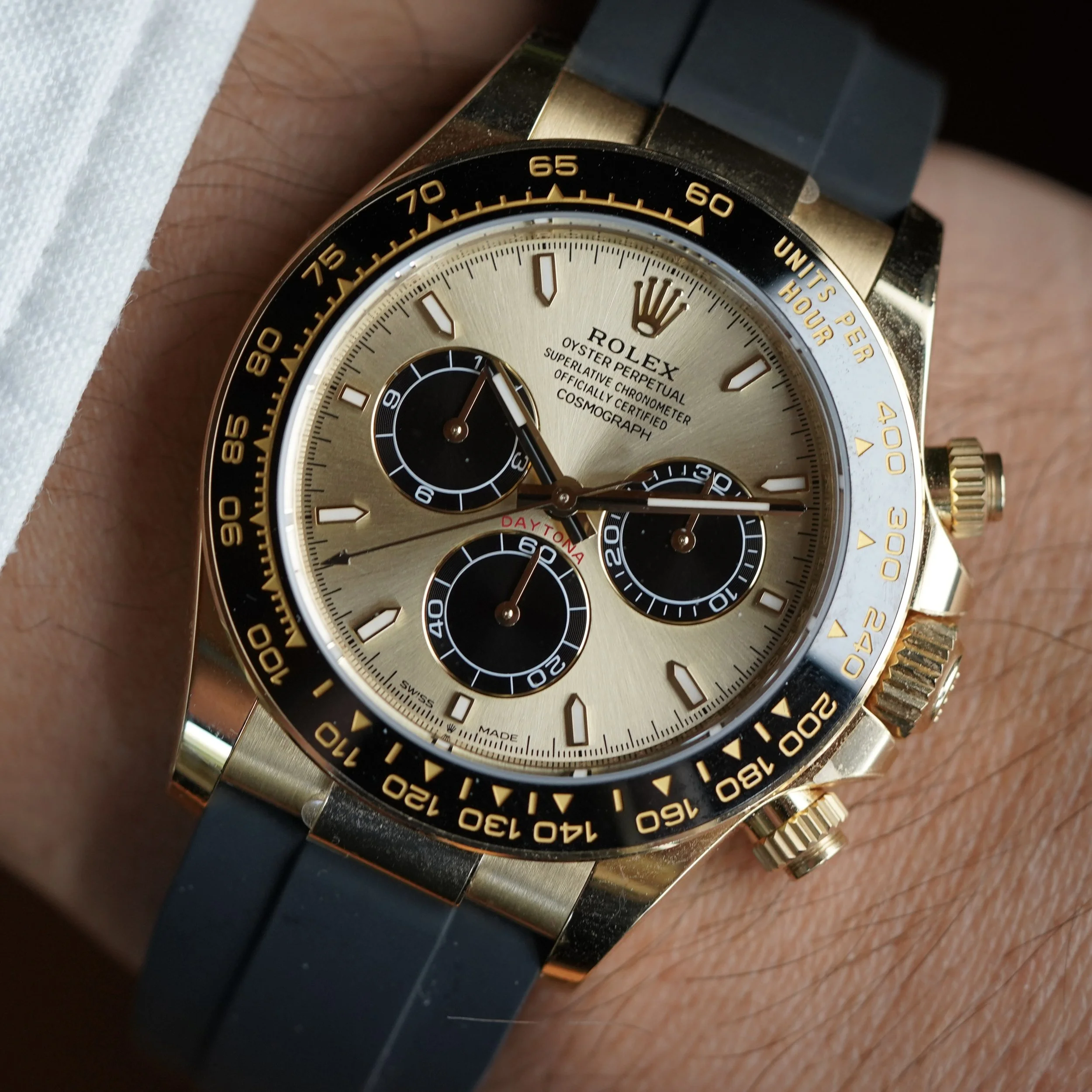 This Rolex Daytona is a great modern example in 18k yellow gold the Oysterflex rubber bracelet. It features the attractive champagne dial with black sub dials. The watch is in great condition, we believe it to be unpolished, and the clasp is partially stickered. We believe the case is unpolished. The Oysterflex bracelet features an F size strap at 12 o’clock and a D size strap at 6 o’clock. We do not know the service history, but the watch is running well. It does not come with a box or papers.