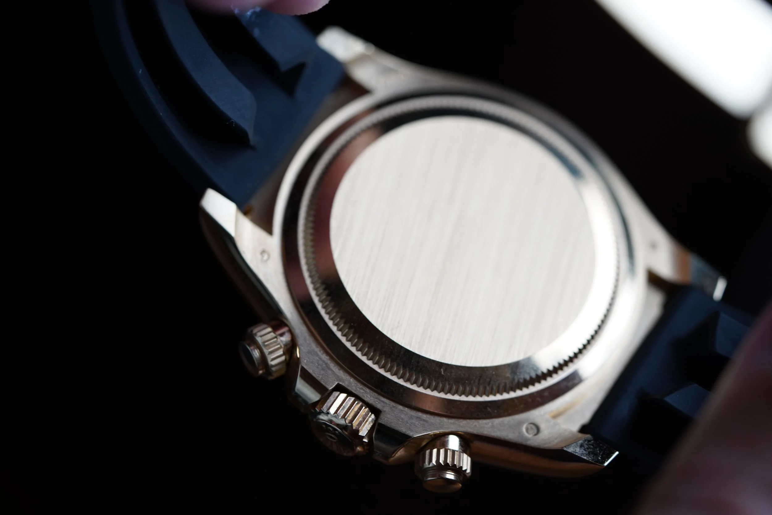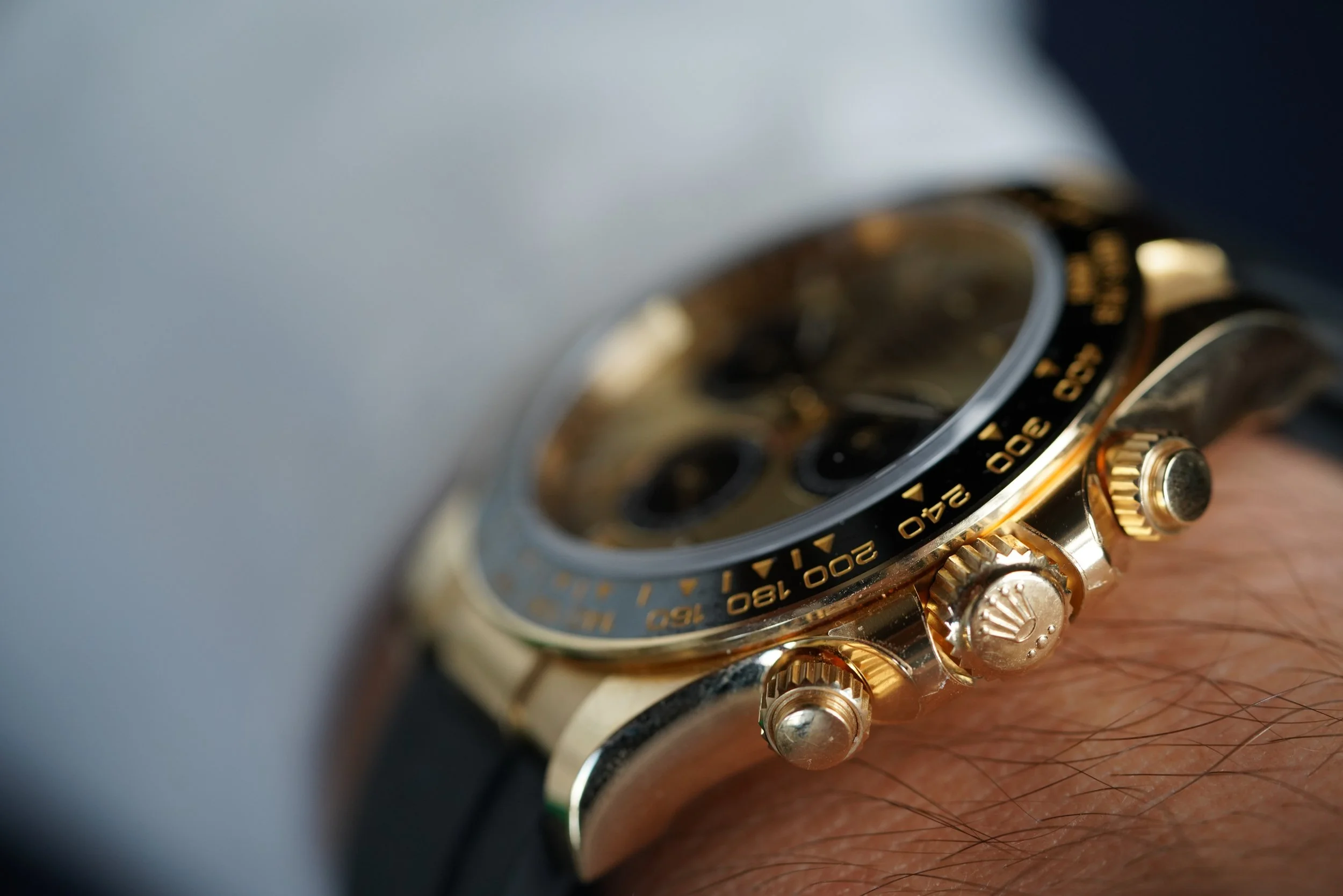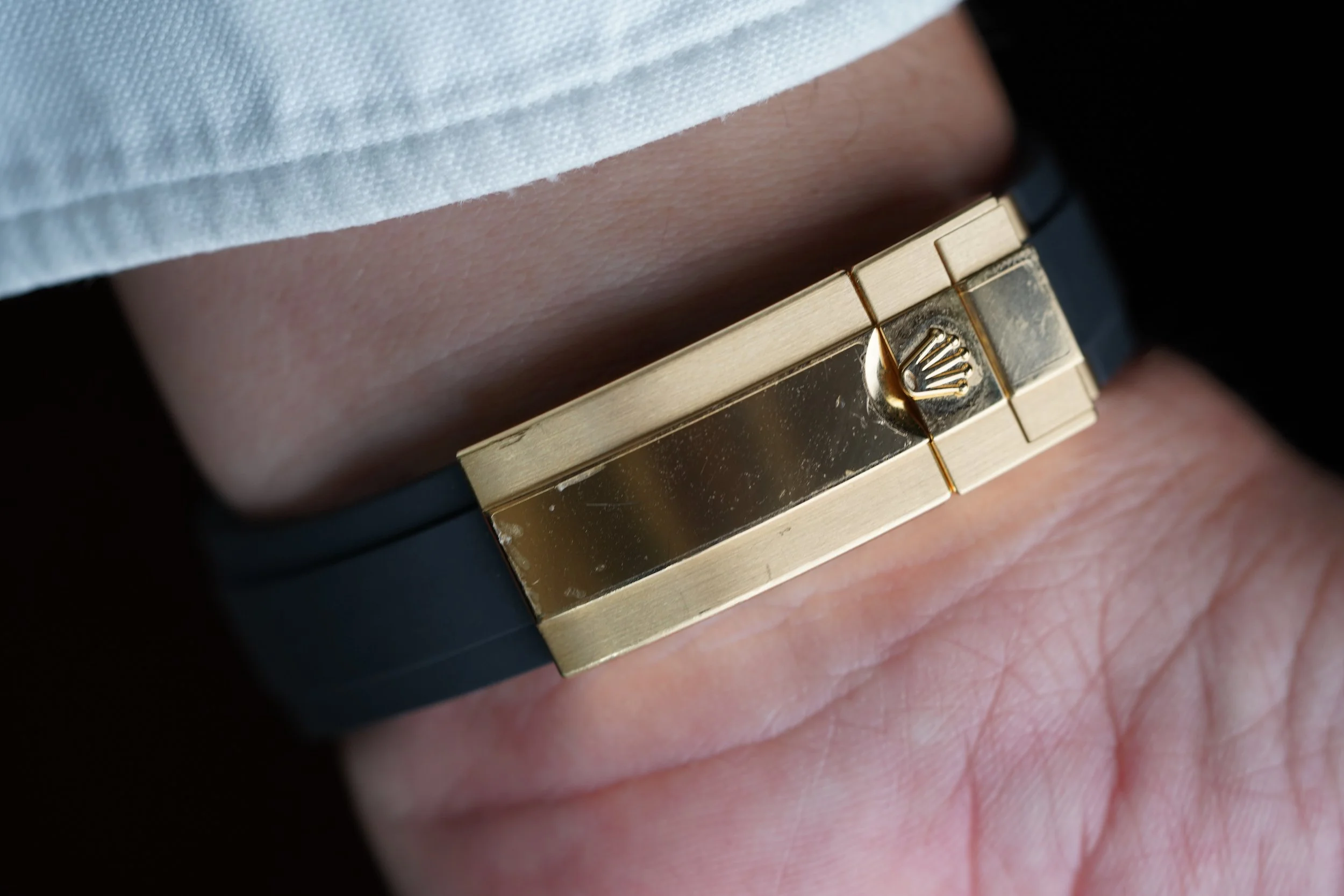 This Rolex Daytona is a great modern example in 18k yellow gold the Oysterflex rubber bracelet. It features the attractive champagne dial with black sub dials. The watch is in great condition, we believe it to be unpolished, and the clasp is partially stickered. We believe the case is unpolished. The Oysterflex bracelet features an F size strap at 12 o’clock and a D size strap at 6 o’clock. We do not know the service history, but the watch is running well. It does not come with a box or papers.