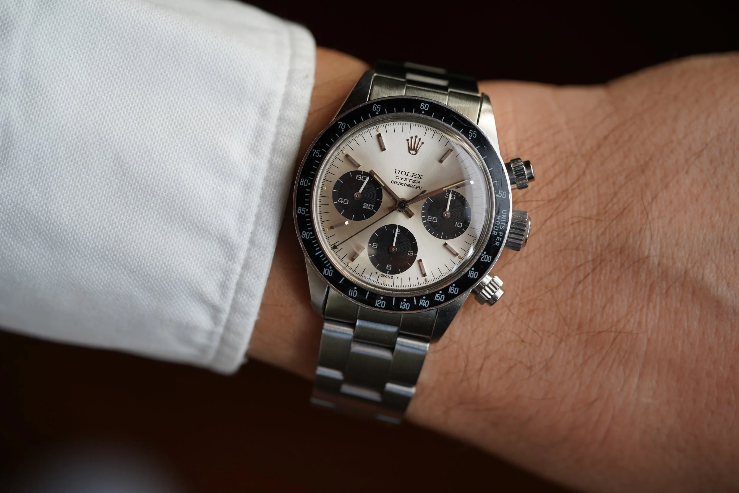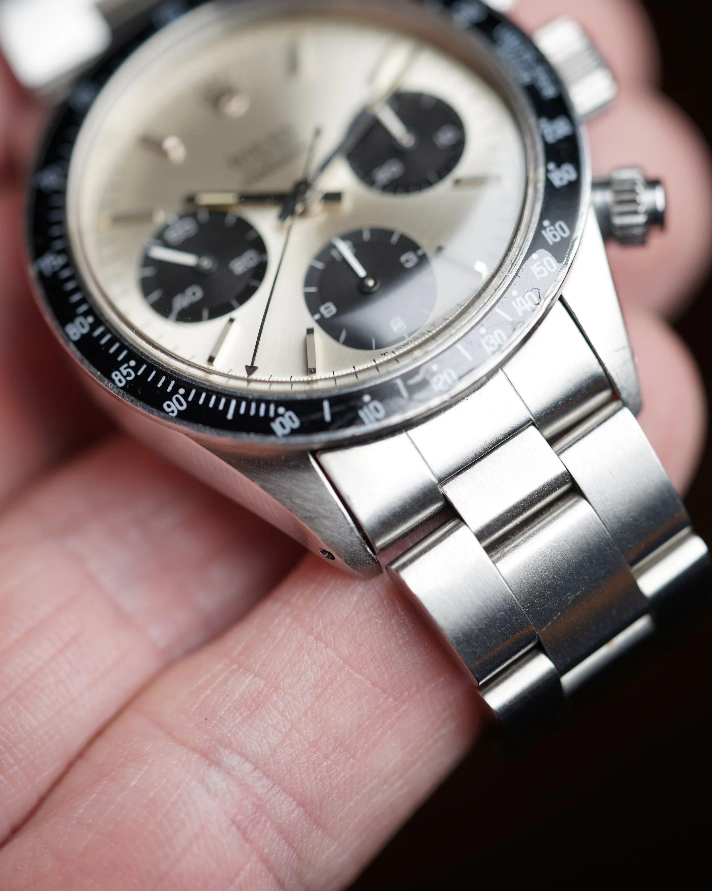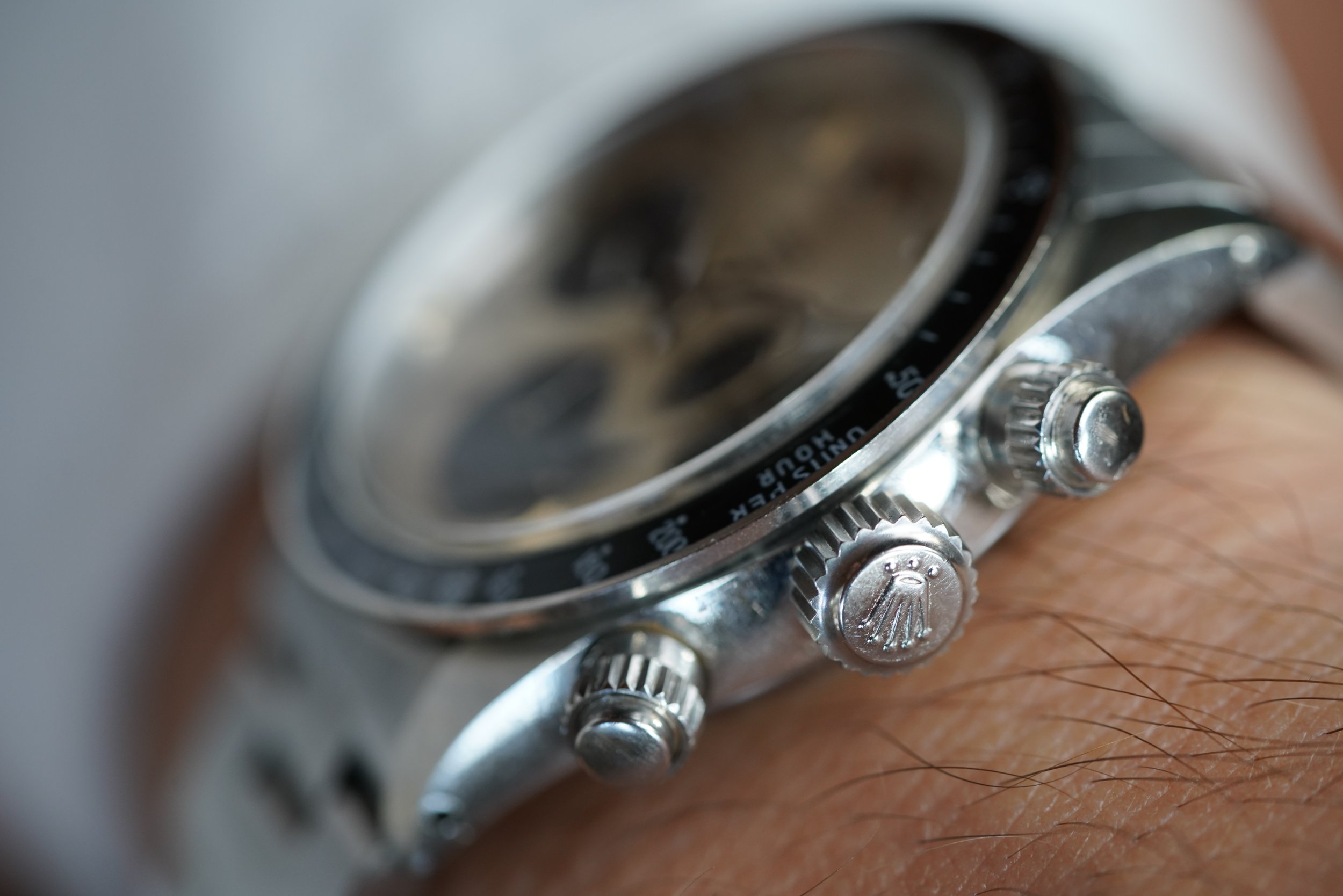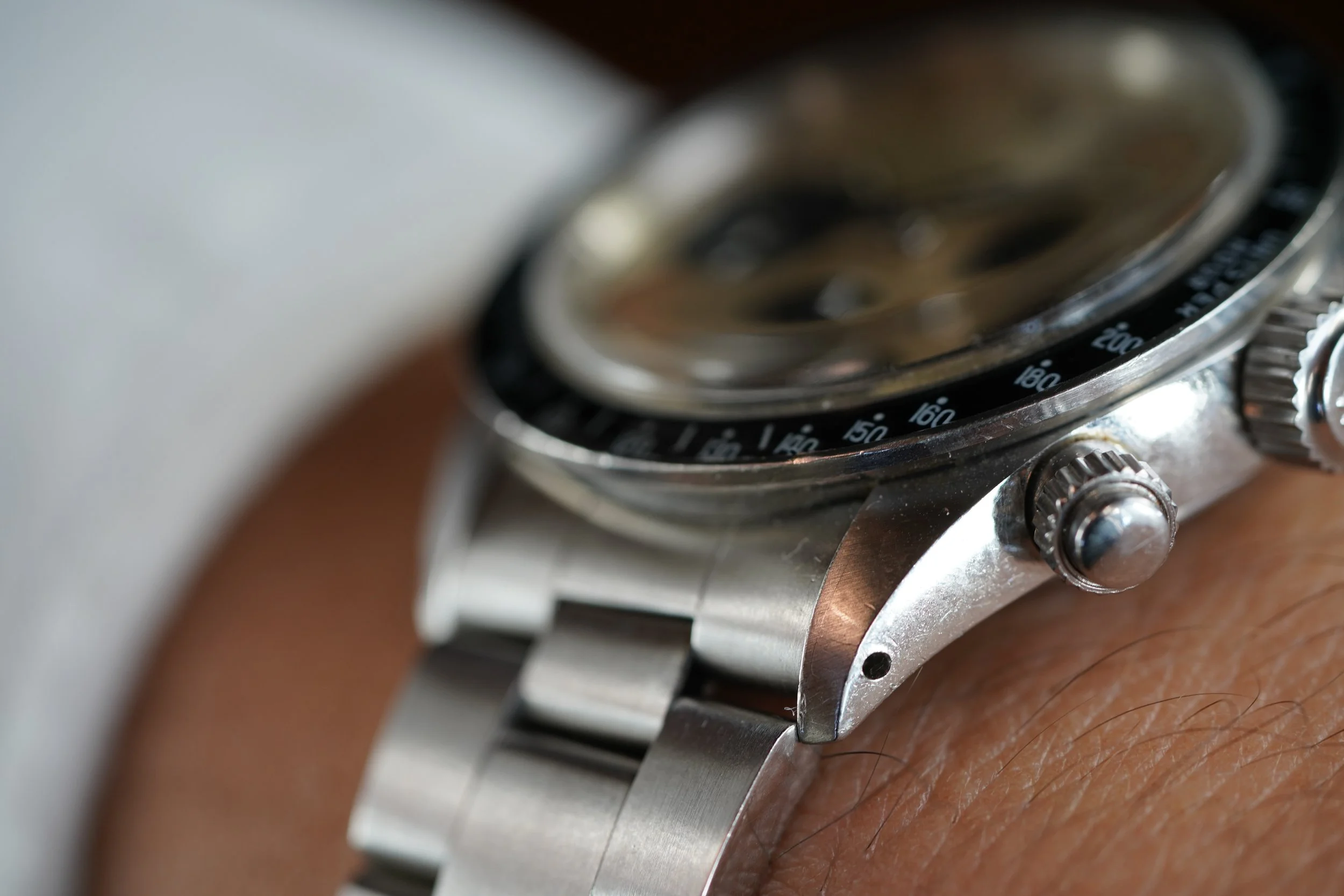 This Rolex Daytona Reference 6263 is an amazing watch. The dial in fantastic condition with attractive lume. It has a nice warmth in the dial. It features the original Mk 1 bezel insert with the hooked 200. It includes the Mk 2 pushers which are correct. This watch has a 3.72M case serial number dating to circa 1974. This is close to the Big Eyes range of Daytonas, but technically the Big Eyes have the hour register almost touching the T SWISS T by 6:00. The Rolex Oyster Cosmograph text is located closer to the center post in this serial range, which we find extremely balanced and appealing on the wrist. It is powered by the manual-wind movement Caliber 727 made by Valjoux.