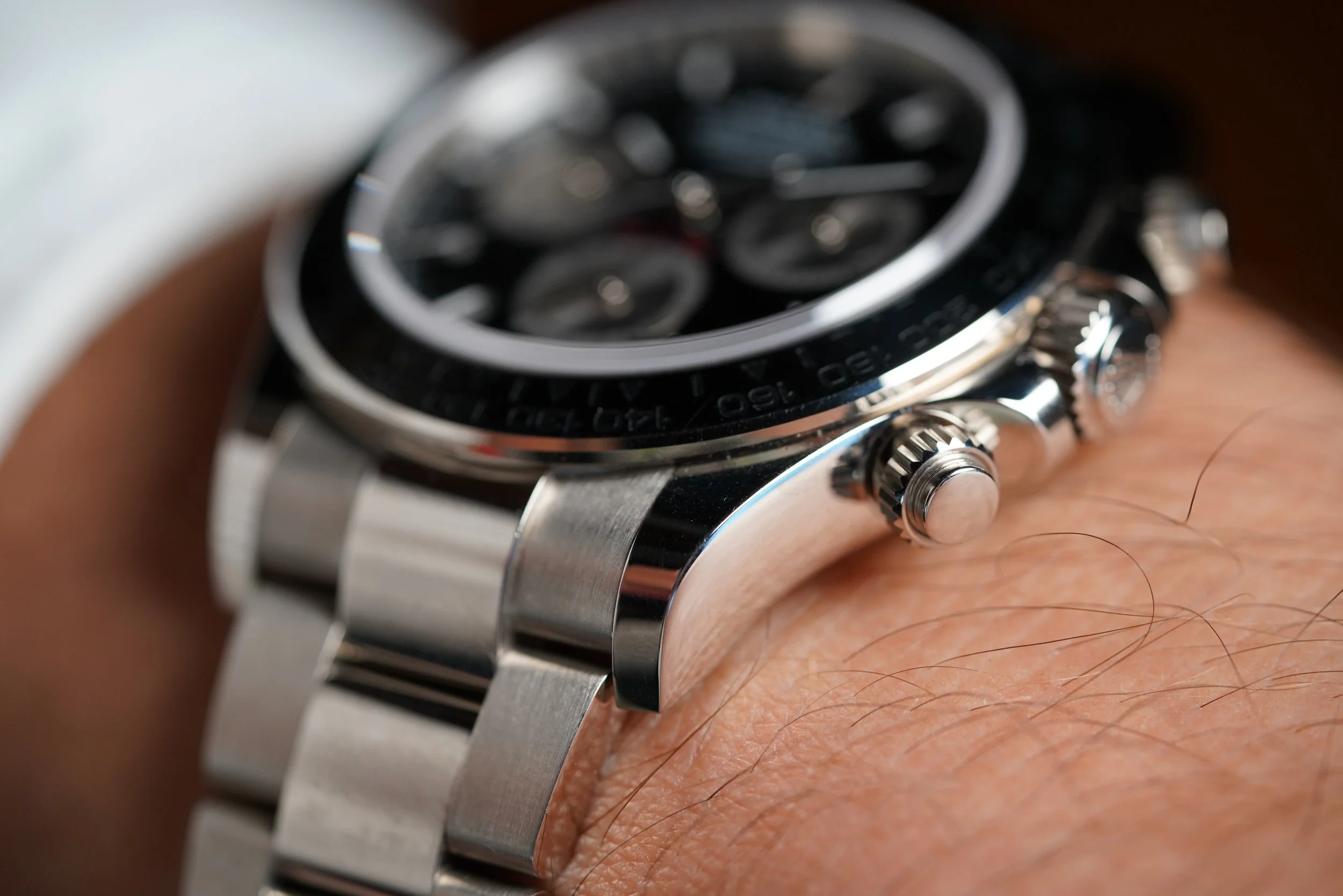 The Rolex Daytona Cosmograph reference 126509 is a fantastic iteration of the iconic sports watch that is the Rolex Daytona, currently available from the Rolex catalogue. The case and bracelet are in 18K white gold. The watch features a black dial with silver subdials and red Daytona print above the 6 o’clock register. The dial format is reminiscent of the “Big Red” dial layouts found on 4-digit Daytona references. It is powered by the Rolex Calibre 4131.