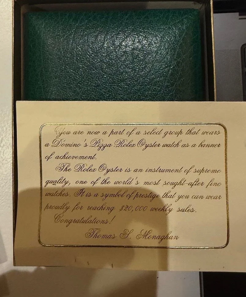 You can learn about these watches in our video Collector Conversation: Tom Monaghan - Founder of Domino's Pizza - on the Domino's Rolex.