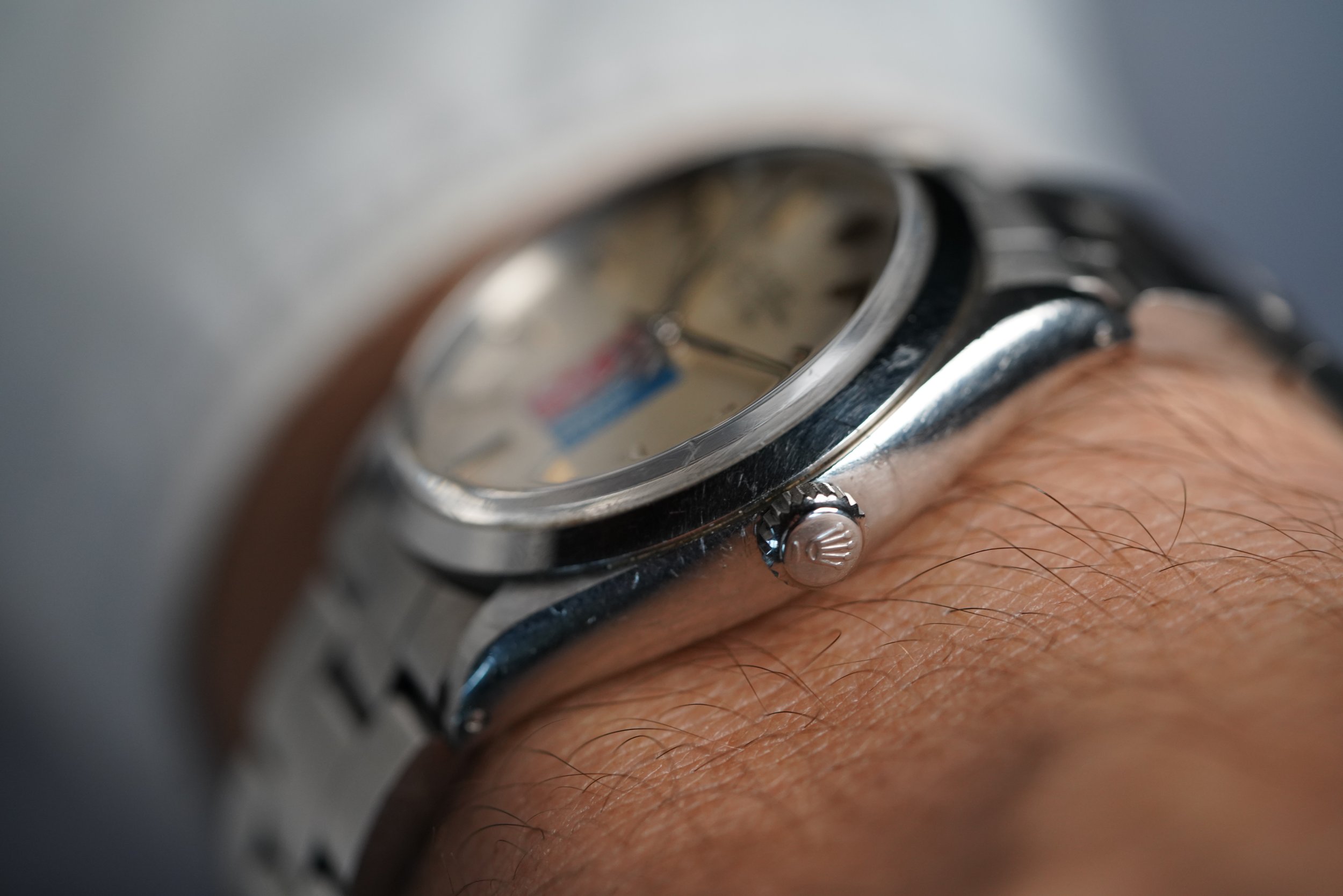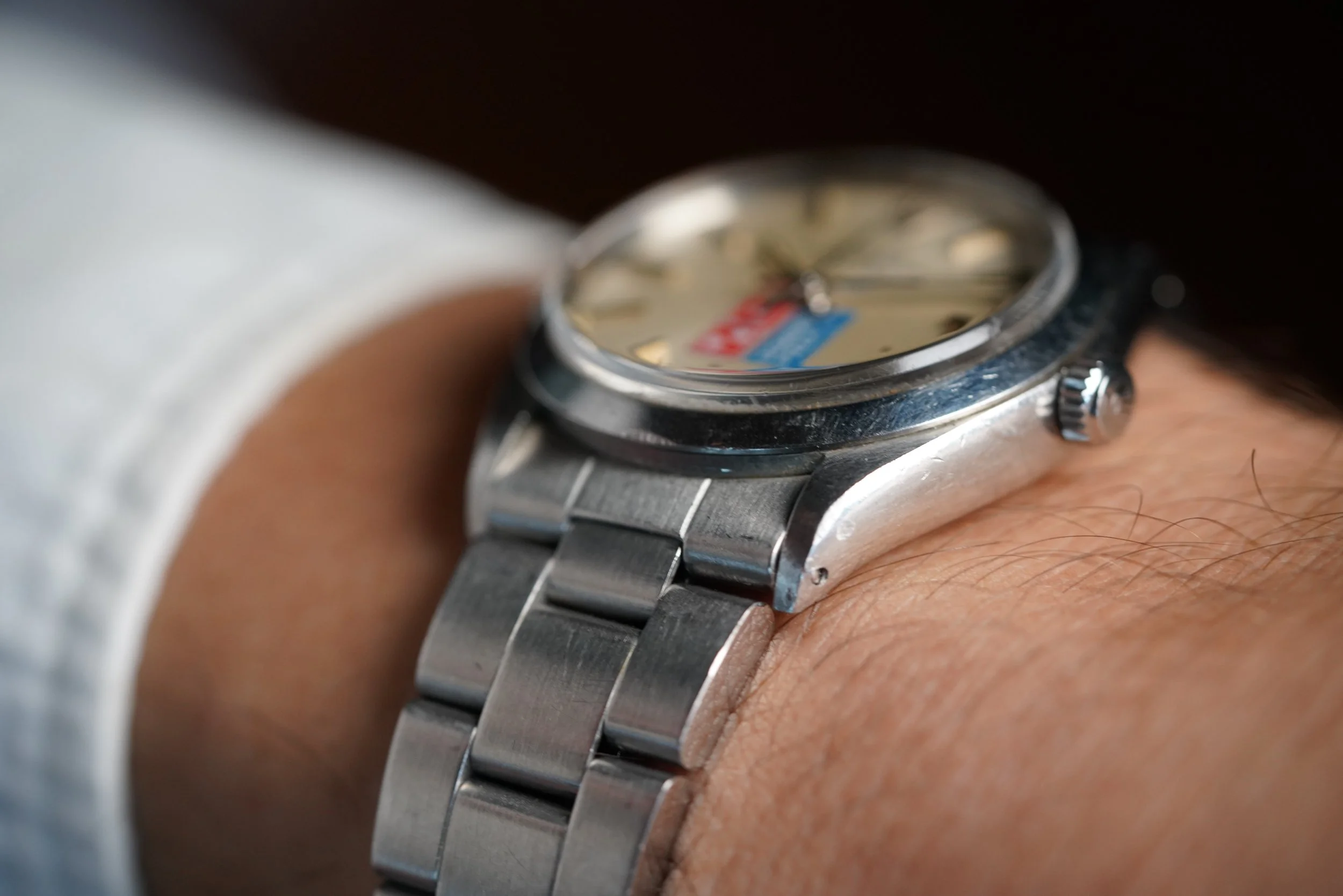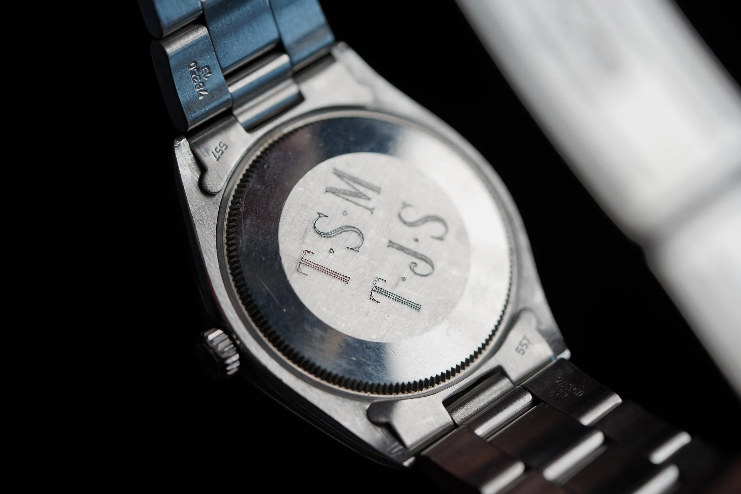 All these watches were originally ordered through Schlanderer and Sons in Ann Arbor, Michigan, where Domino’s has its headquarters. In the past, these watches on the secondhand market were generally the least expensive Rolex a person could purchase as few people wanted a pizza logo like this on their dial. Dealers would buy them, swap out the Domino’s dial, and polish off the case back initials. Over the last year, however, they have gained a massive following. The watch features an engraving on the back with the recipient’s initials above “T.S.M.” for Thomas S. Monaghan, the founder of Domino’s. The engravings were made in Ann Arbor, Michigan.