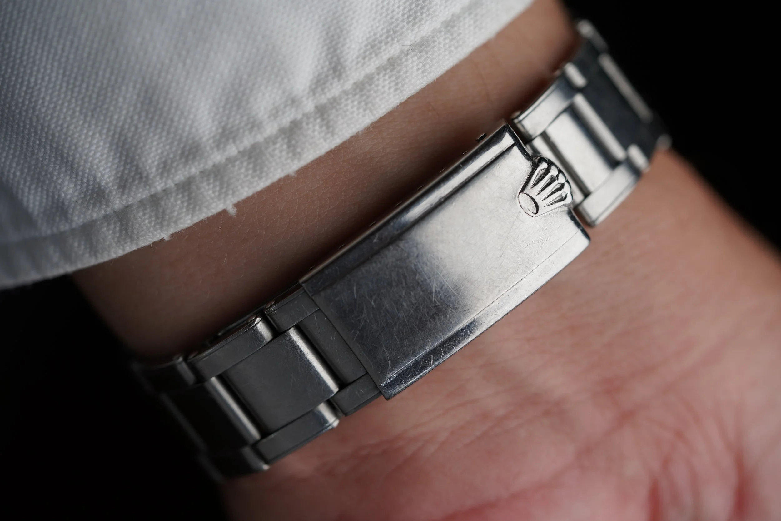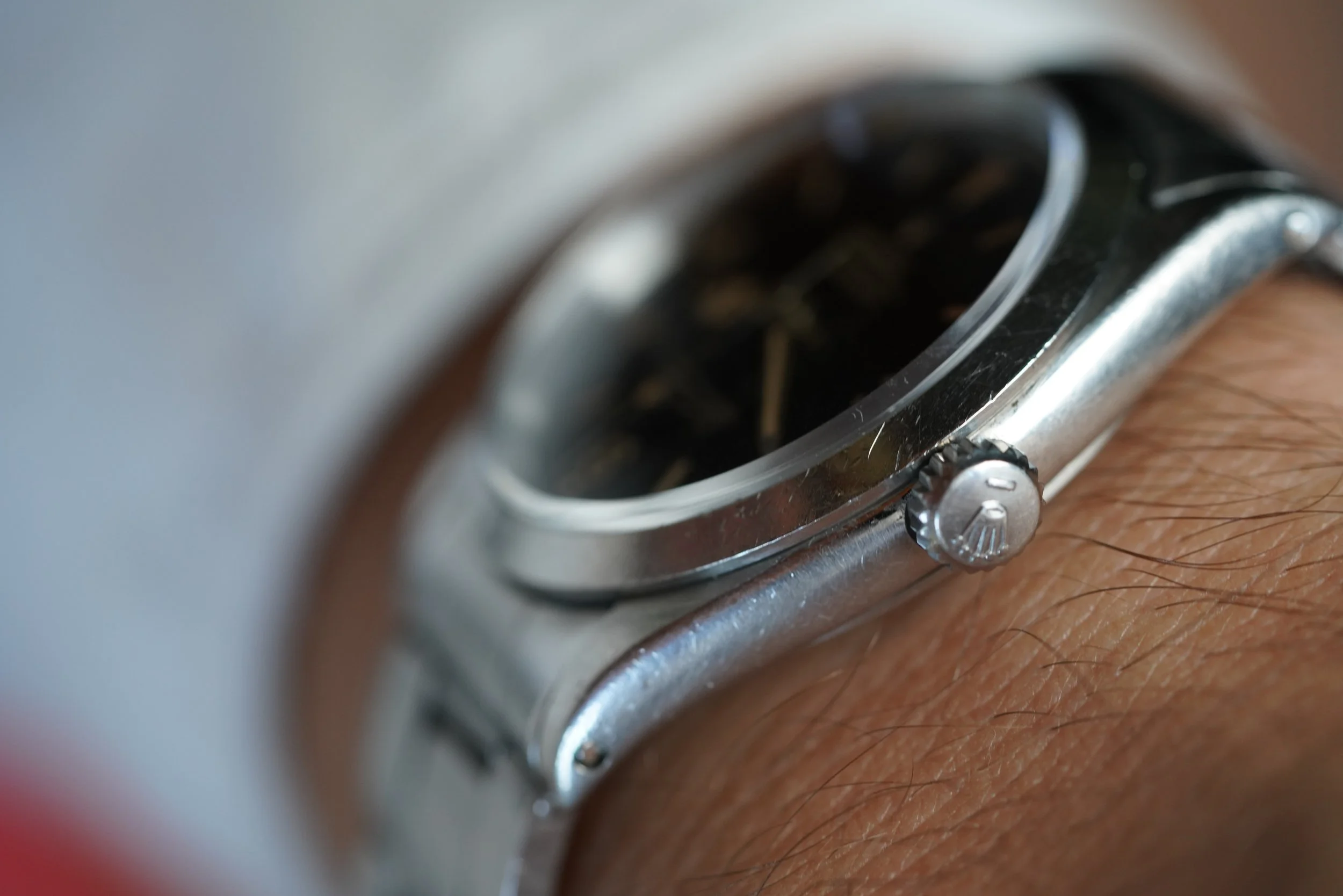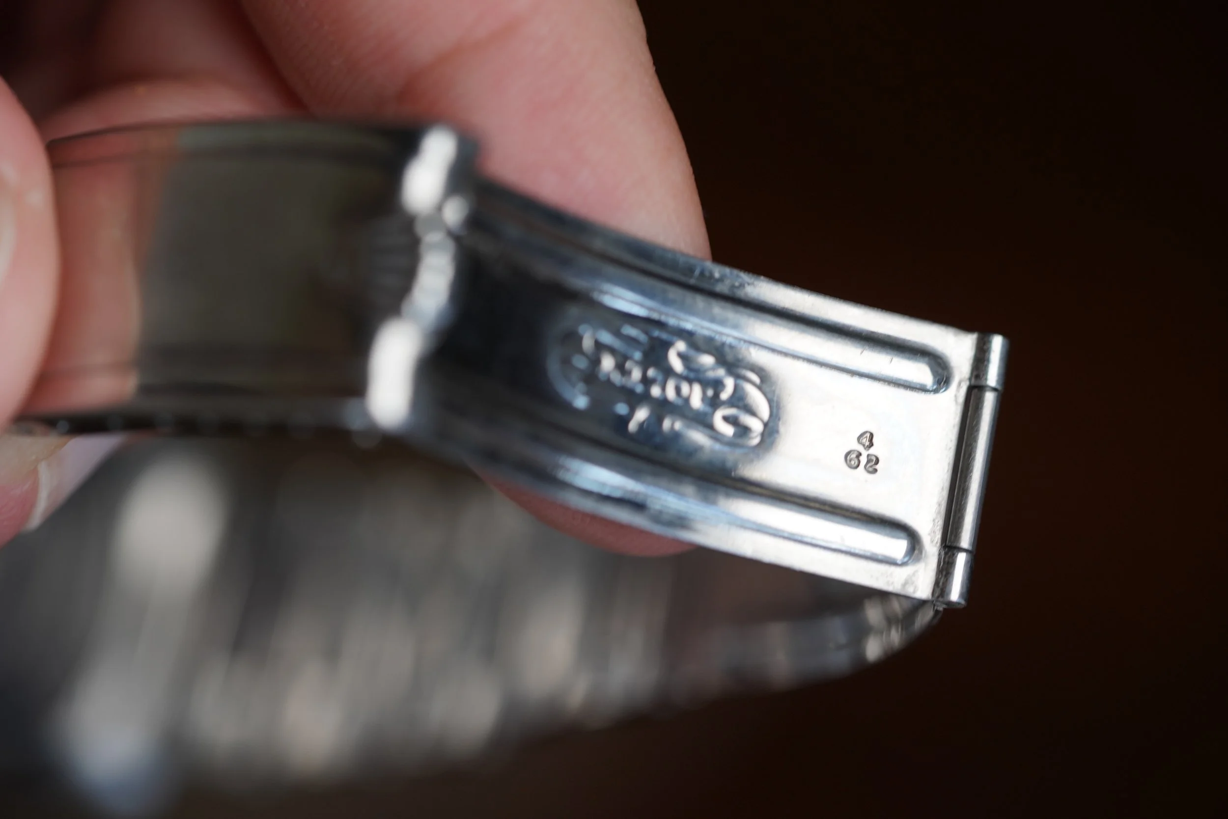 This example features a gilt dial the rare “Exclamation” dial with dot below 6:00 indicating a reduce amount of radiation in the radium / tritium mixture of luminous material (a.k.a. “lume”). It features a 745,XXX serial dating it to circa 1962. The gilt, glossy dial is extremely attractive and glossy / shiny. The case appears to be unpolished. It is paired on a Rolex 7206 Rivet bracelet dating to 1962 with correct 58 end links. The watch measures 36mm in diameter (43mm lug-to-lug). The watch features a later flat service crystal. When we tried to use a domed crystal, the bezel was a touch too big to accommodate.