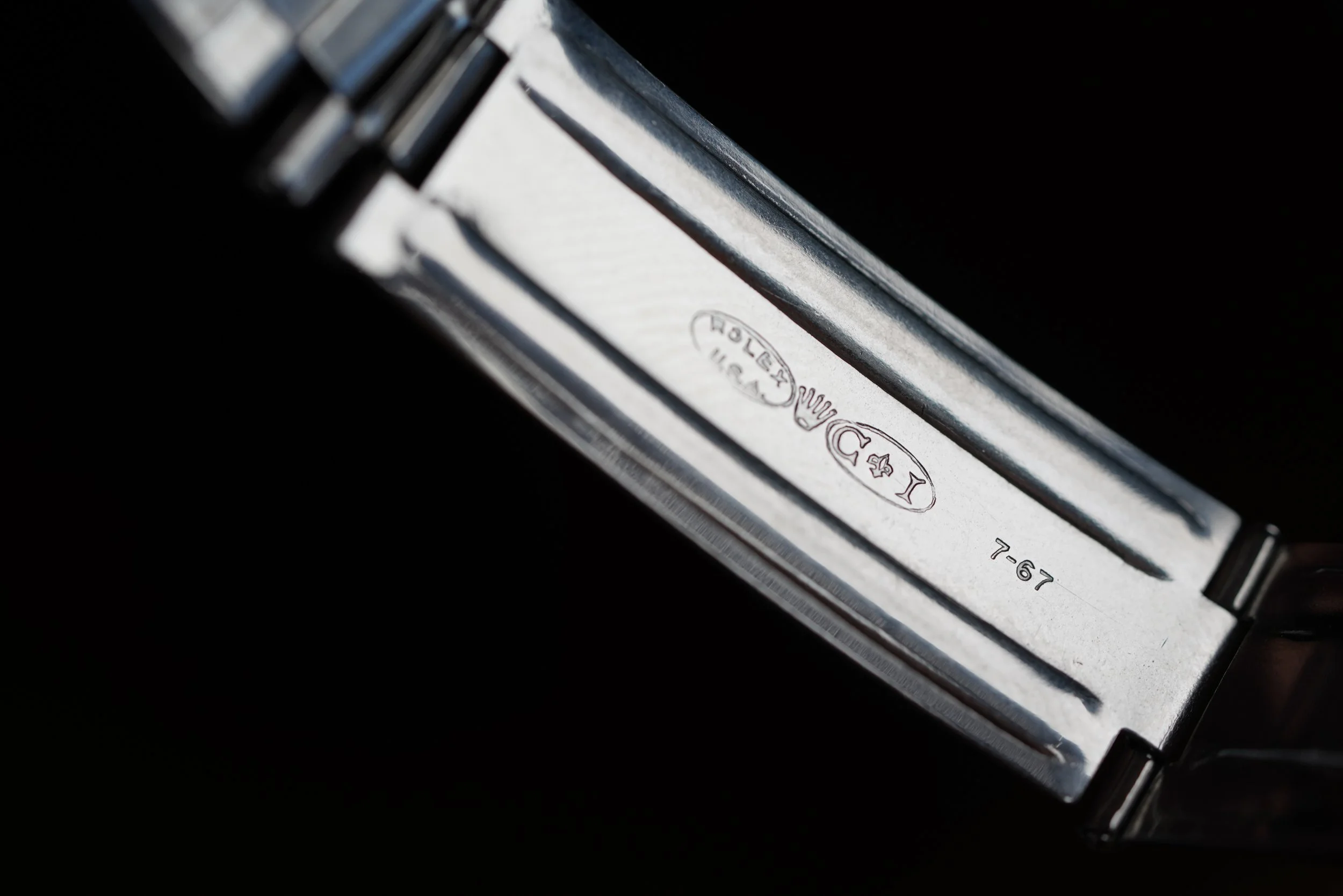 This example features an 1.731M serial dating it to circa 1967. The case appears to be unpolished. It measures 36mm in diameter (43mm lug-to-lug). It features the Mark 1 frog foot dial. It features “fat” style lume. It is paired on a Rolex C&I bracelet dating to 1967. The hands have been relumed as the lume was cracked. It comes with spare original crystal.
