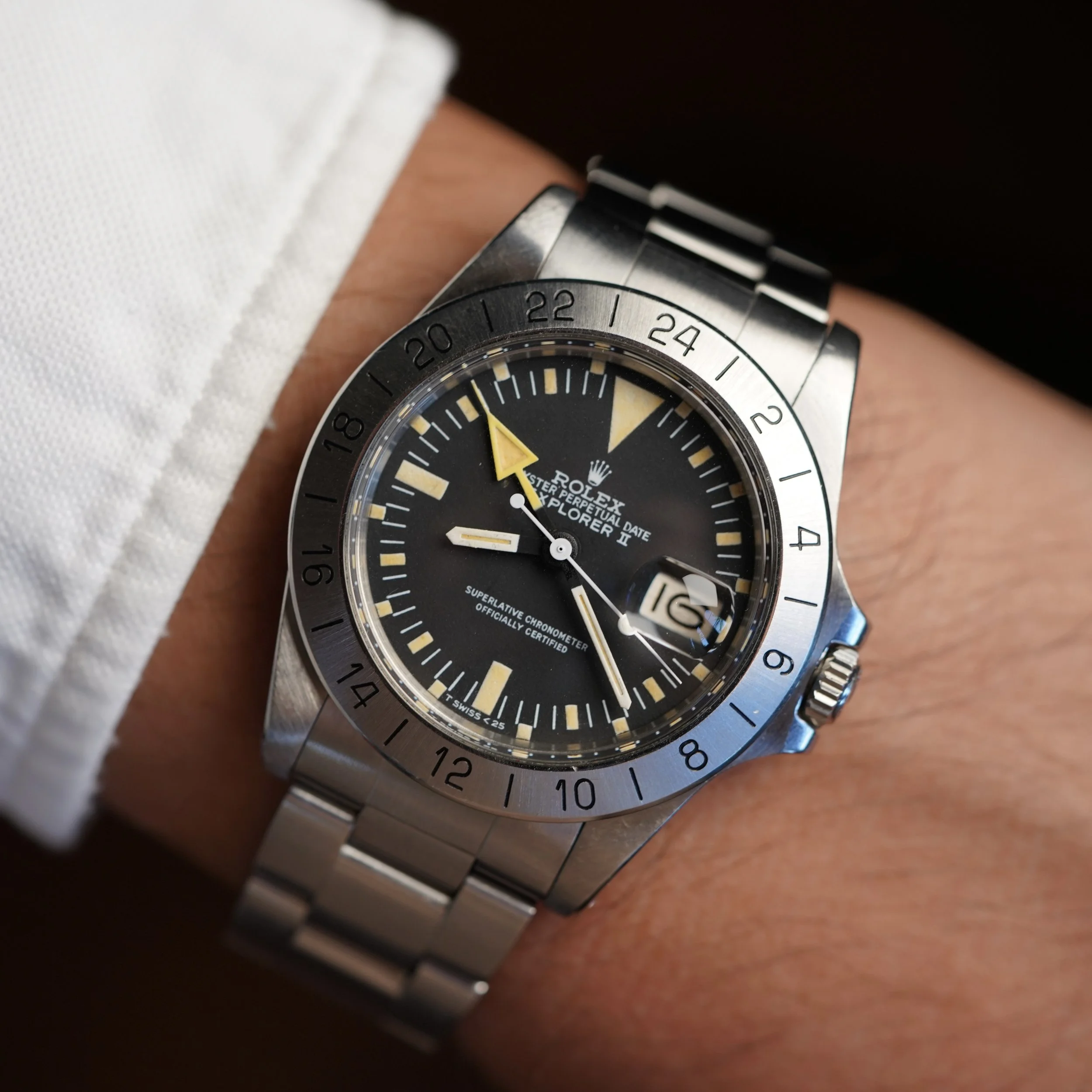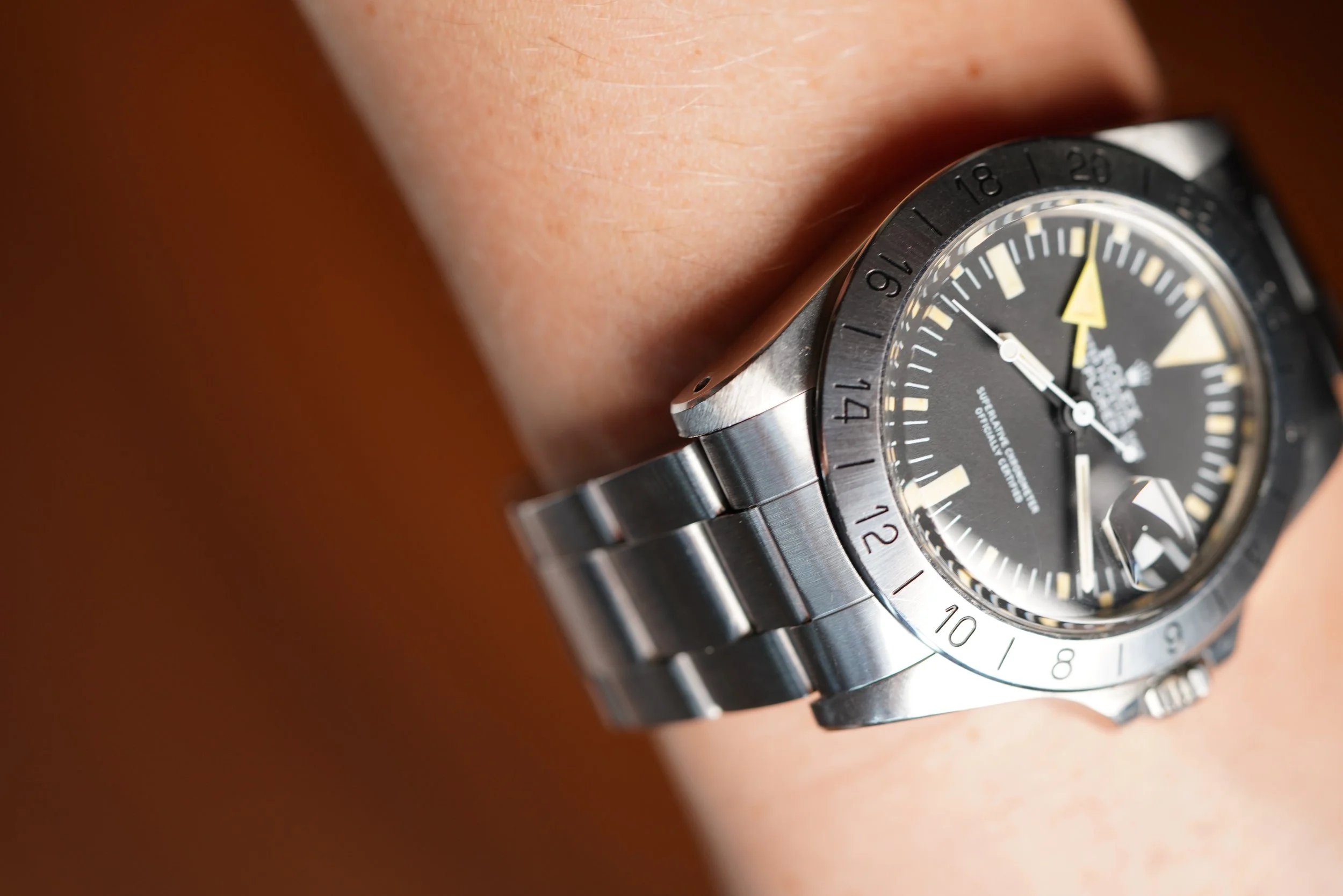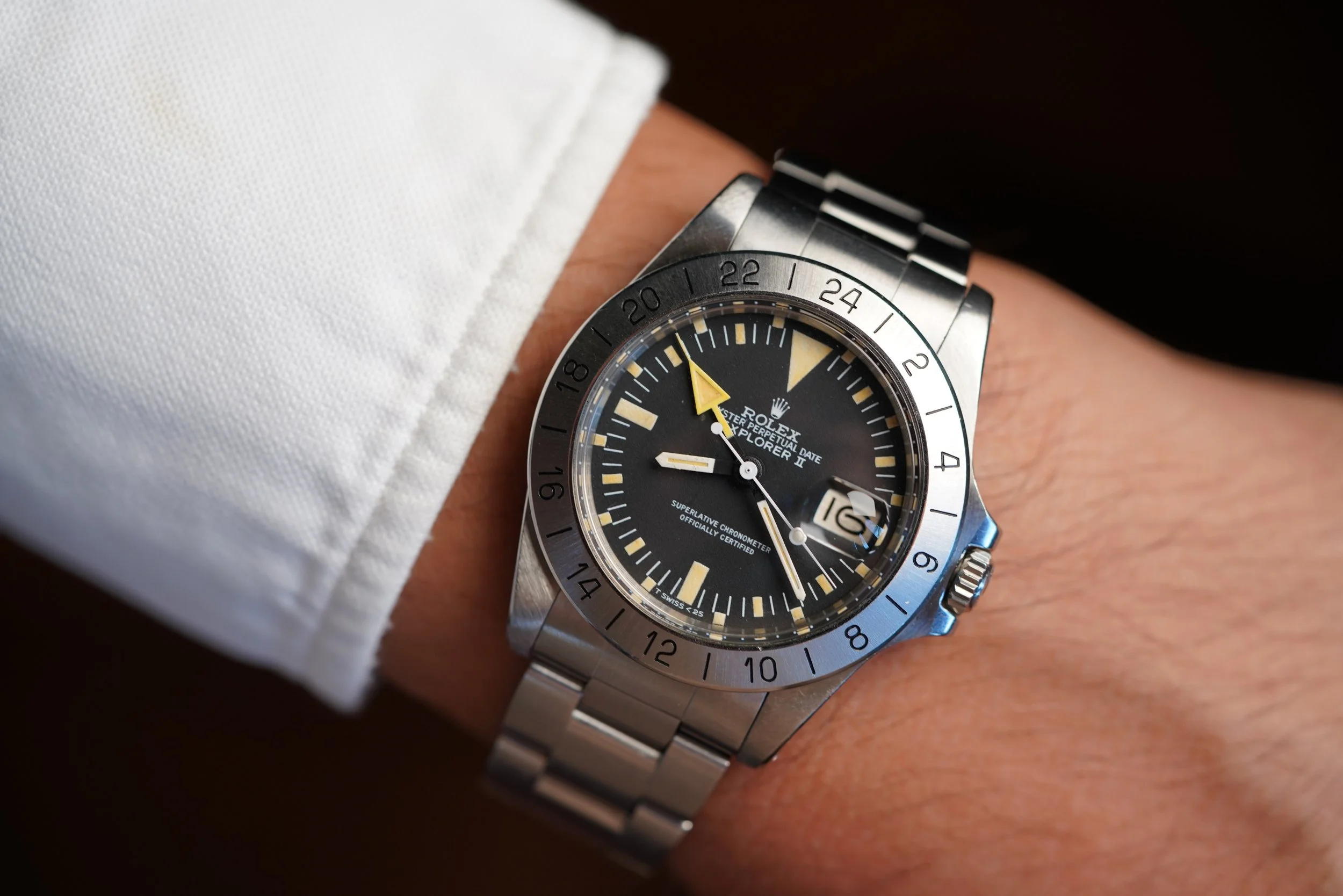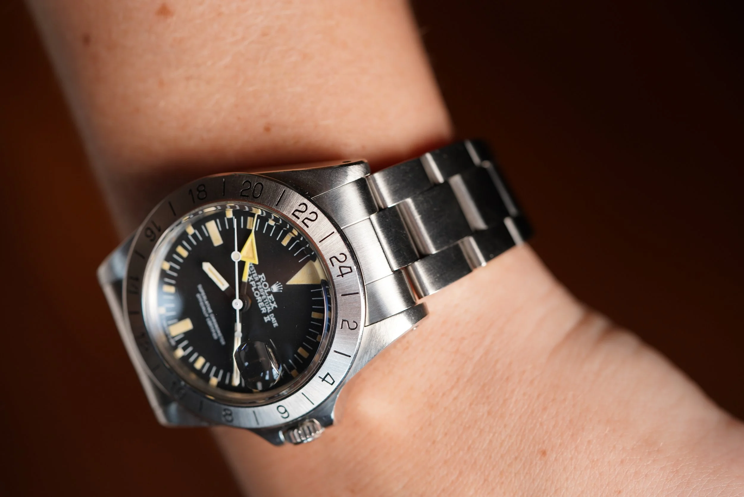 Rolex introduced the Explorer II reference 1655 for use by spelunkers (cave diving) and speleologists (cave researchers) where the use of a 24-hour hand is important for the wearer to be able to differentiate between night and day. These watches also have the nickname ‘Freccione’ meaning ‘big arrow’ in Italian and are sometimes falsely called the “Steve McQueen” despite no evidence he ever owned or wore one. A slow seller when initially released, the reference 1655 has gained a cult following due to its unusual and distinctive design. The reference 1655 is one of the references I am asked most often to find for collectors.