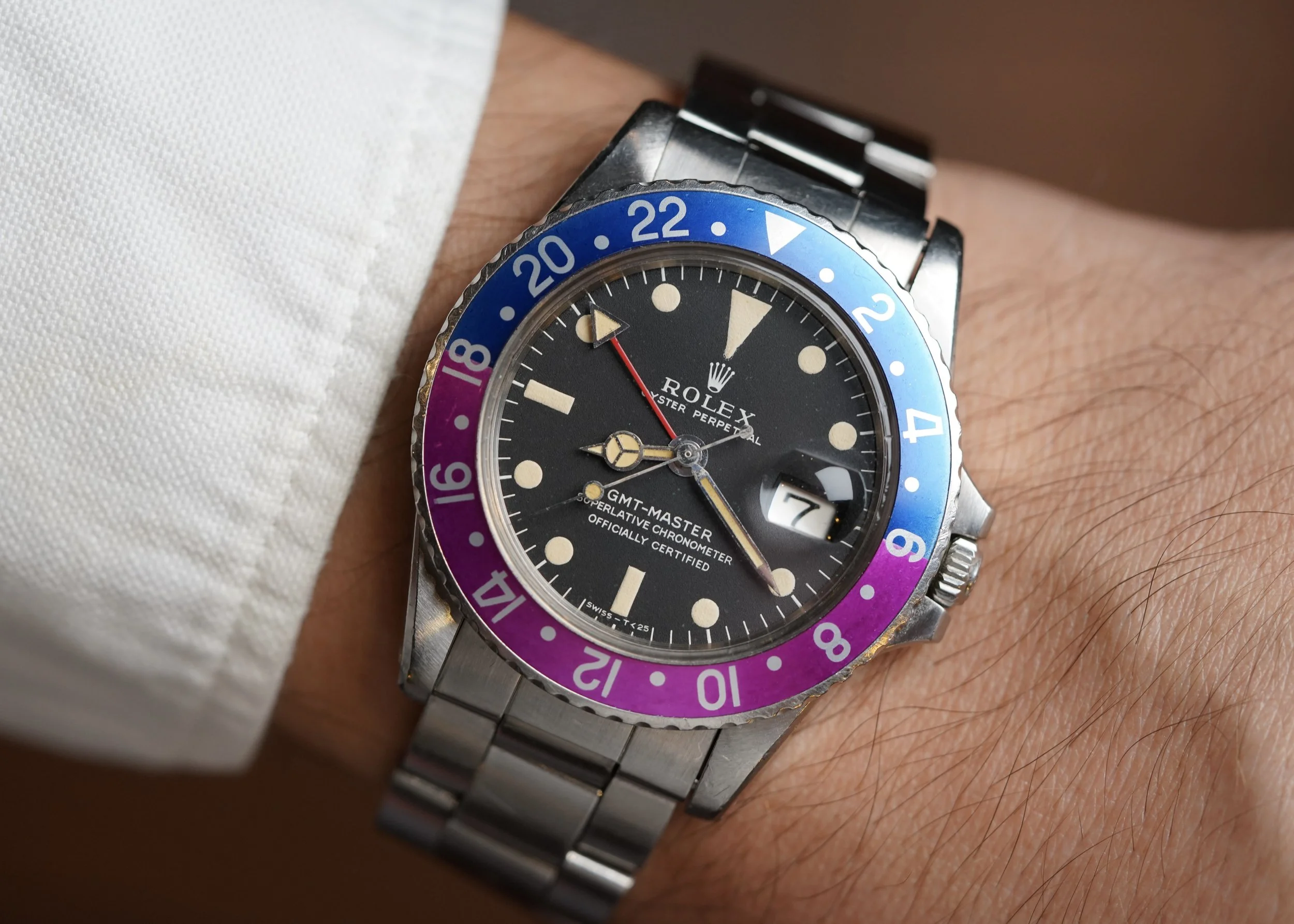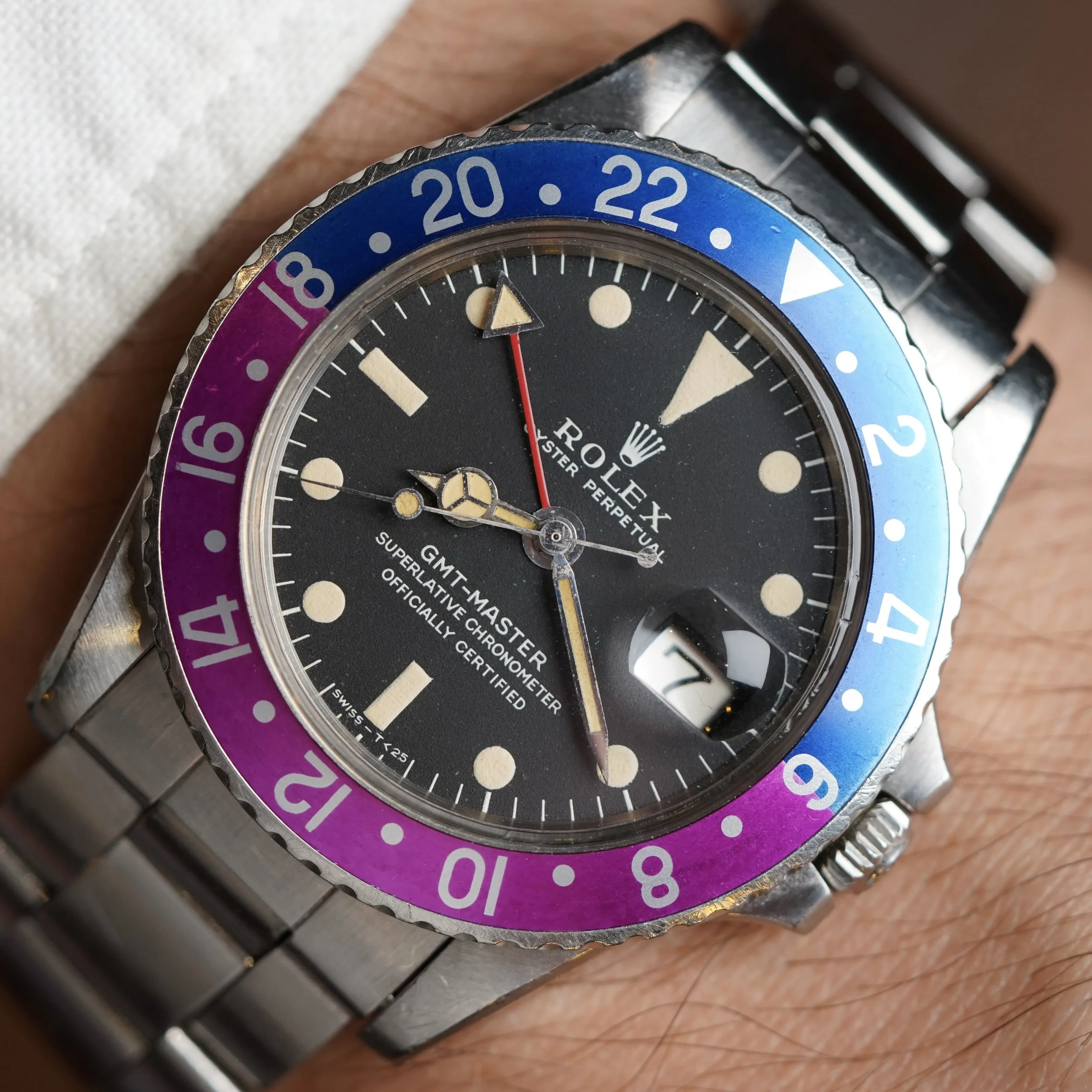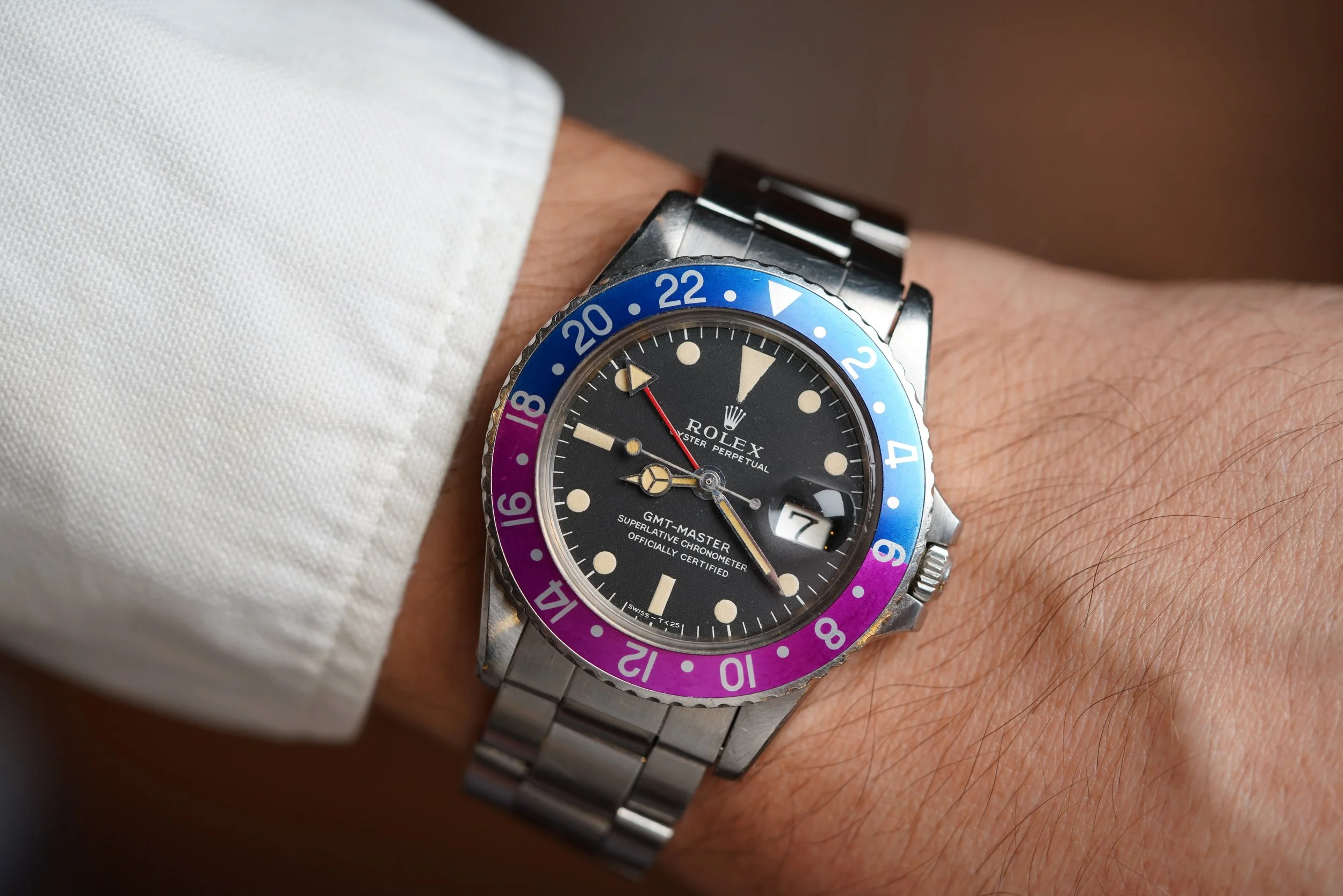 The Rolex GMT-Master was originally designed for Pan Am pilots in the 1950s and continues to be a flagship model for Rolex to this day. The reference 1675 was introduced in 1959 and remained in production until 1980.