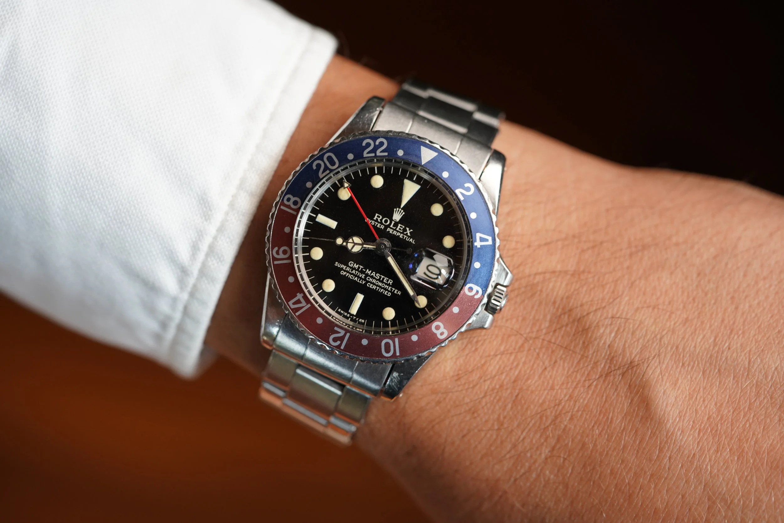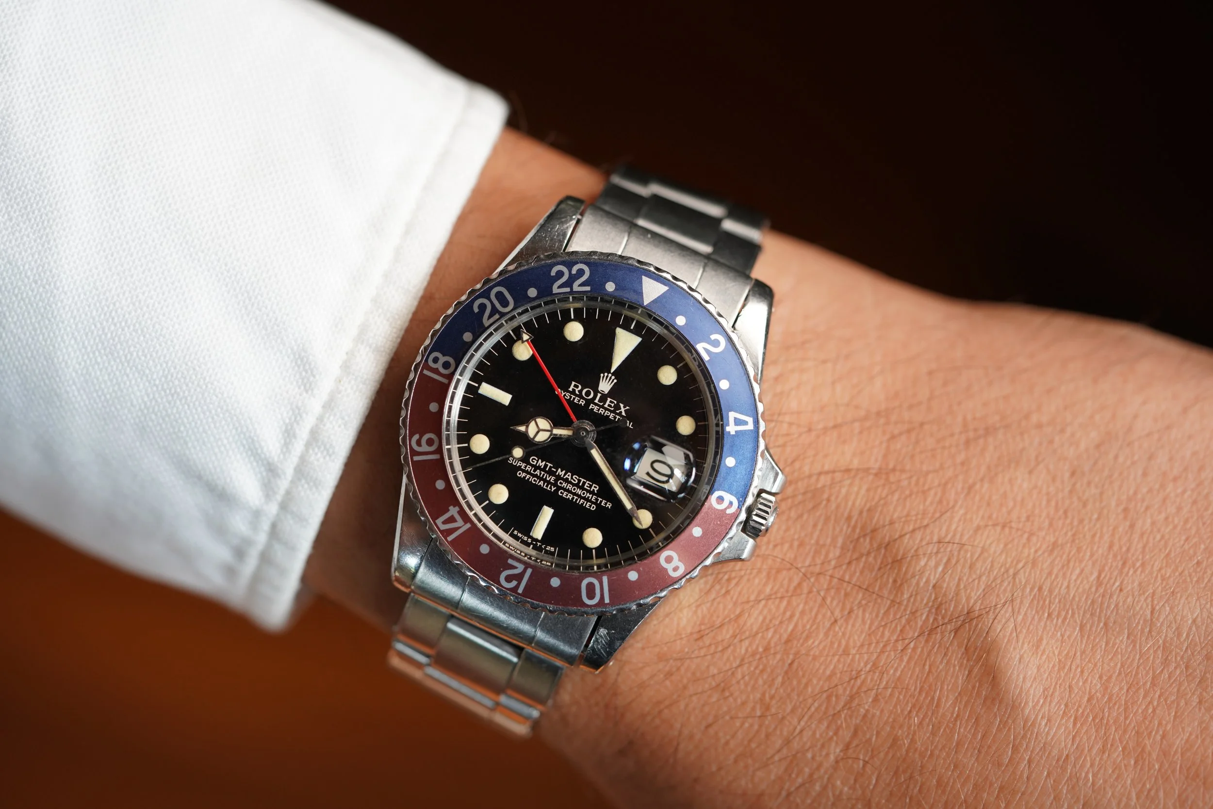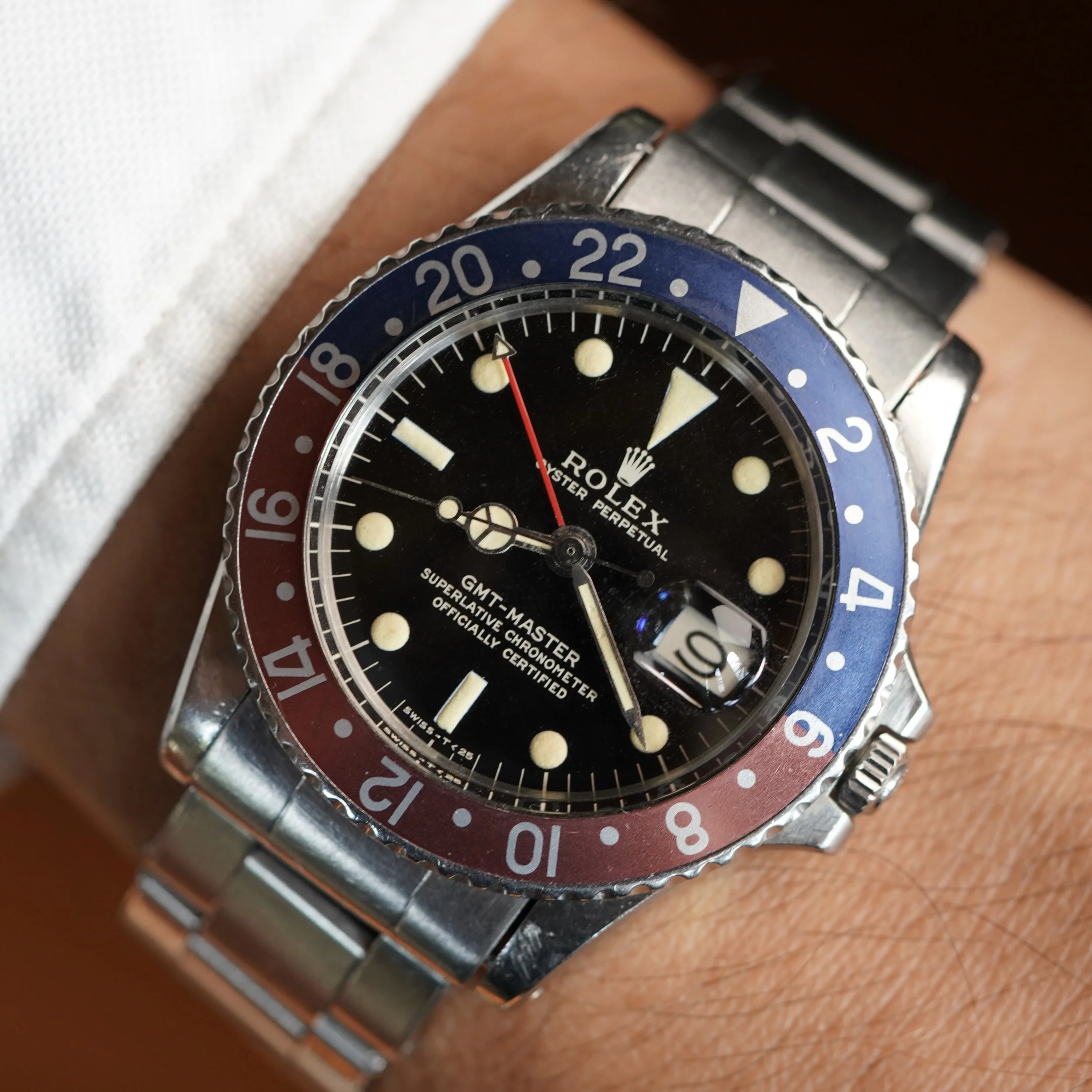 The Rolex GMT-Master was originally designed for Pan Am pilots in the 1950s and continues to be a flagship model for Rolex to this day. The reference 1675 was introduced in 1959 and remained in production until 1980.