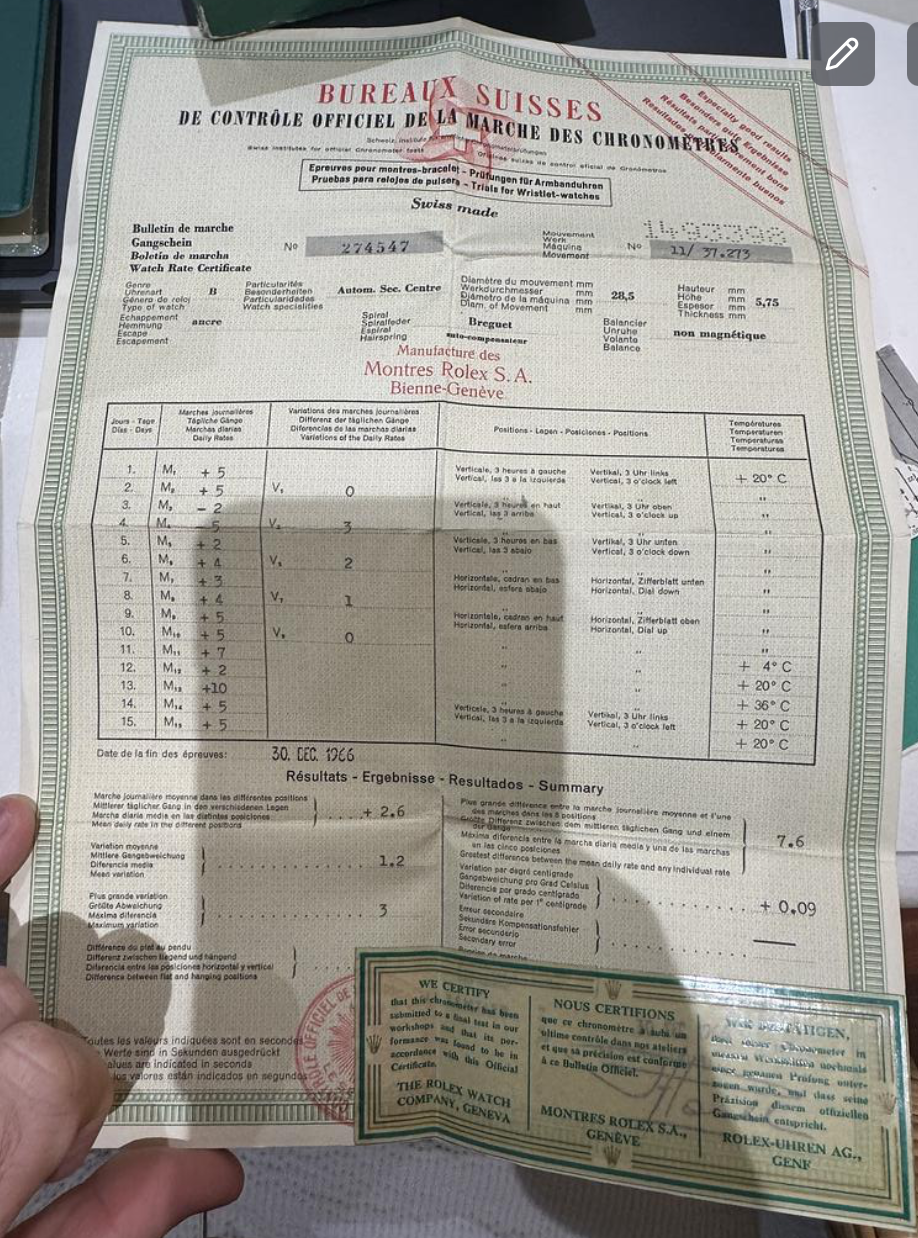 It comes full set, with box and papers. We do not know the service history, but it is running well. It recently passed a water resistance test of 5 bar.