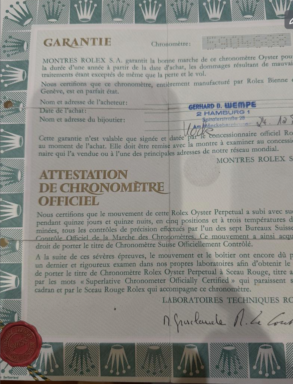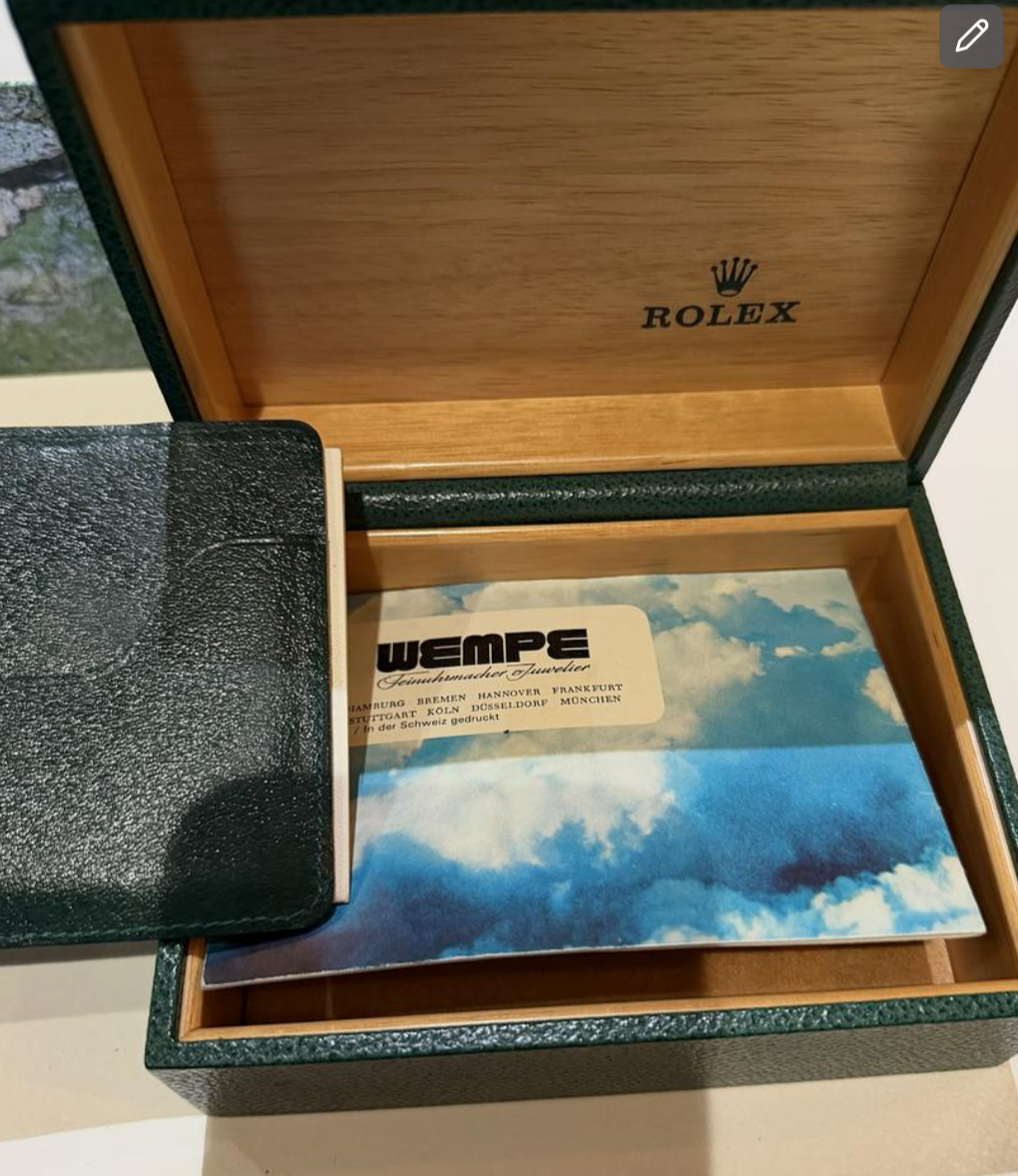 The watch comes full set with box and papers. We do not know the service history, but it is running well. It recently passed a 5 bar water resistance test.