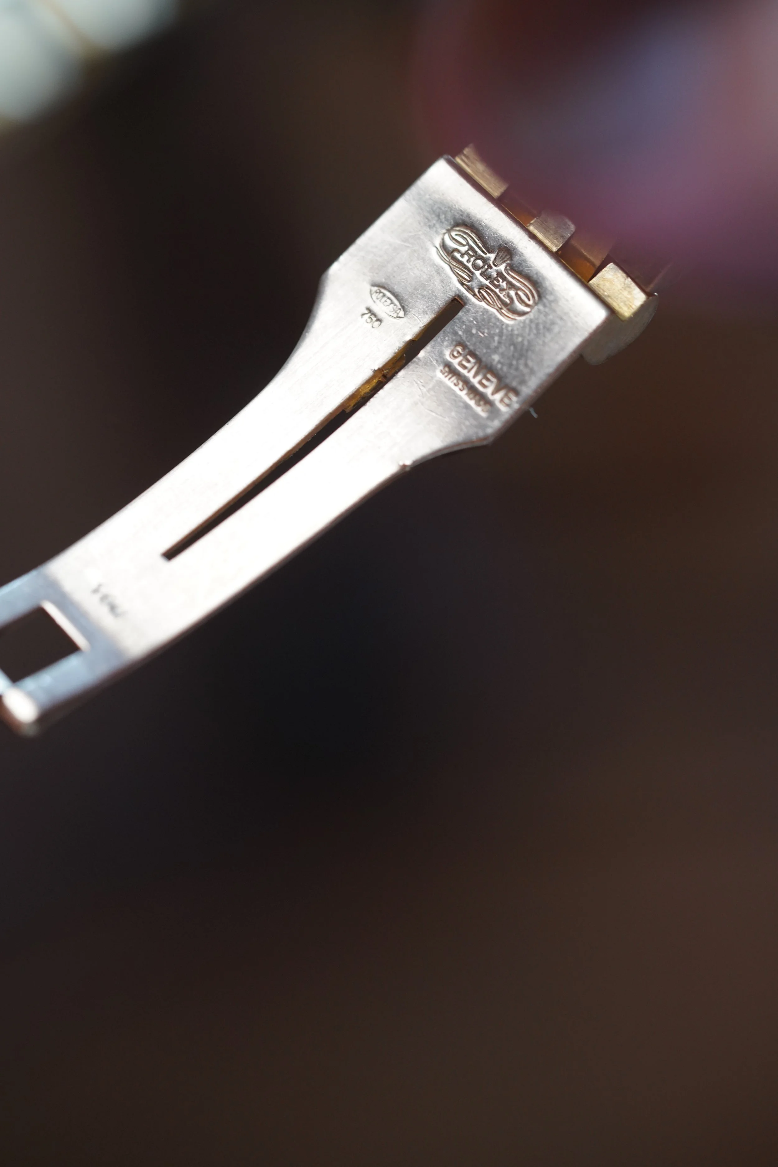 This example features a 5.9M serial dating to circa 1980. It is paired with a gold Jubilee bracelet with hidden clasp. The case has been polished in the past. The hands are later replaced. The bezel insert is a later example.