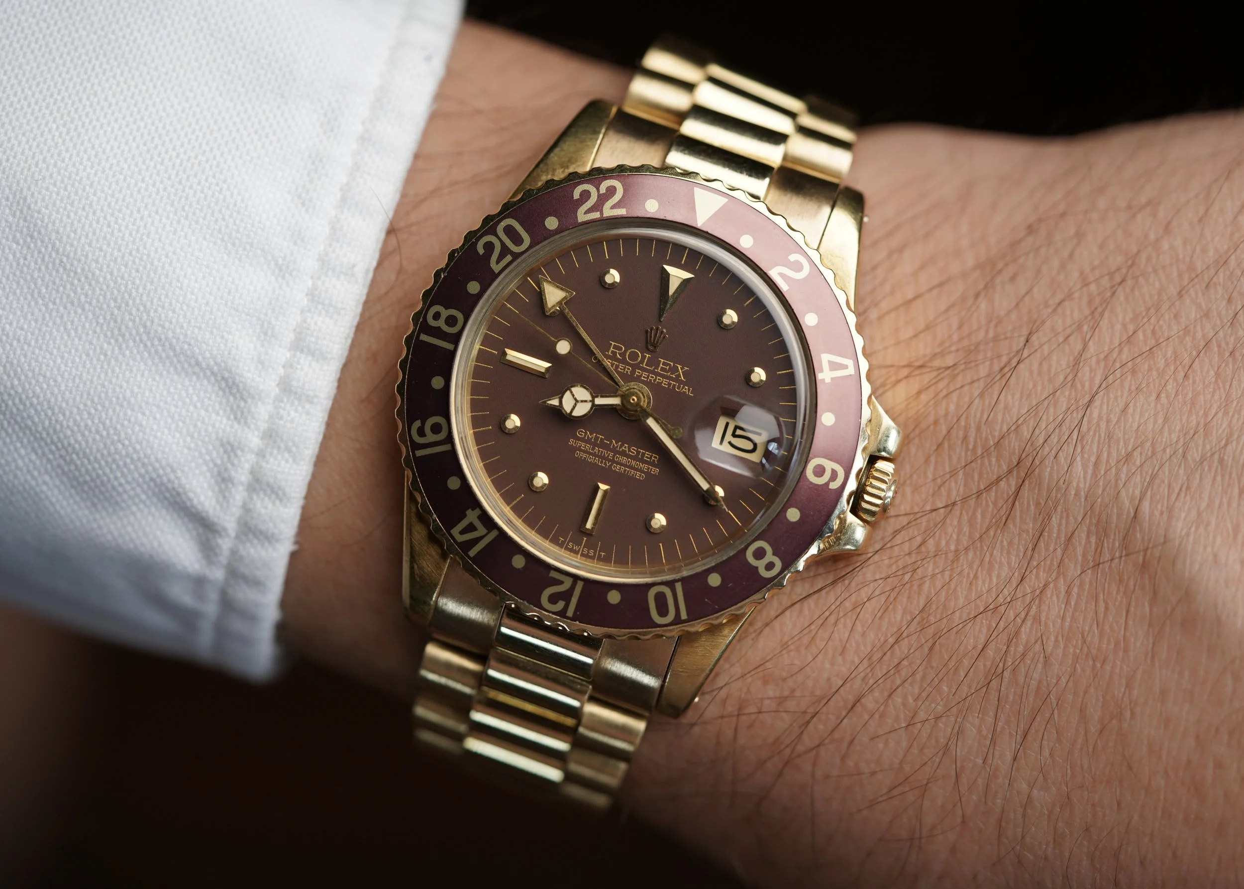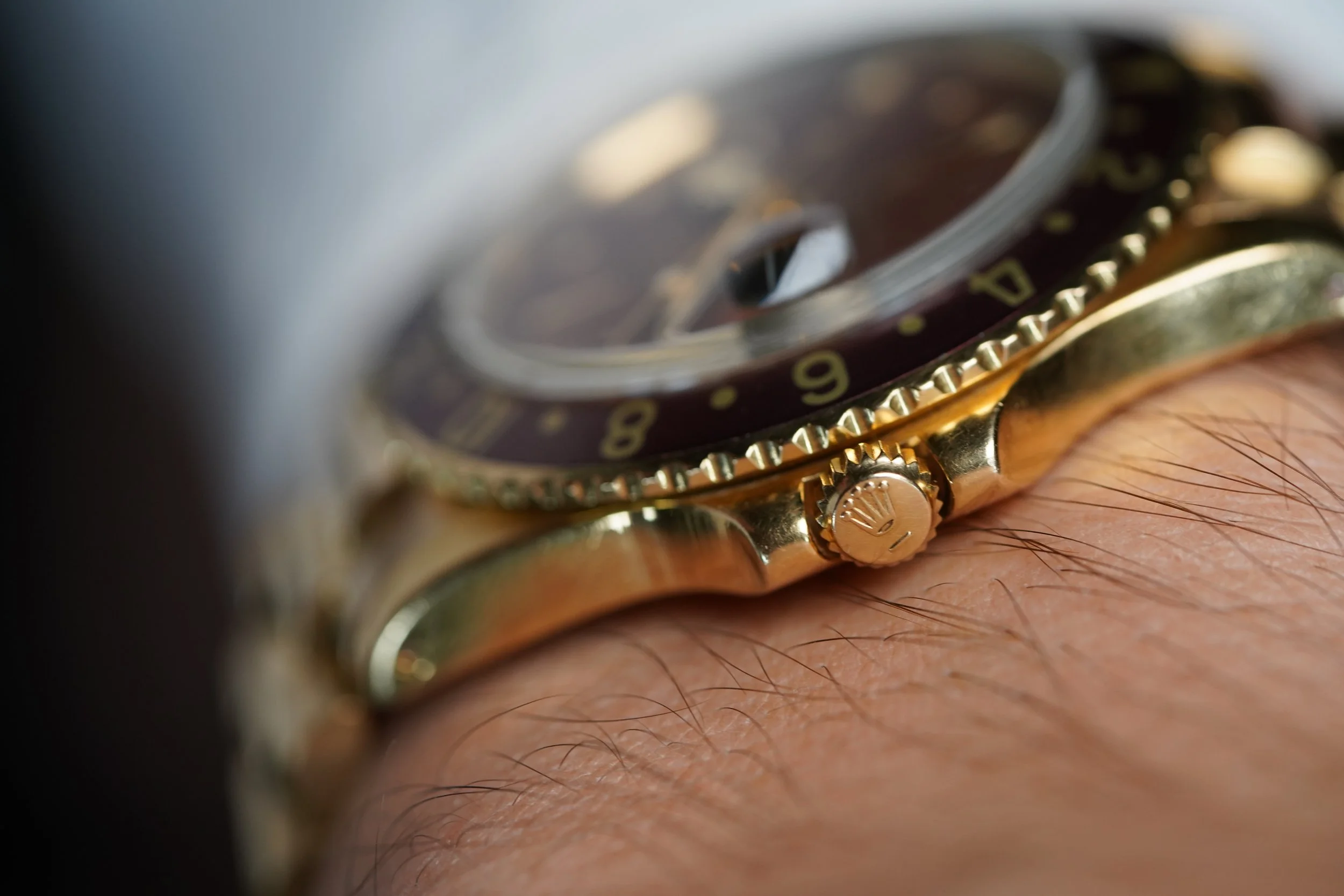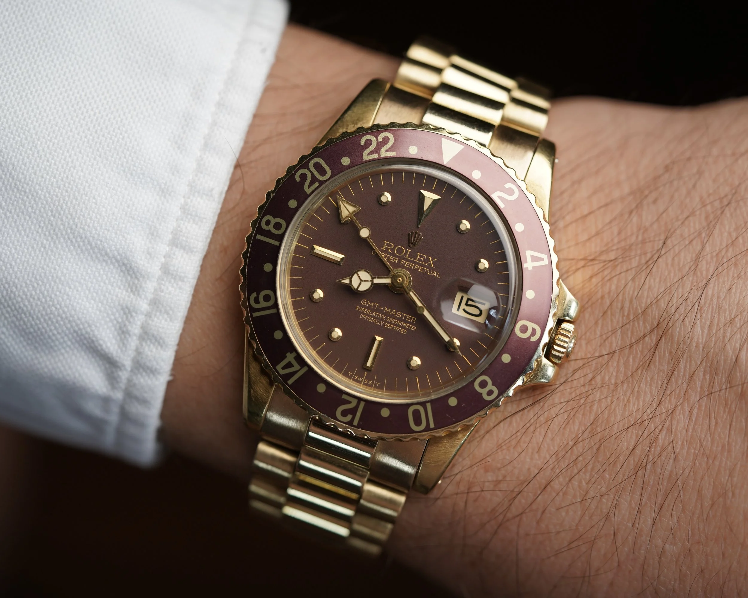 The Rolex GMT-Master was originally designed for Pan Am pilots in the 1950s and continues to be a flagship model for Rolex to this day. The present watch is an exceptionally preserved GMT-Master reference 1675 in 18k gold.