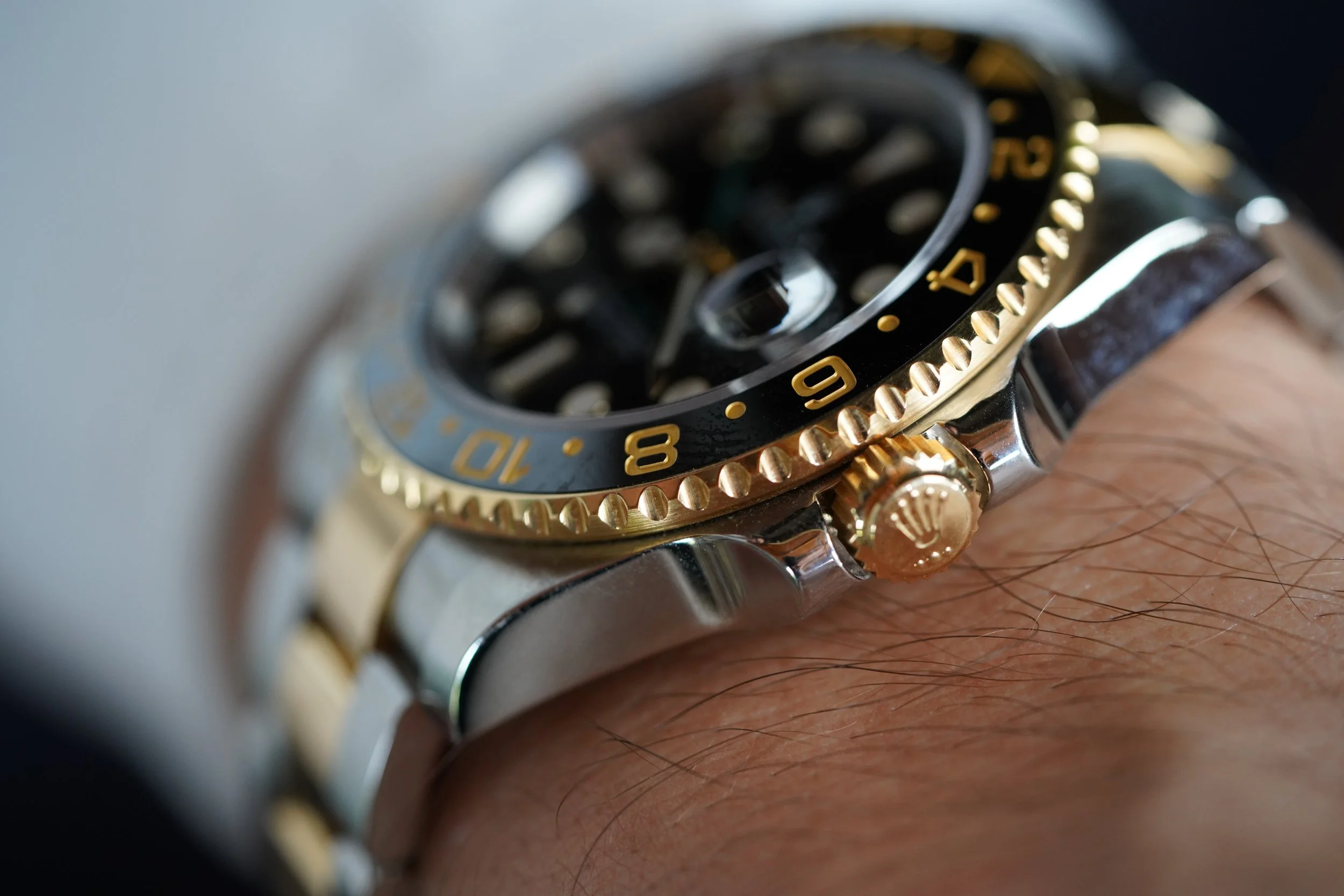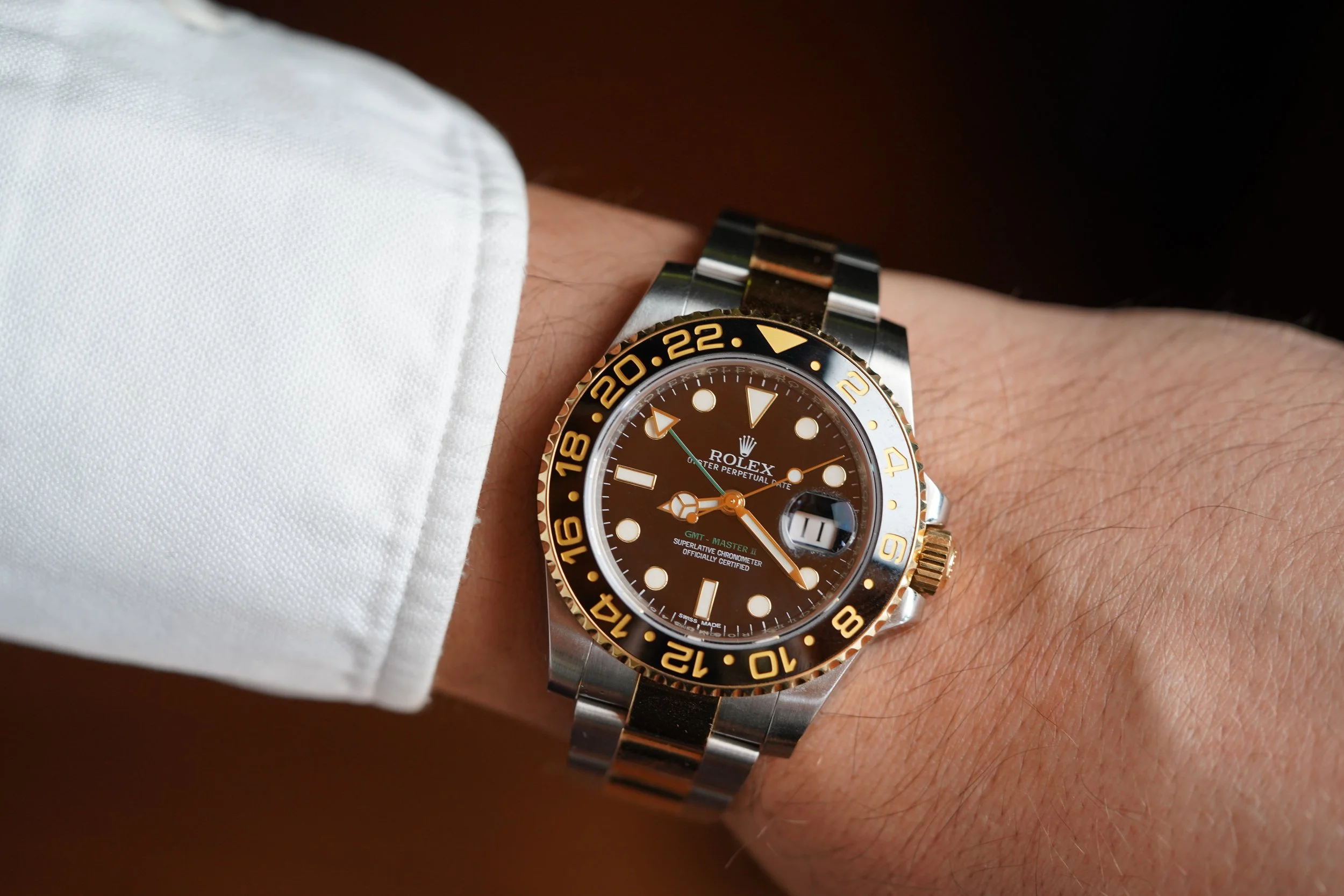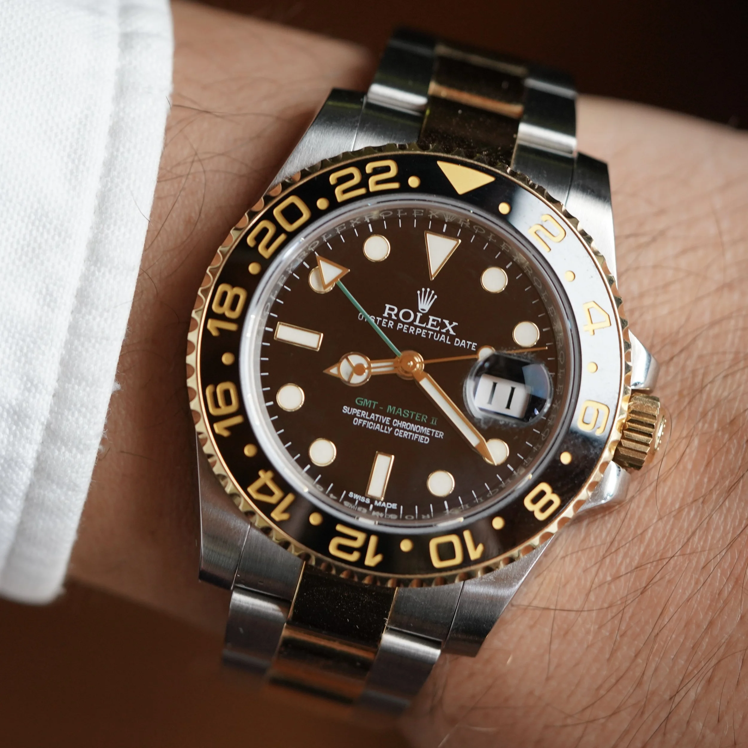 The Rolex GMT-Master II is one of the most sought-after models in the current Rolex lineup. The GMT-Master 116713LN denotes a steel and 18k yellow gold case and bracelet, as well as a black and gray rotating bezel. It captures the iconic DNA from the models created for Pan Am pilots in the 1950s. Due to its incredible heritage and iconic look, it remains a flagship model for Rolex to this day.