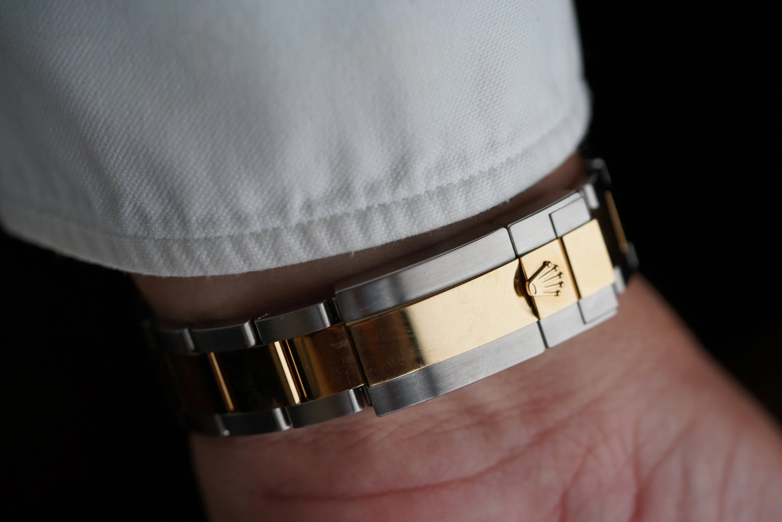 The case measures 40mm in diameter and approximately 47mm lug-to-lug. This example features a two-tone Oyster bracelet.