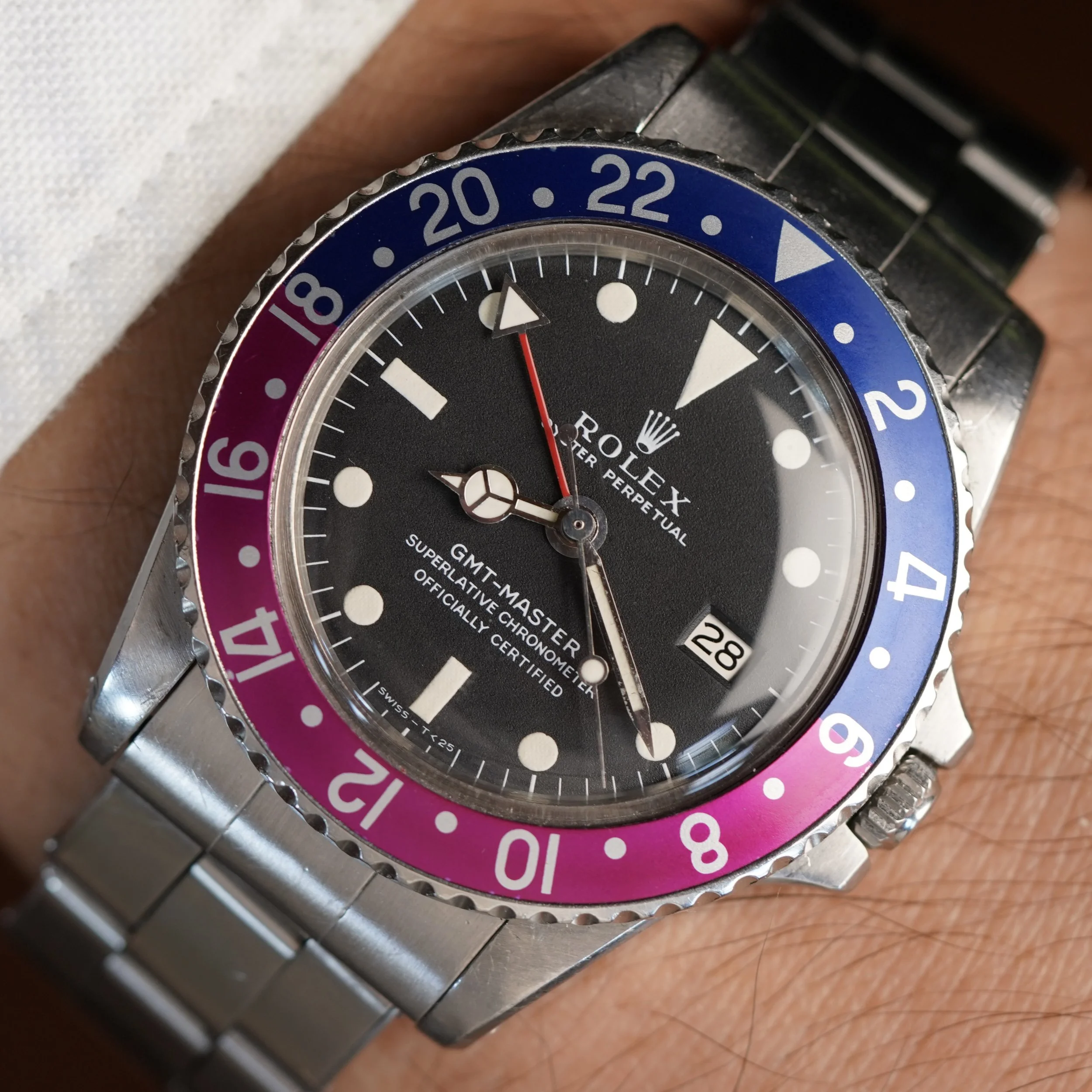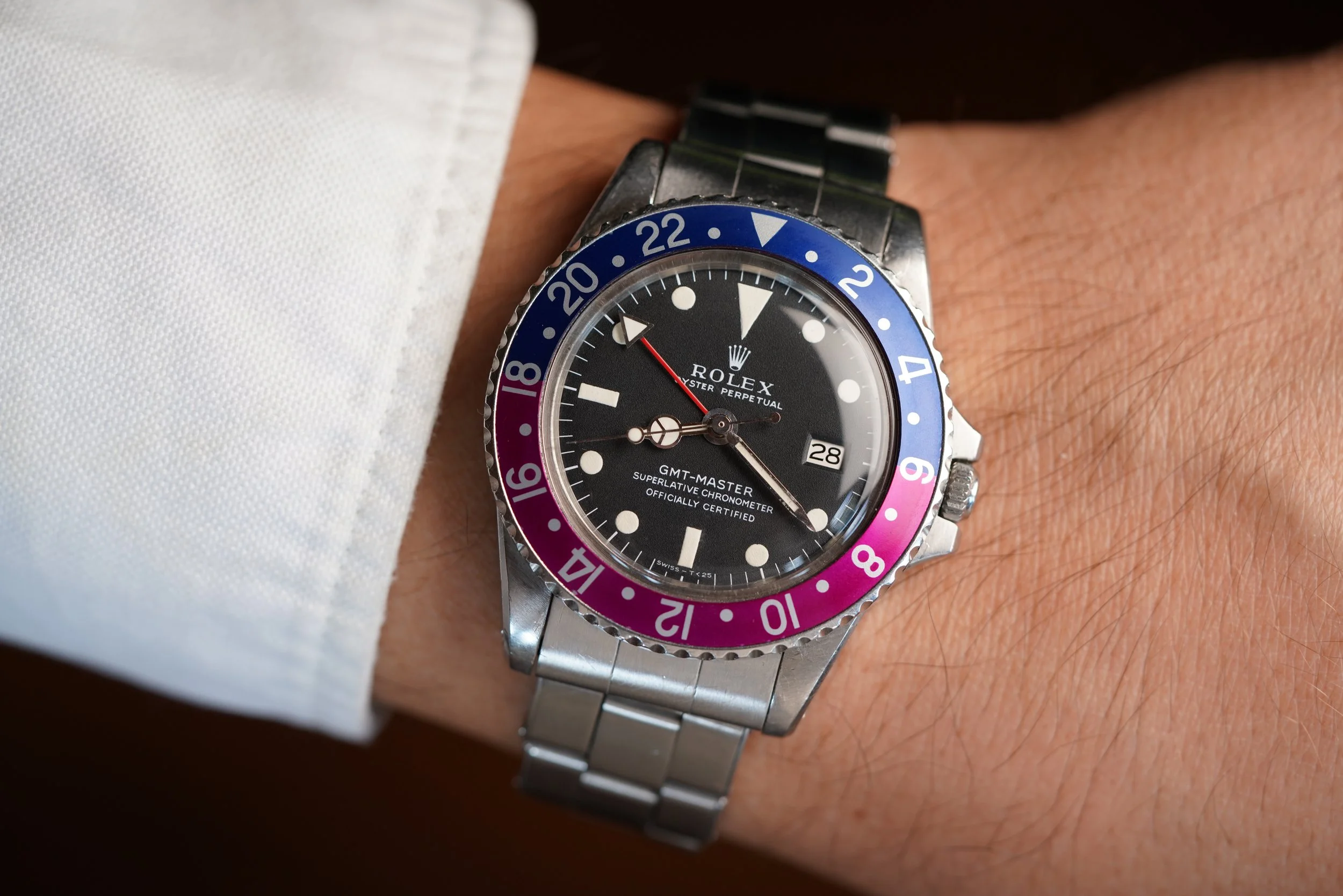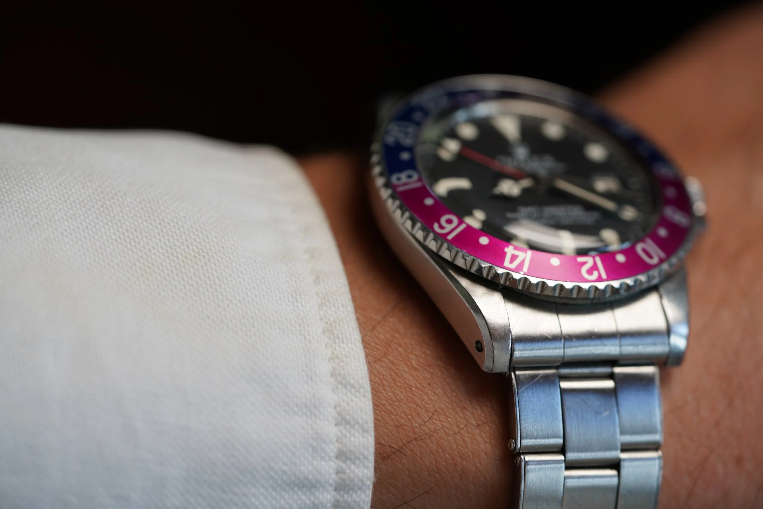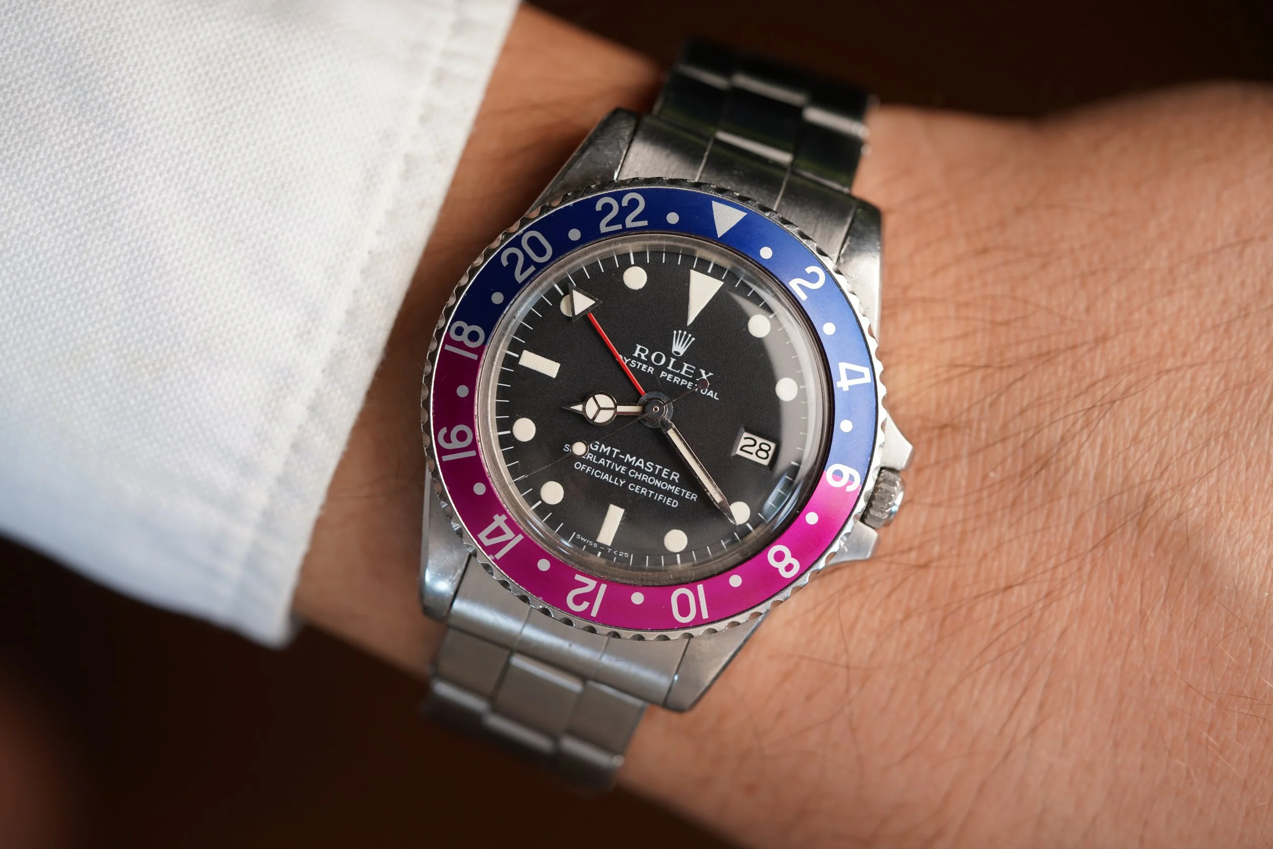This GMT-Master reference 1675 features a 1.705M serial number, dating to circa 1967. It features a slightly later Fuchsia insert. These bezel inserts were born on watches featuring 1.8M and 1.9M serial range from circa 1968-1969.
