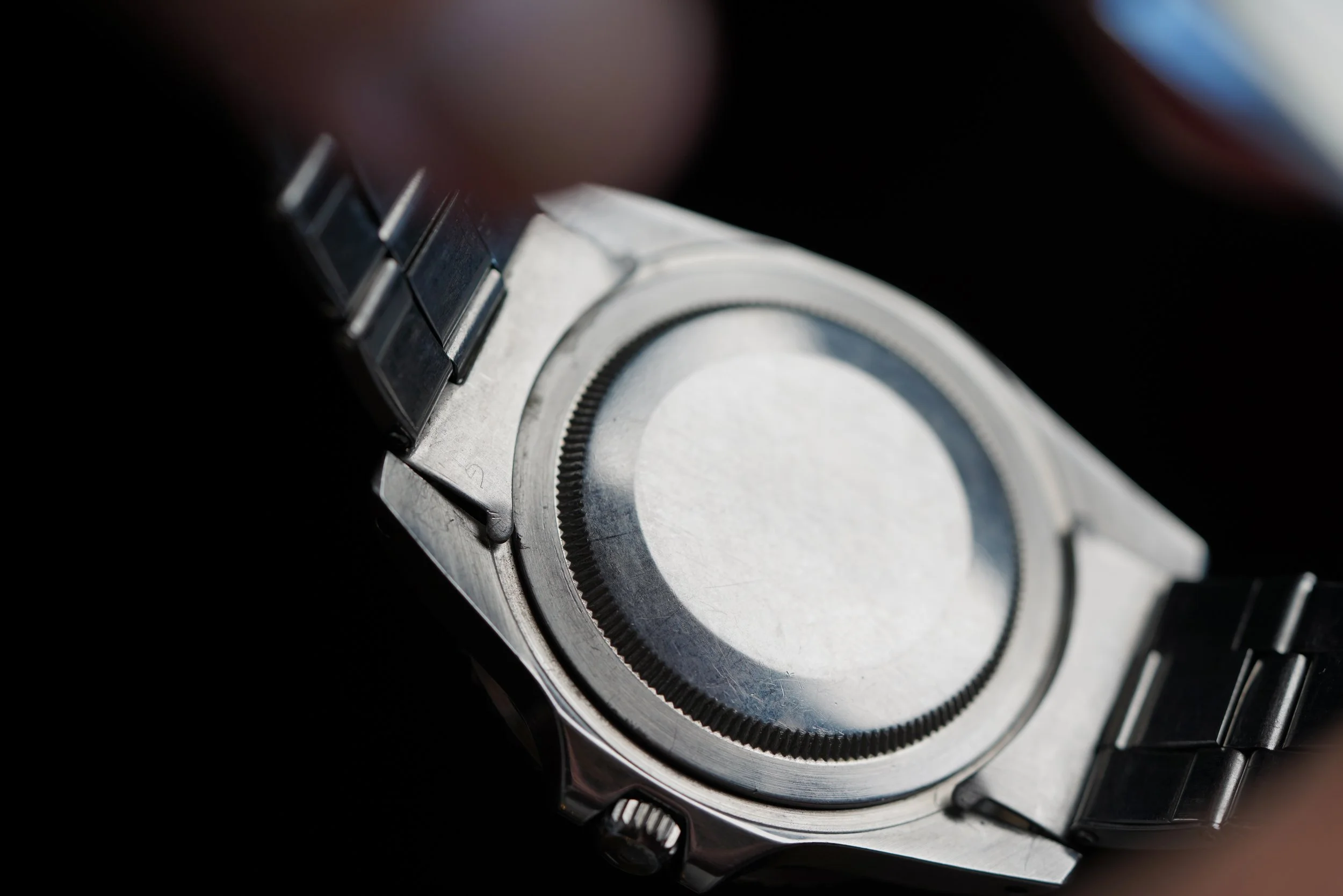 The case appears to be unpolished. The aluminum bezel insert is very attractive. It is paired on Rolex C&I stretch Rivet bracelet dating to 1968.