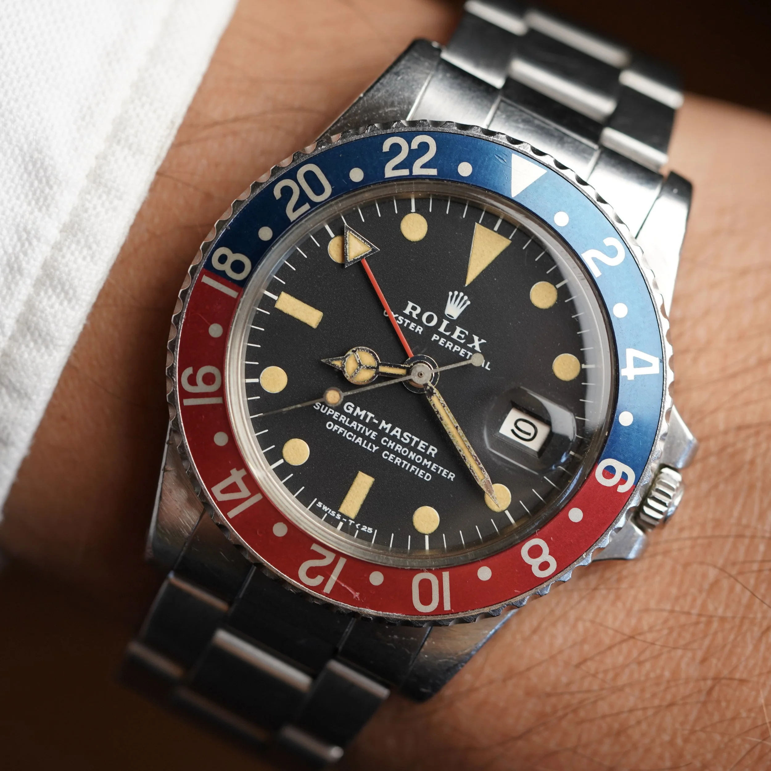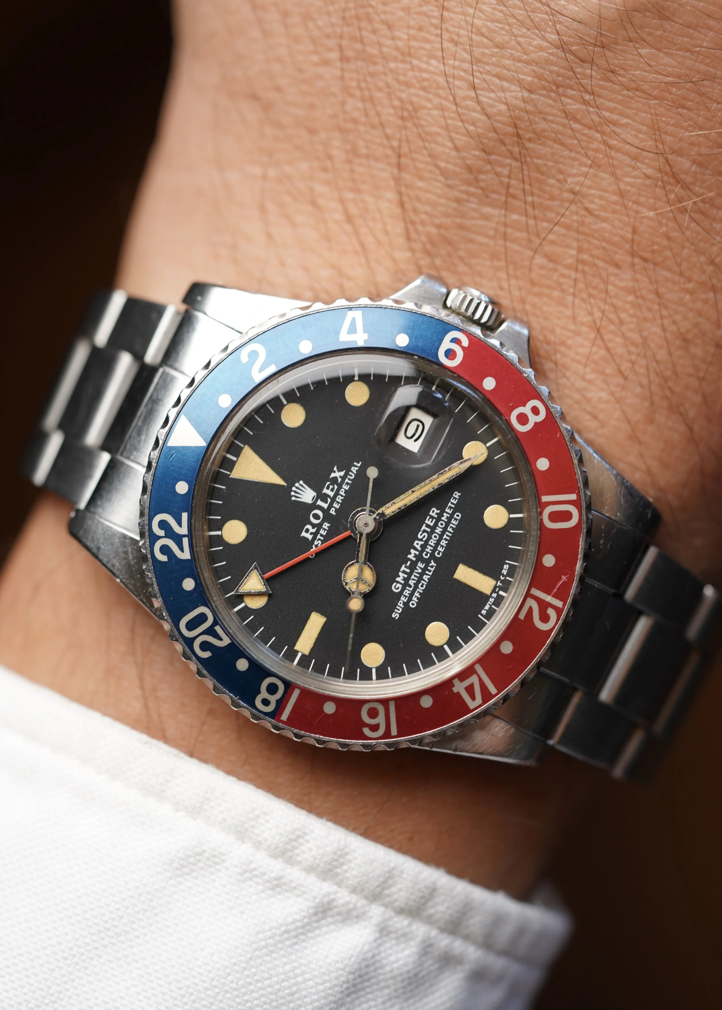 The Rolex GMT-Master was originally designed for Pan Am pilots in the 1950s and continues to be a flagship model for Rolex to this day. The reference 1675 was introduced in 1959 and remained in production until 1980.