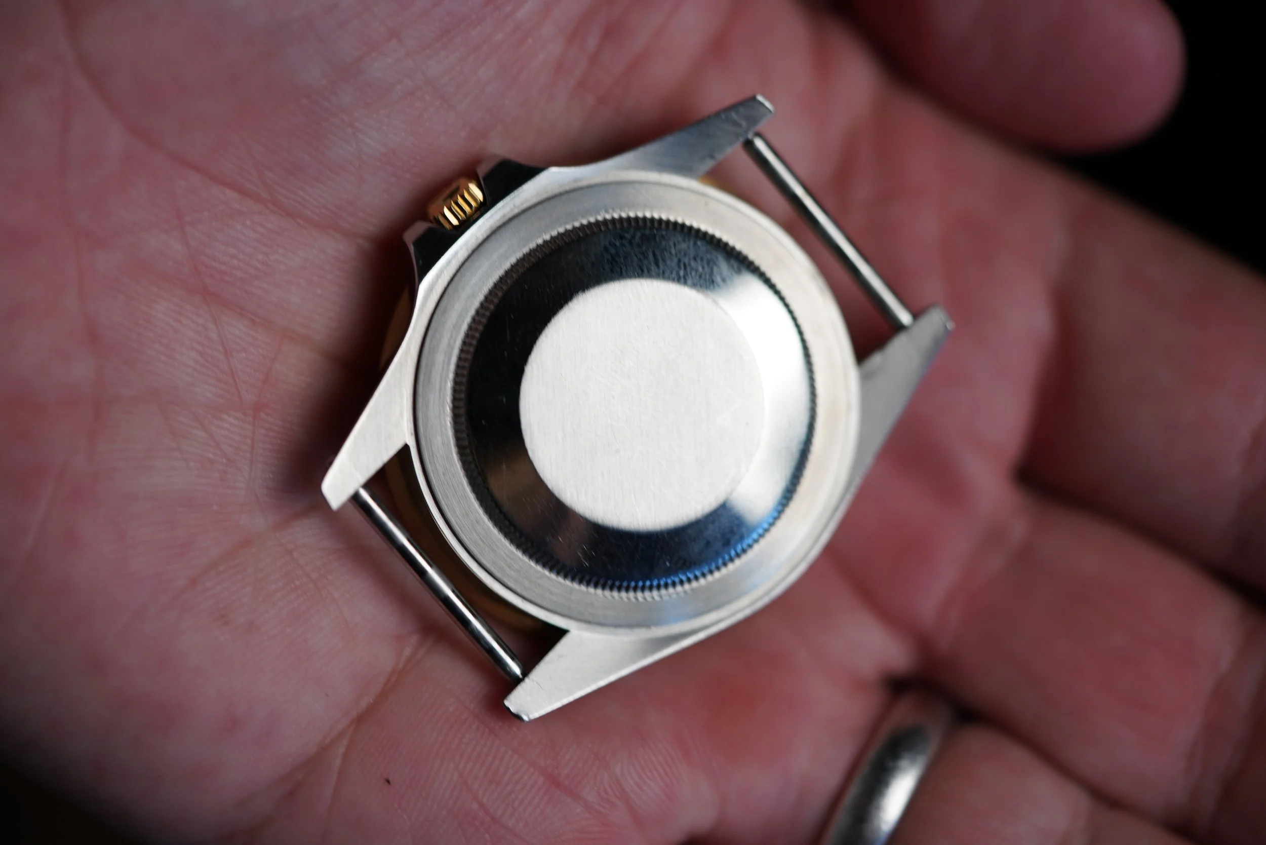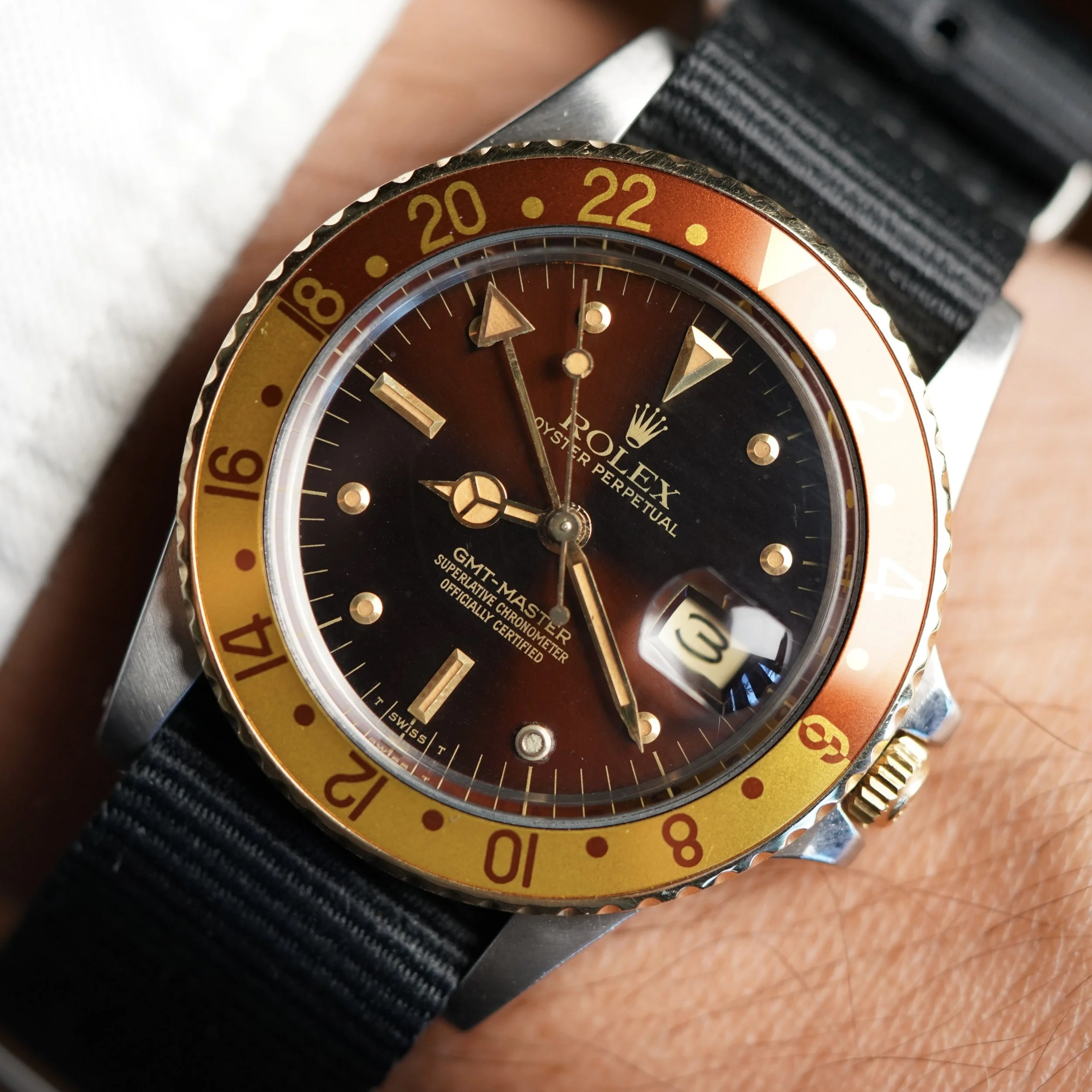 This Rolex GMT-Master reference 16753 is an awesome model which has become more appreciated by collectors in recent years. This example dates to circa 1986 with a 9.3M serial. The case has been polished. The dial is extremely attractive. It has a relumed 5 o’clock marker which is odd, but our colleague Gavin says “It’s 5 o’clock somewhere!” which we love! Perhaps that was the inspiration!.