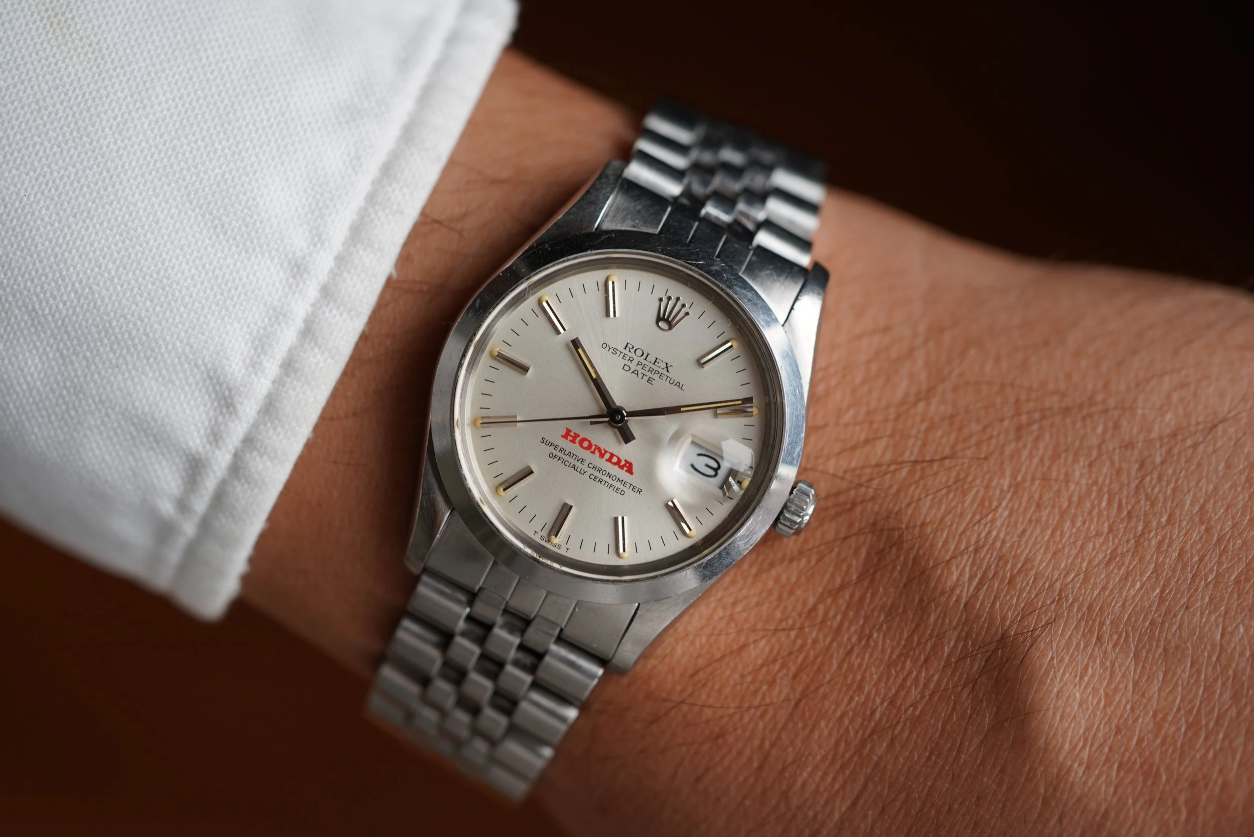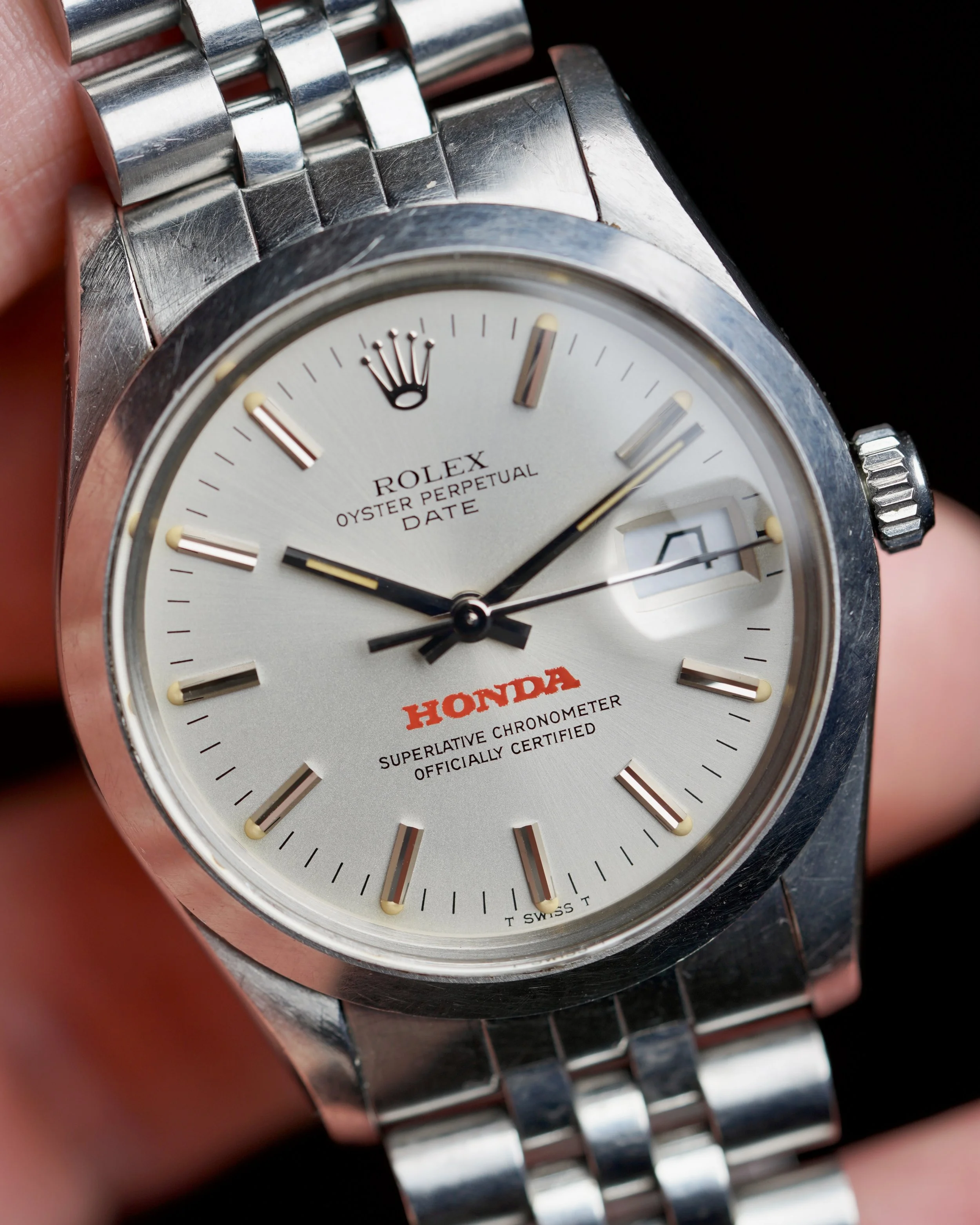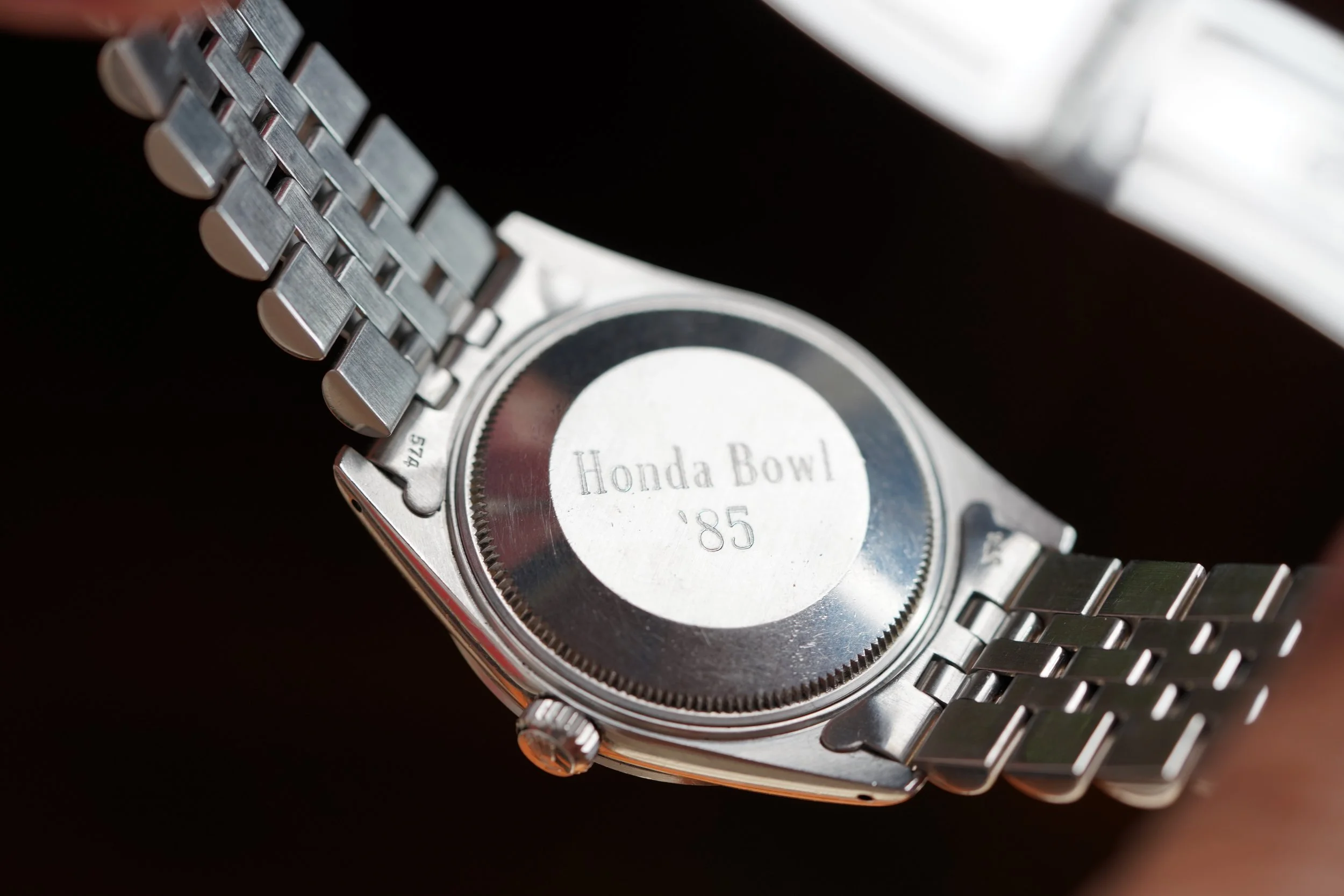 We’re incredibly excited to offer the fourth known Rolex Honda Date reference 15000 example. This example comes from the family of the original owner. The engraving on the back features the text “Honda Bowl Winner ‘85”. These watches were earned in sales competition from Honda dealers. The watch is 34mm wide (with a lug-to-lug length of 42mm). The lug width is 19mm and the height is 12.5mm including the crystal. The watch is powered by the calibre 3035, and features a quickset (indicative of the 5-digit reference). The case serial number is 7.5 million dating to circa 1984. It features an I bracelet code from late 1984.