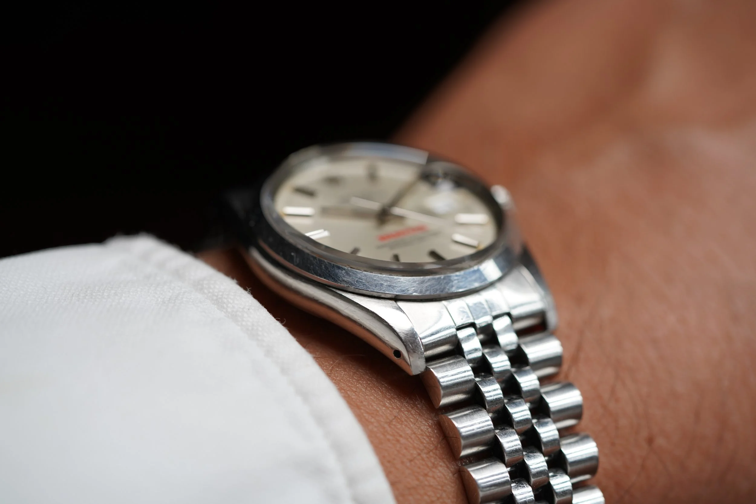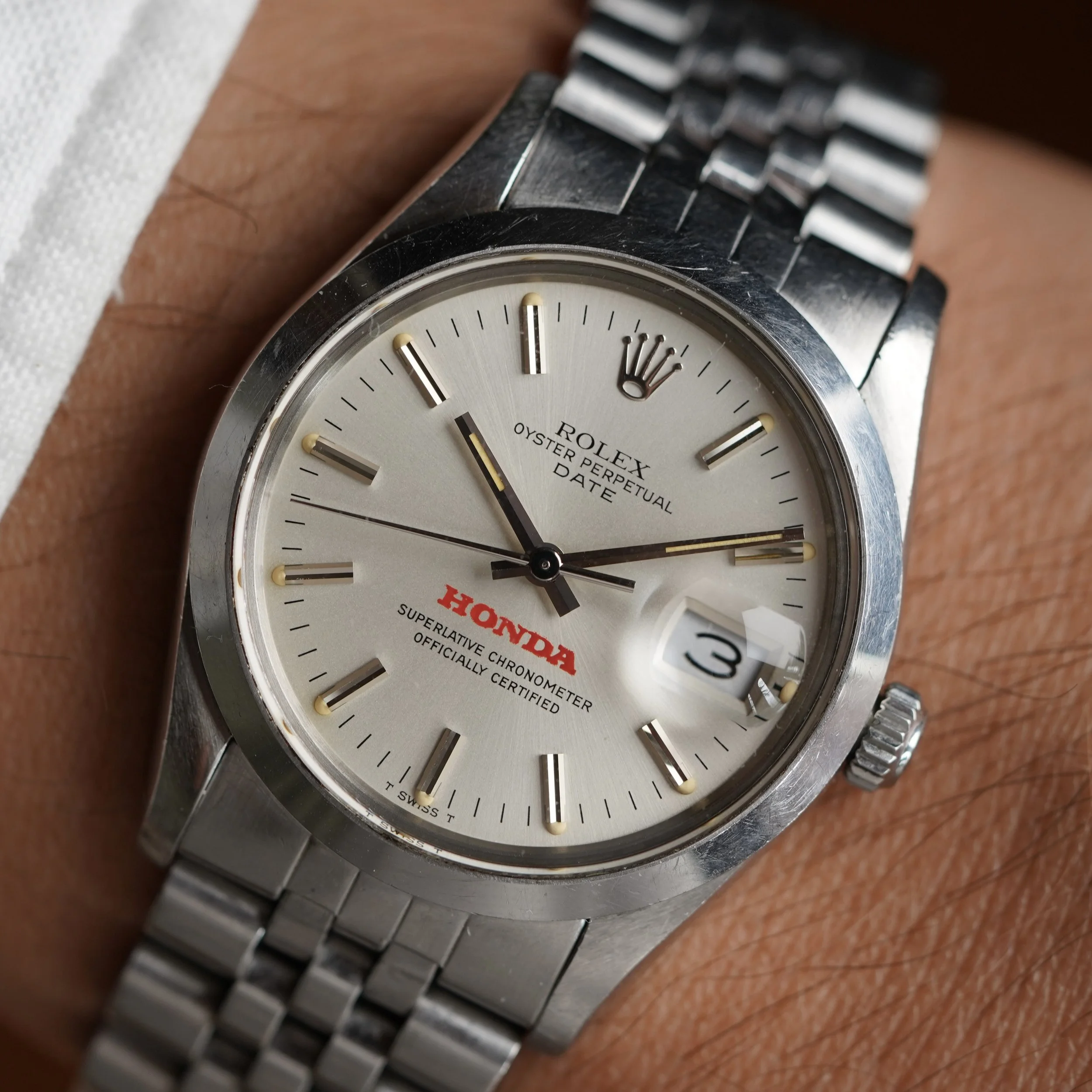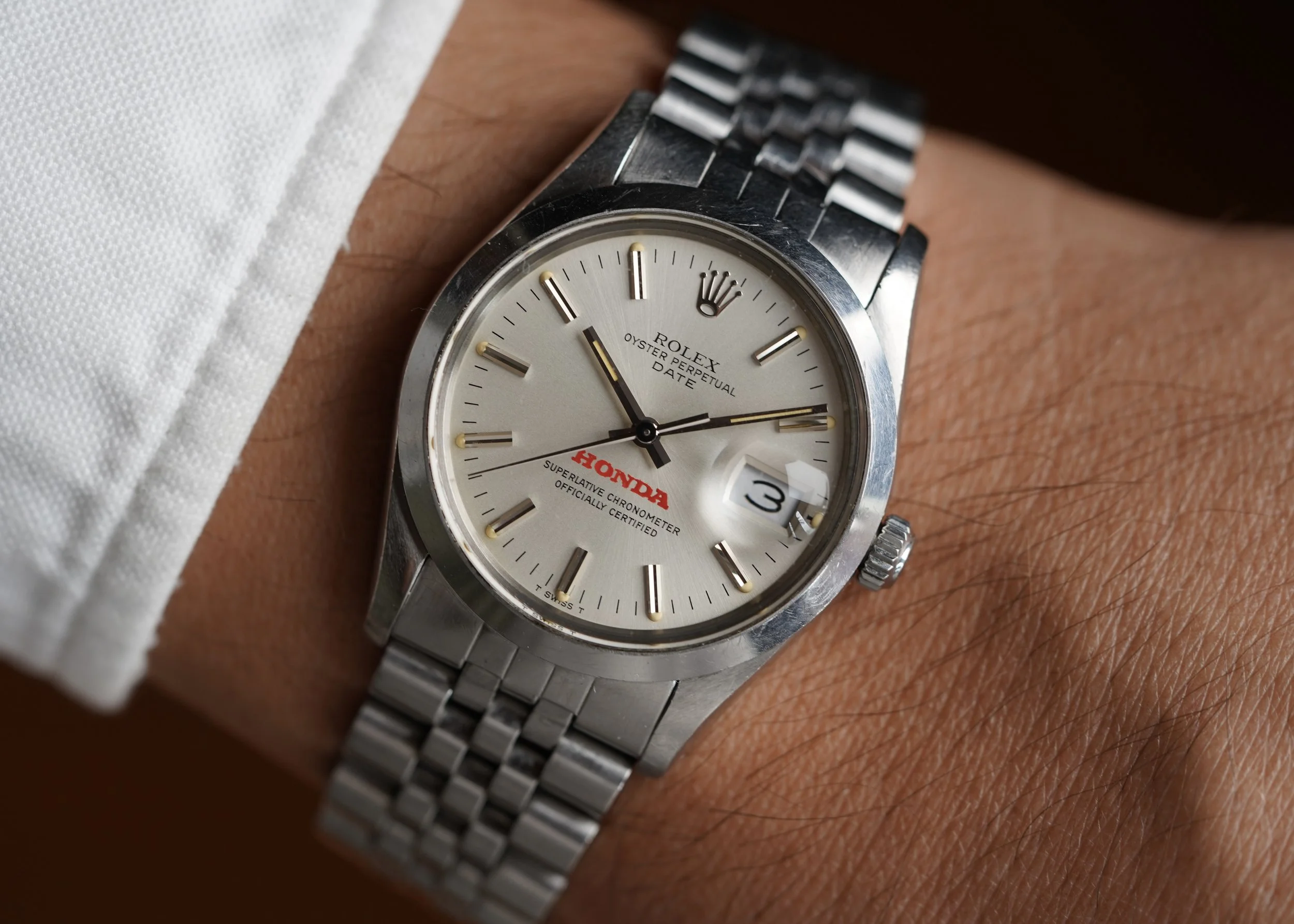 We’re incredibly excited to offer the fourth known Rolex Honda Date reference 15000 example. This example comes from the family of the original owner. The engraving on the back features the text “Honda Bowl Winner ‘85”. These watches were earned in sales competition from Honda dealers. The watch is 34mm wide (with a lug-to-lug length of 42mm). The lug width is 19mm and the height is 12.5mm including the crystal. The watch is powered by the calibre 3035, and features a quickset (indicative of the 5-digit reference). The case serial number is 7.5 million dating to circa 1984. It features an I bracelet code from late 1984.
