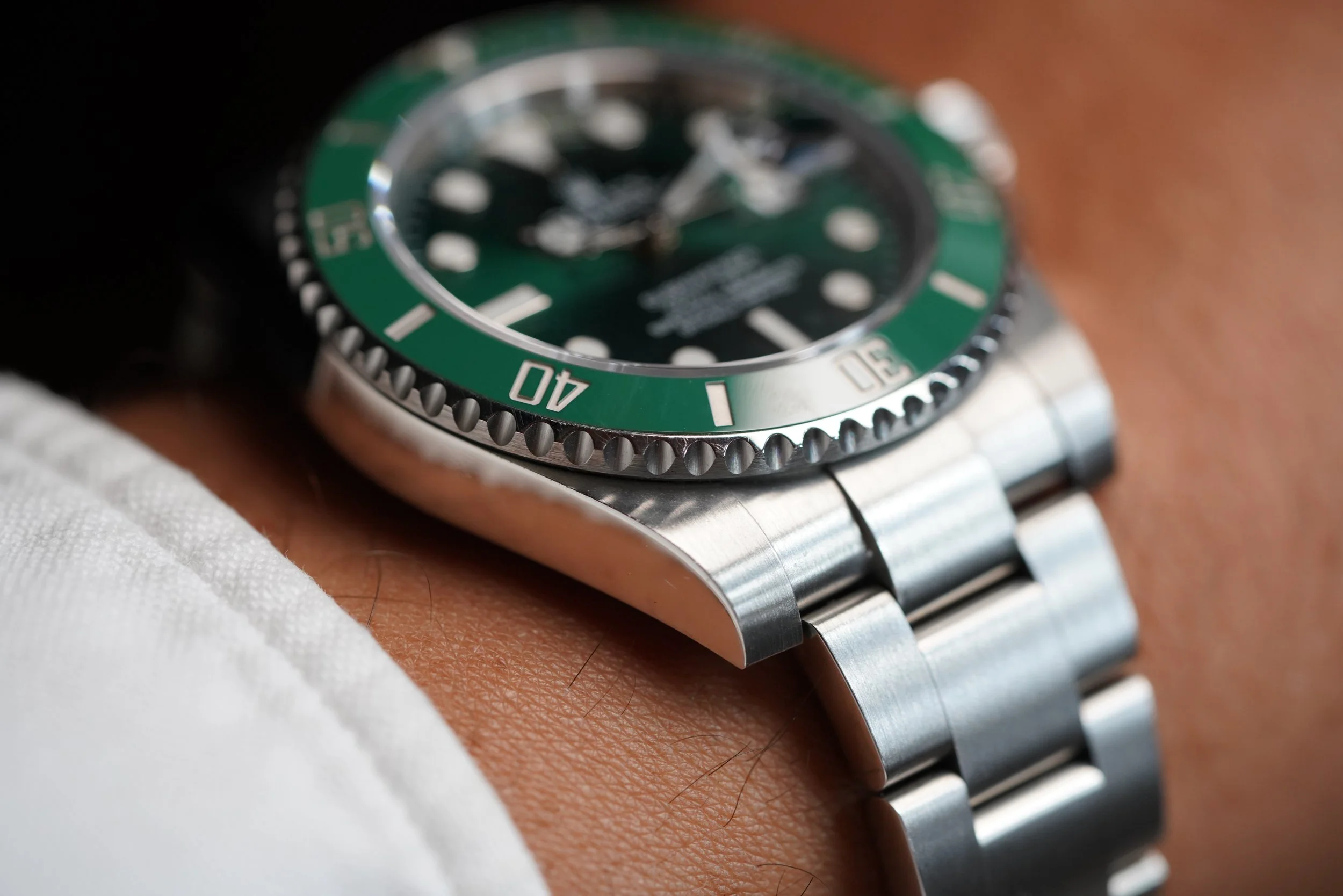 This Rolex Submariner reference 116610LV is an awesome sports watch. We believe the case is unpolished. For those looking for a sick Submariner, the Hulk is a great option. It is an epic green dial and green bezel Rolex that screams “MONEY!” ‘Money’ by Pink Floyd is a fantastic song with a great bass line.