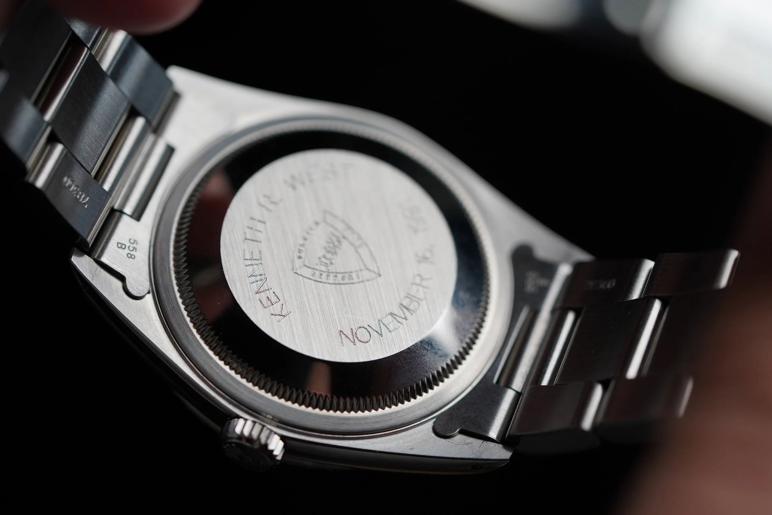 The watch is in excellent condition. The caseback features the former owner’s name engraved with his employer’s (IBM) logo. It was received by the employee in 1991. The case has been lightly polished.